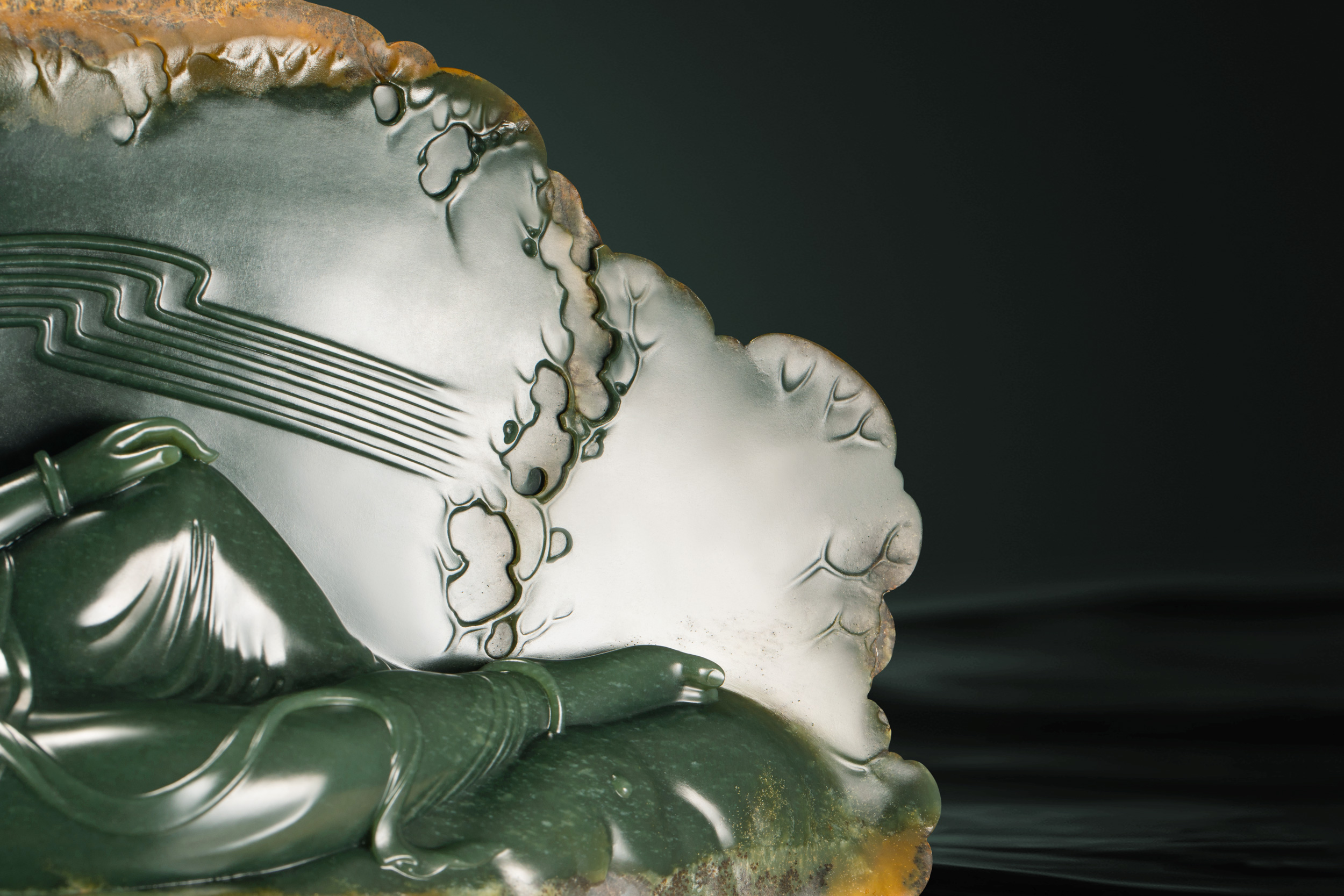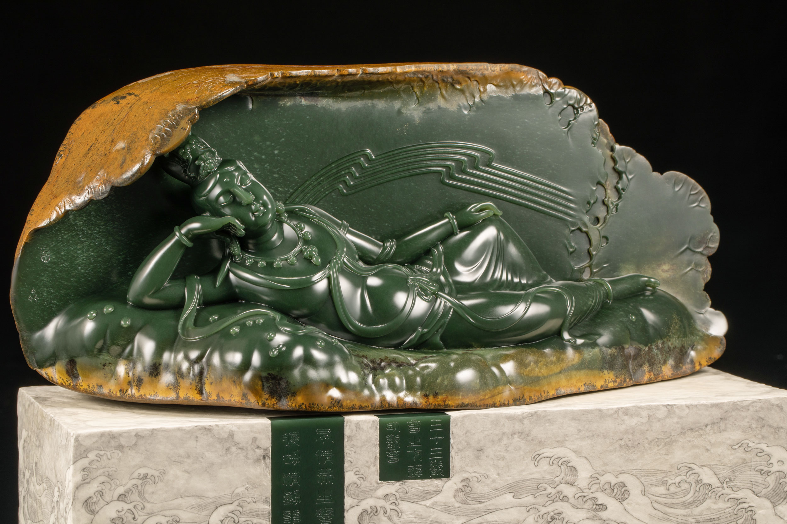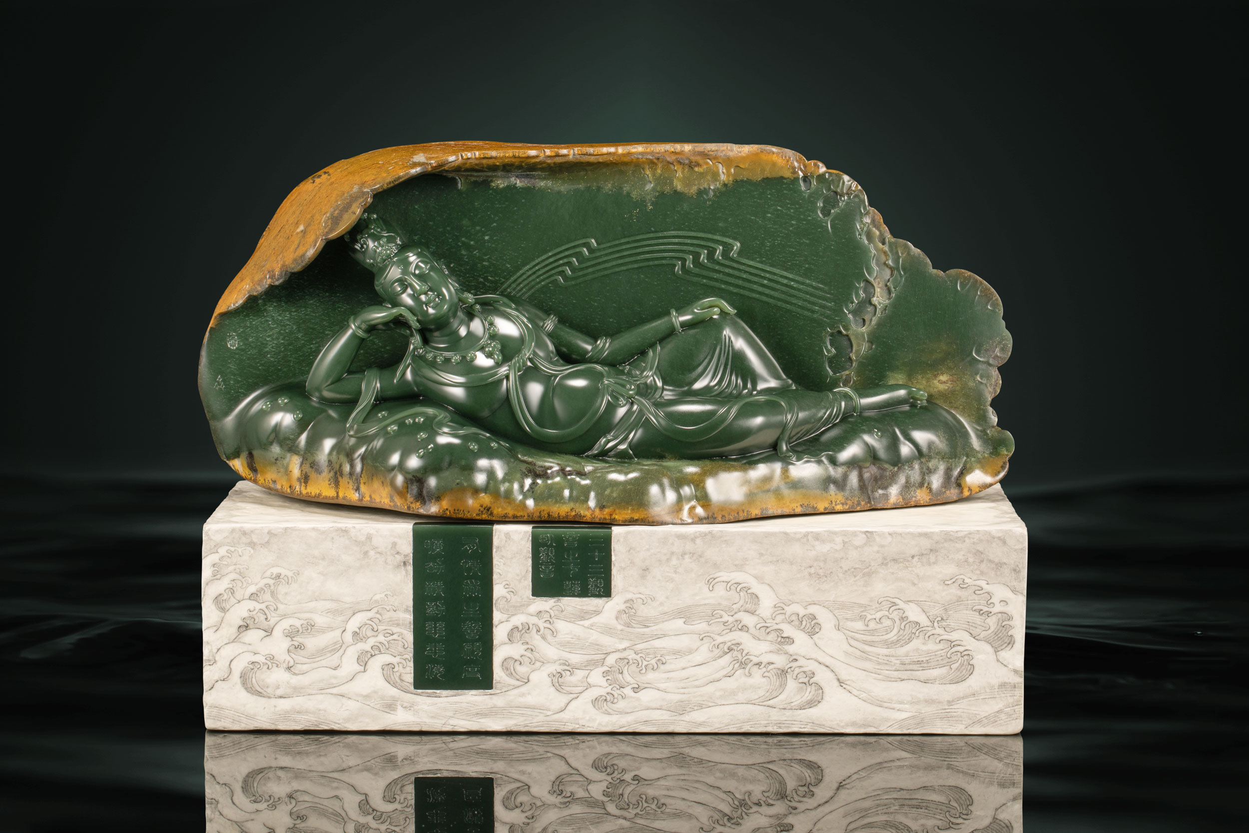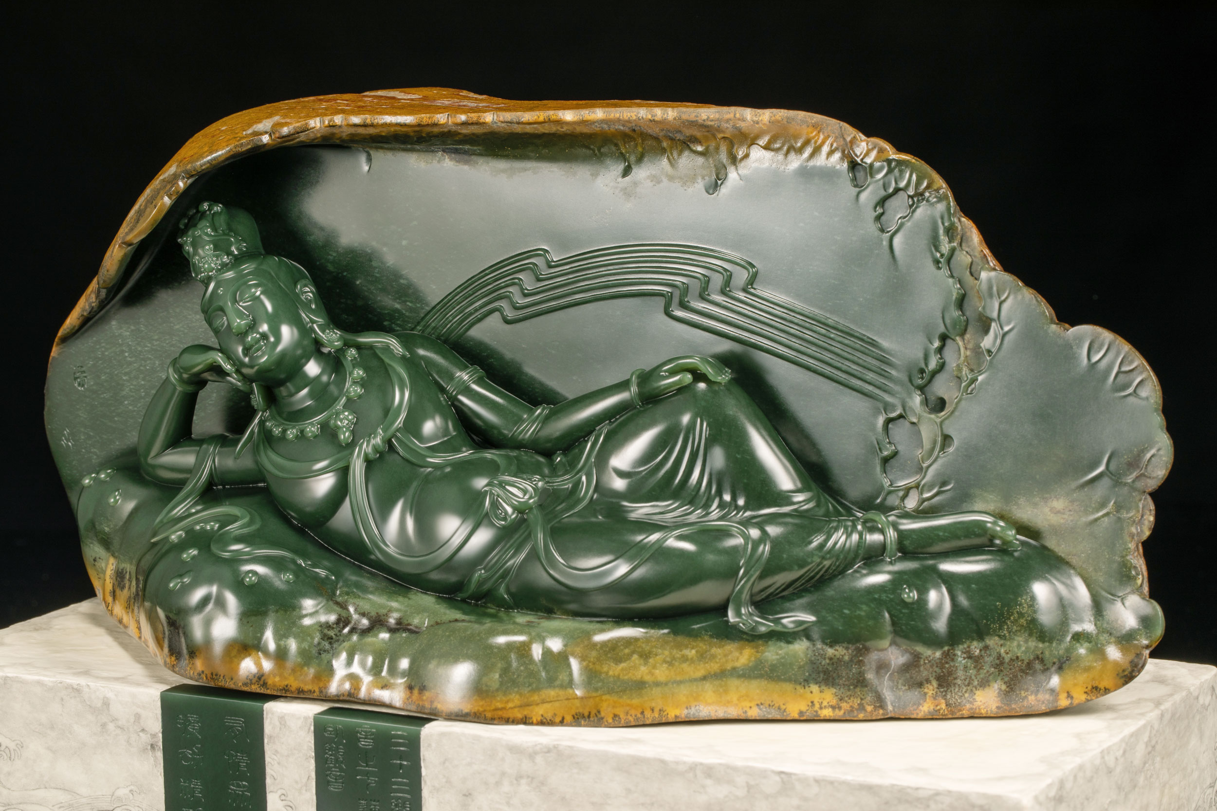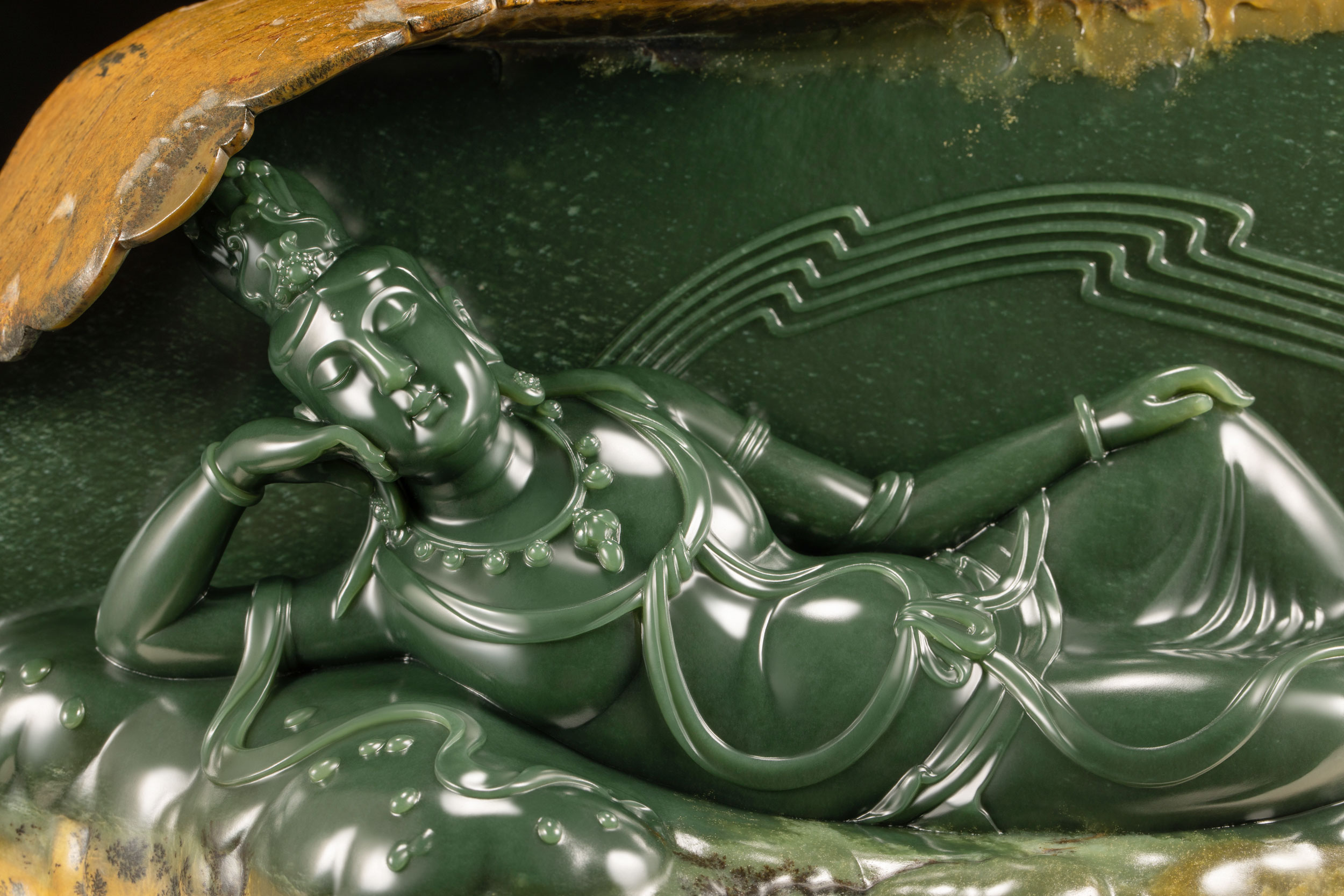我们可以看到,那由浓醇绿色玉肉化作的素洁荷叶,与作者要塑造的主体形象——莲卧观音,似乎融成了一体,难分彼此,观照了观世音菩萨乃莲花化现、自性清净无所染之意。
