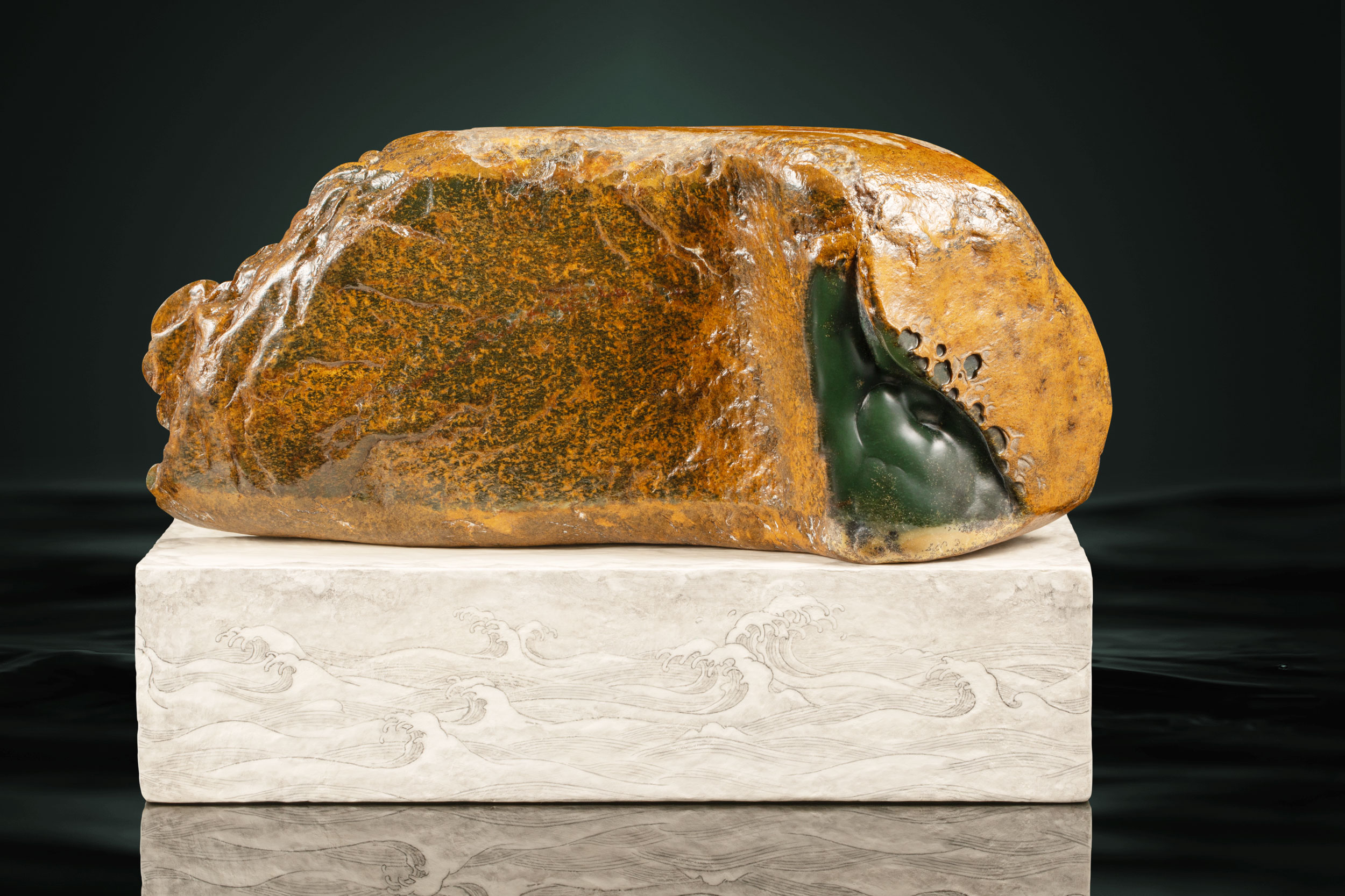 他将玉料一面的金褐色皮,作了大面积保留,并在不同的位置上塑造莲叶的自然脉络,形成叶片相触而环抱的抽象外观,别添一分天然之美。
