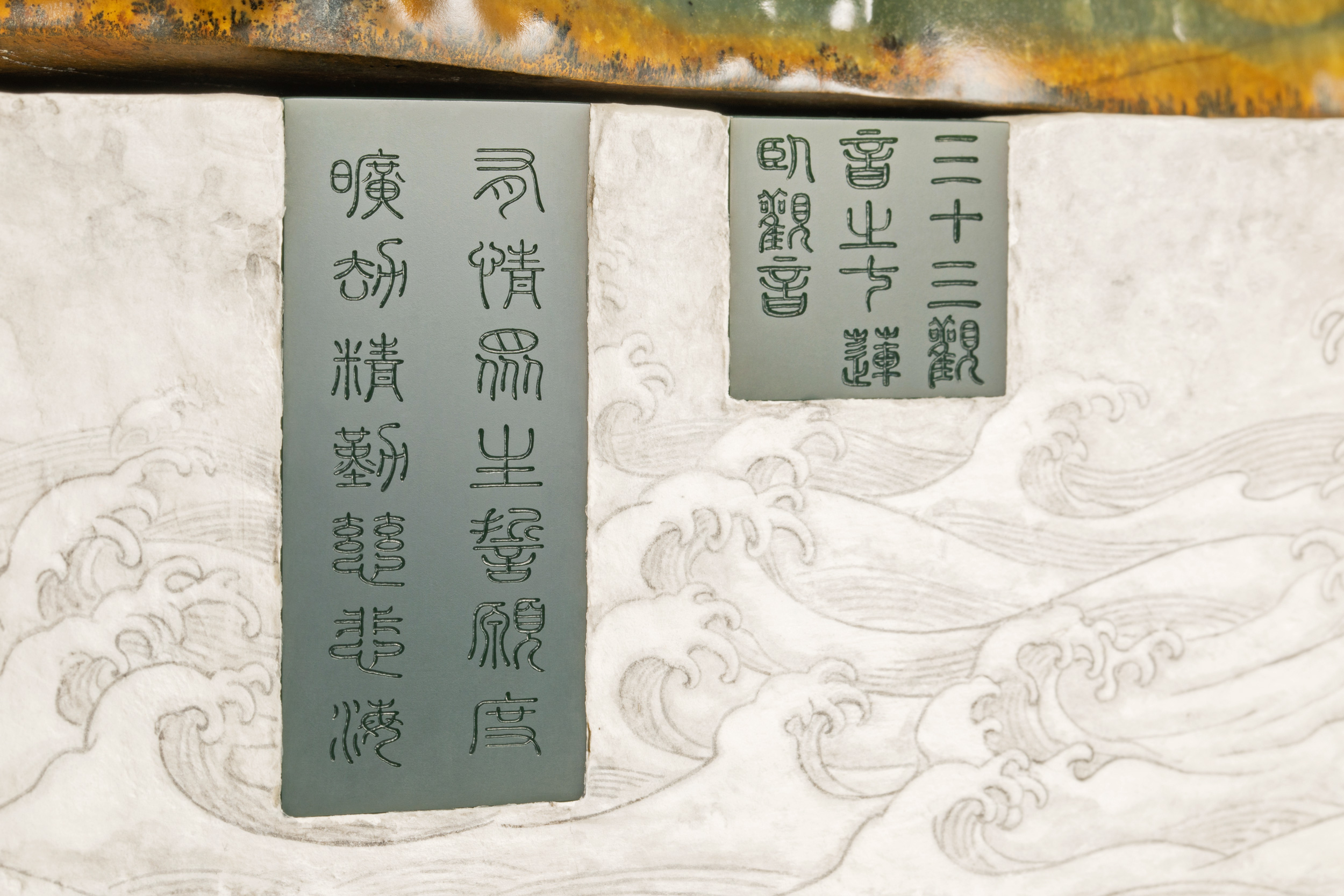 作者还给作品配置了色彩清逸、气质古朴的底座。底座原木,涂上纸浆,线描动势极强的浪花,于正面嵌一长一方两块玉料,并以篆文呈现“三十三观音之七莲卧观音”和“有情众生誓愿度,旷劫精勤慈悲海”,既是为作品提款识,又与作品交相辉映,共融为一体。