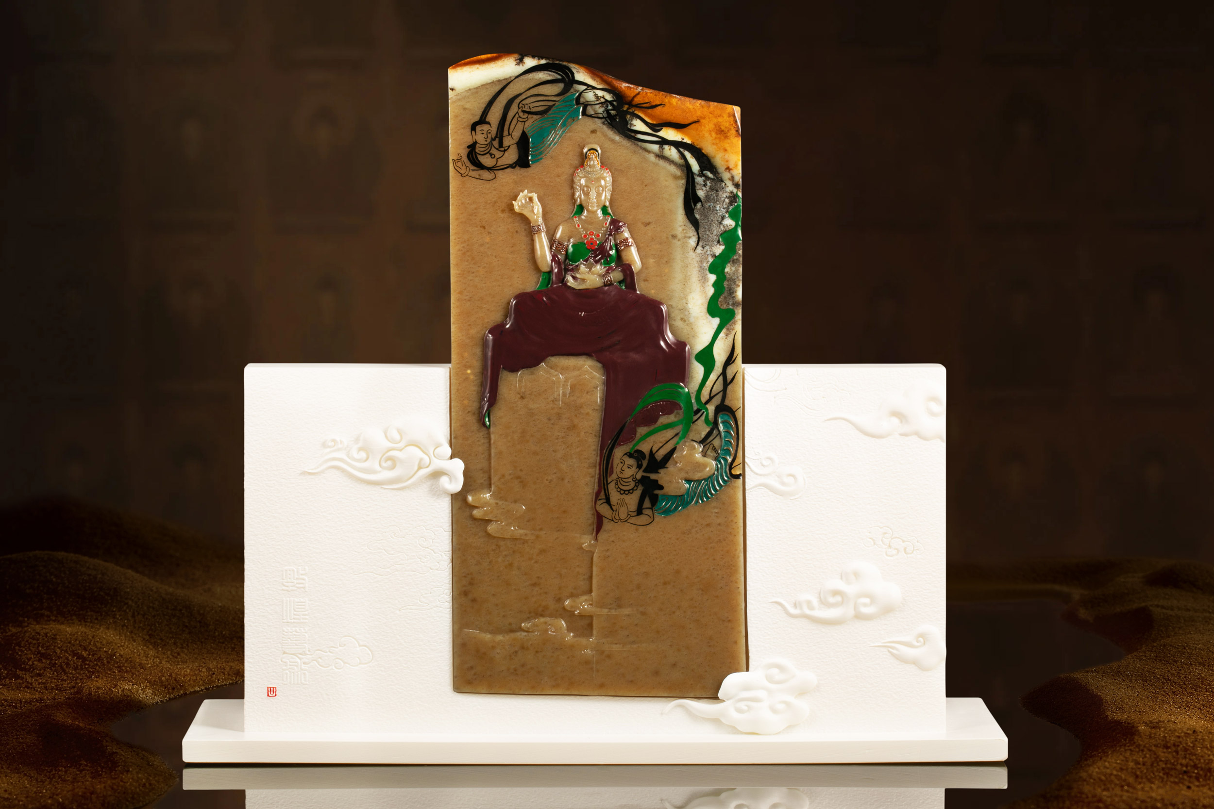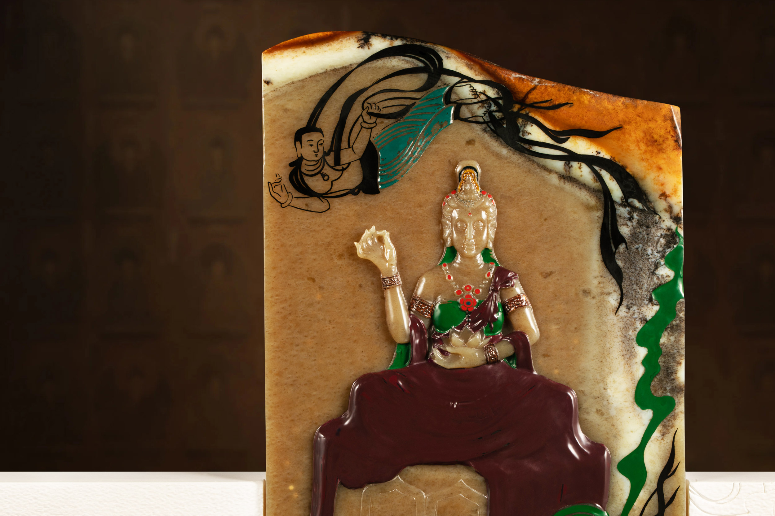 中国玉石雕刻大师刘忠山,从千年画壁中汲取养分,获得灵感,以一块有金艳色皮的析木玉糖料,呈现令人惊艳的佛国秘境,传承艺术之美。