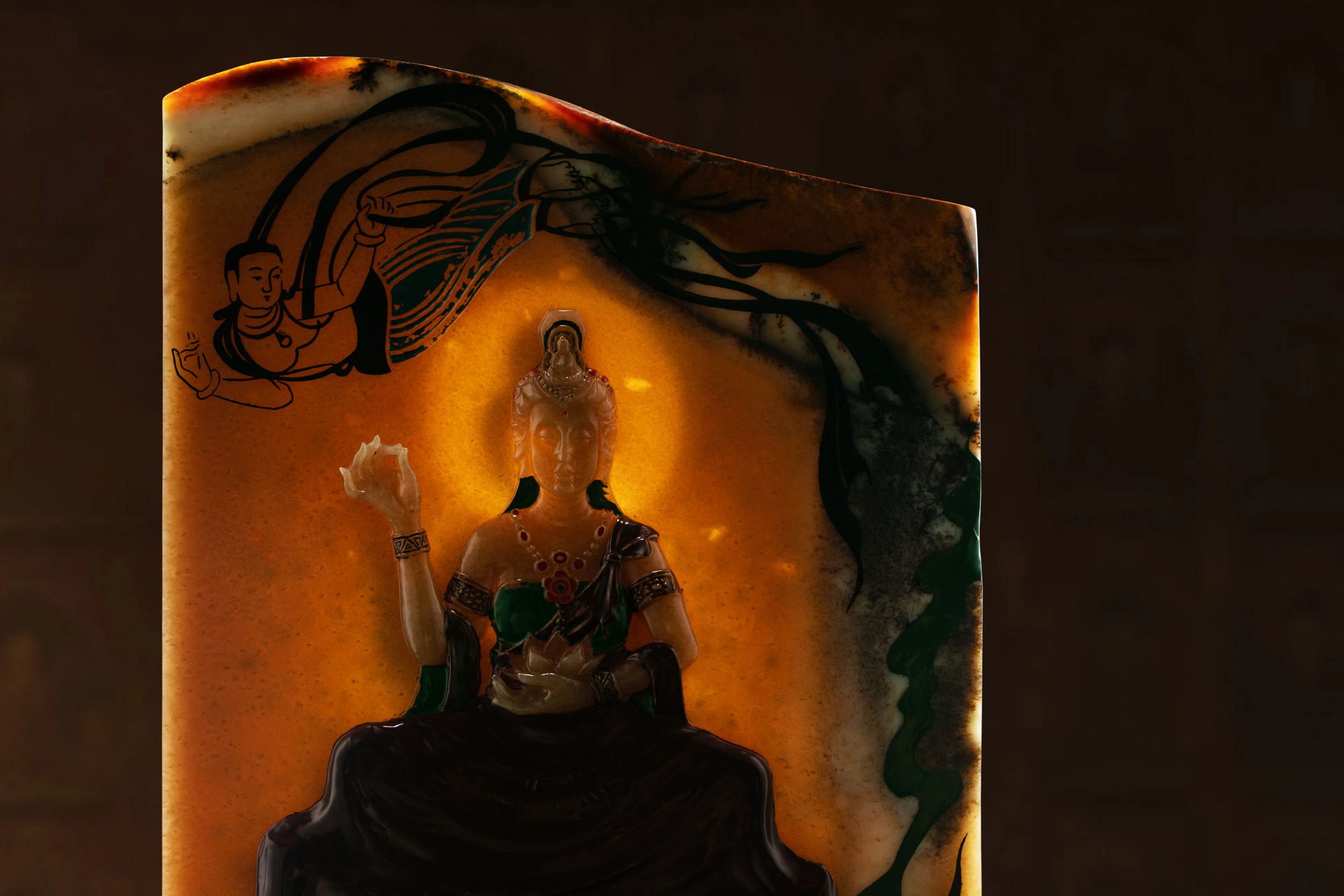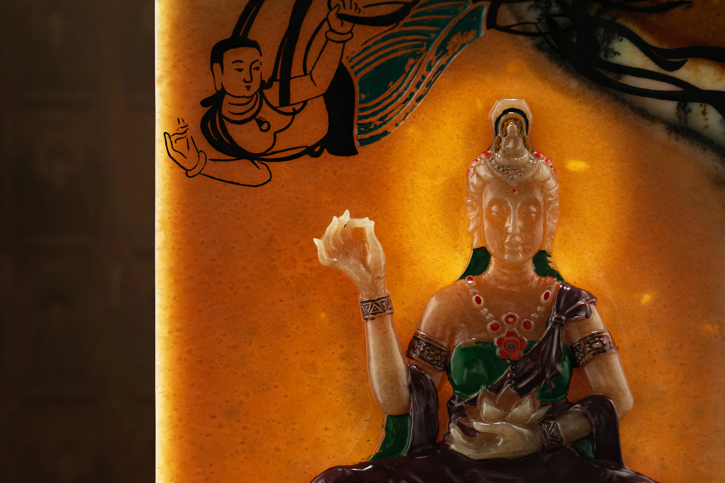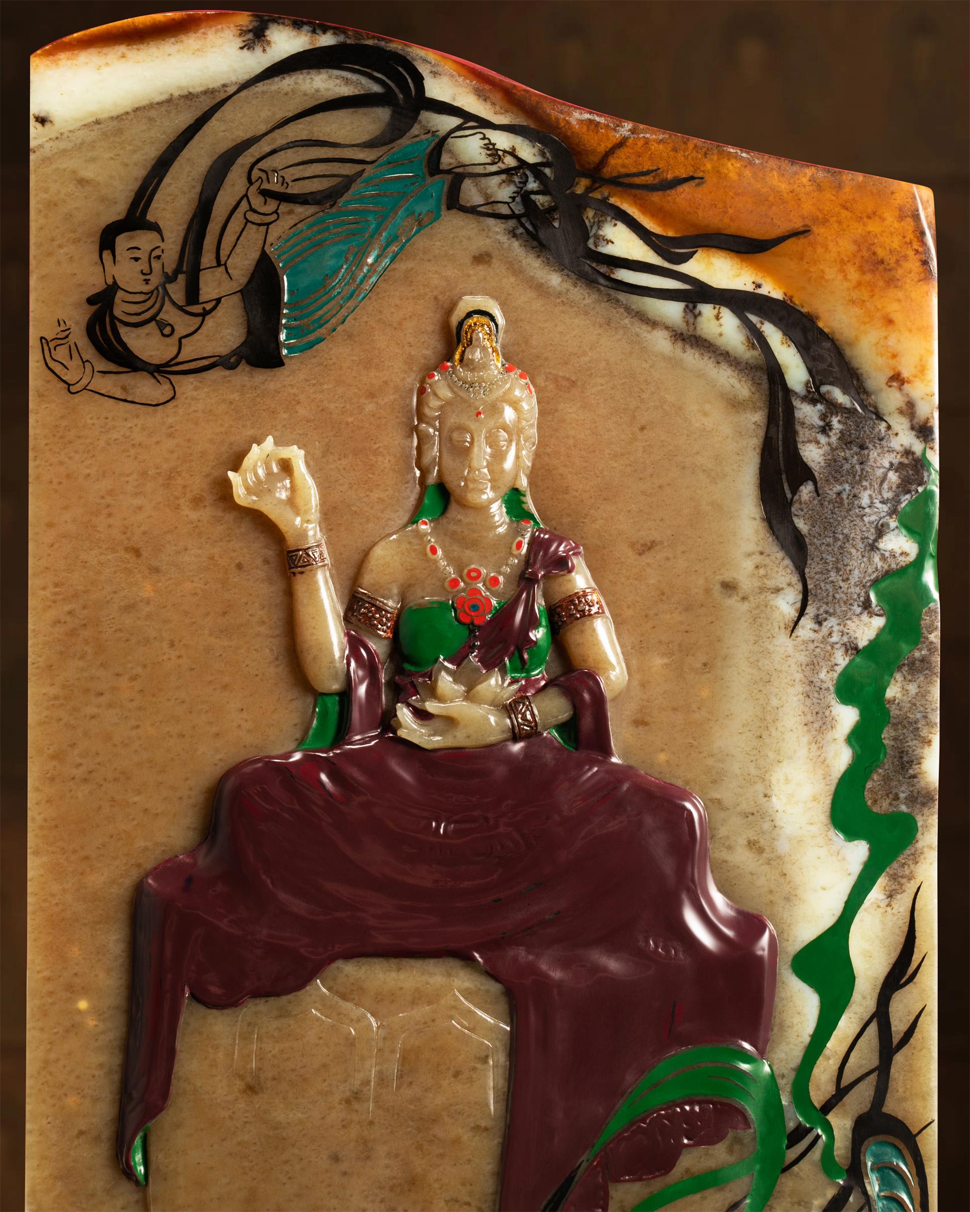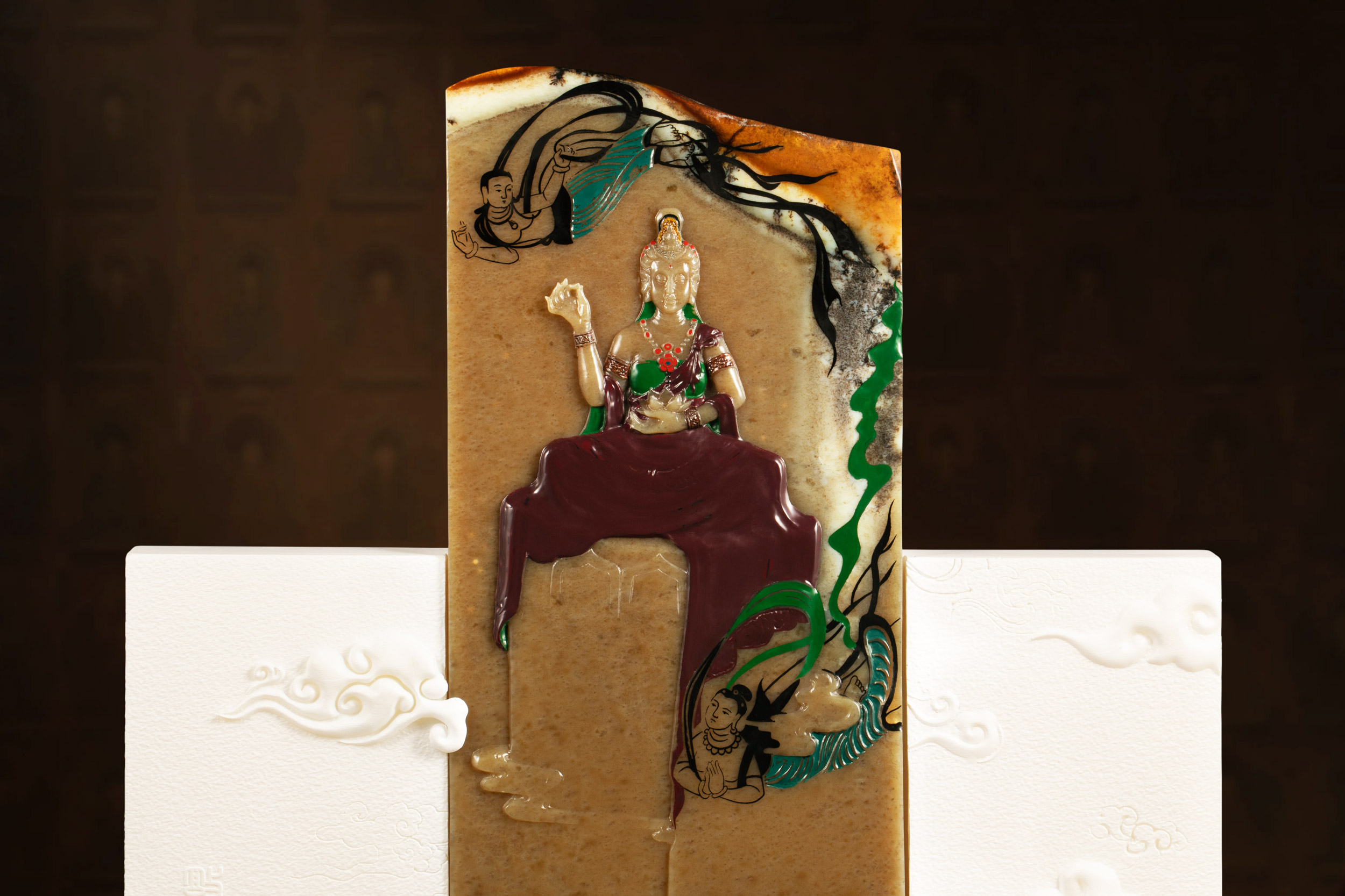 观音以深浮雕技法呈现,开相曼妙、端庄、安详、娴静;造型雍容、华贵、高古;色彩浓艳、雅致、鲜靓。