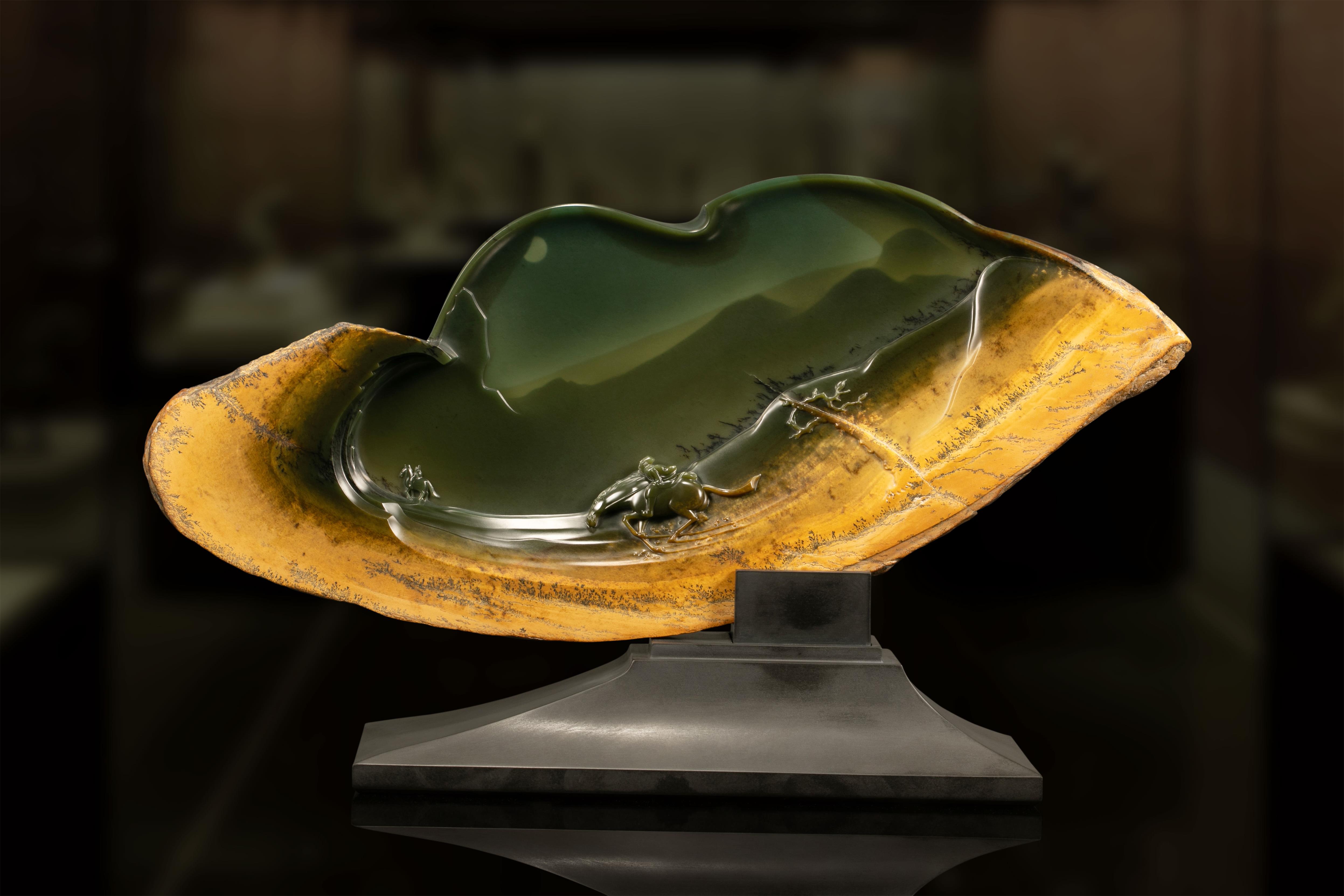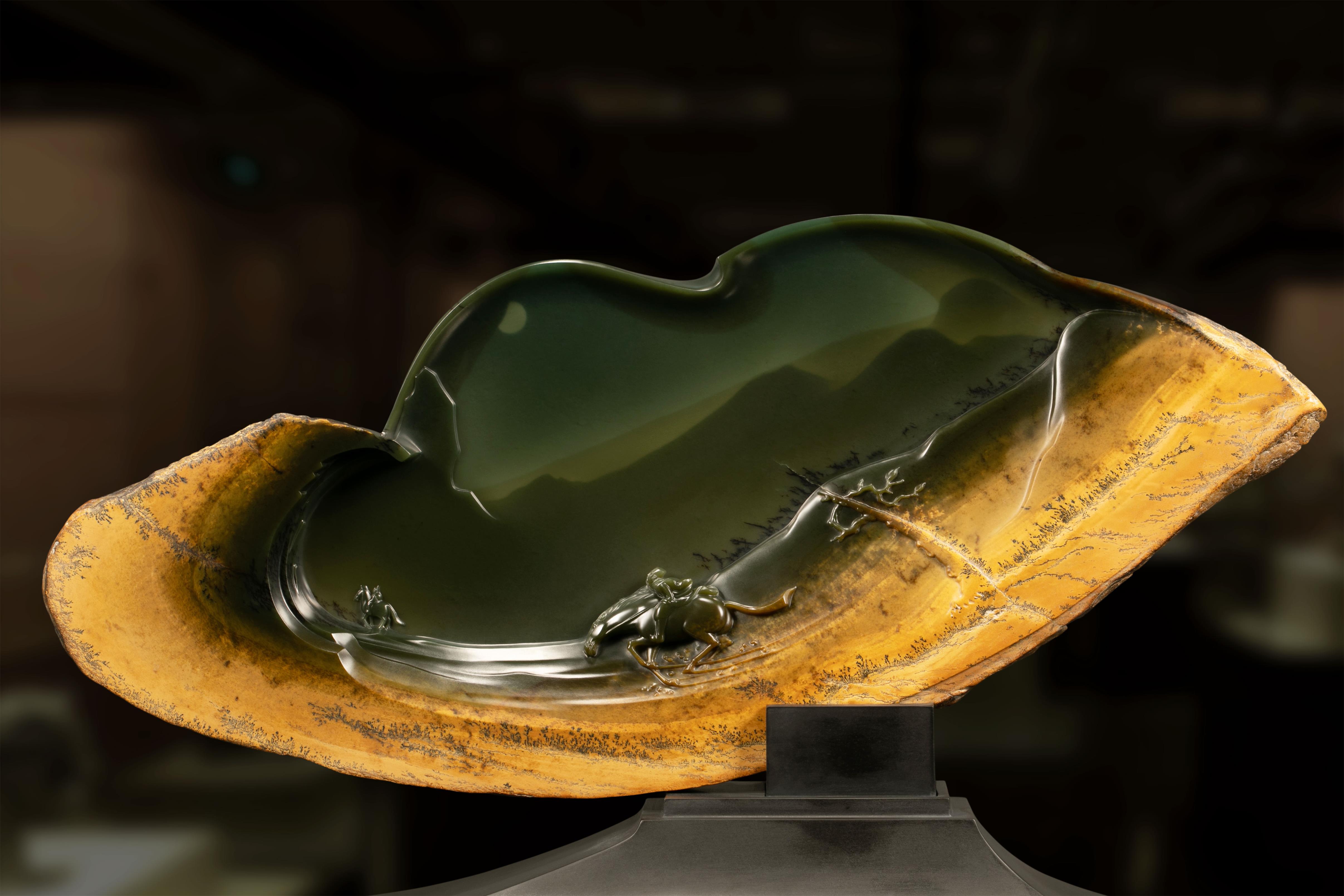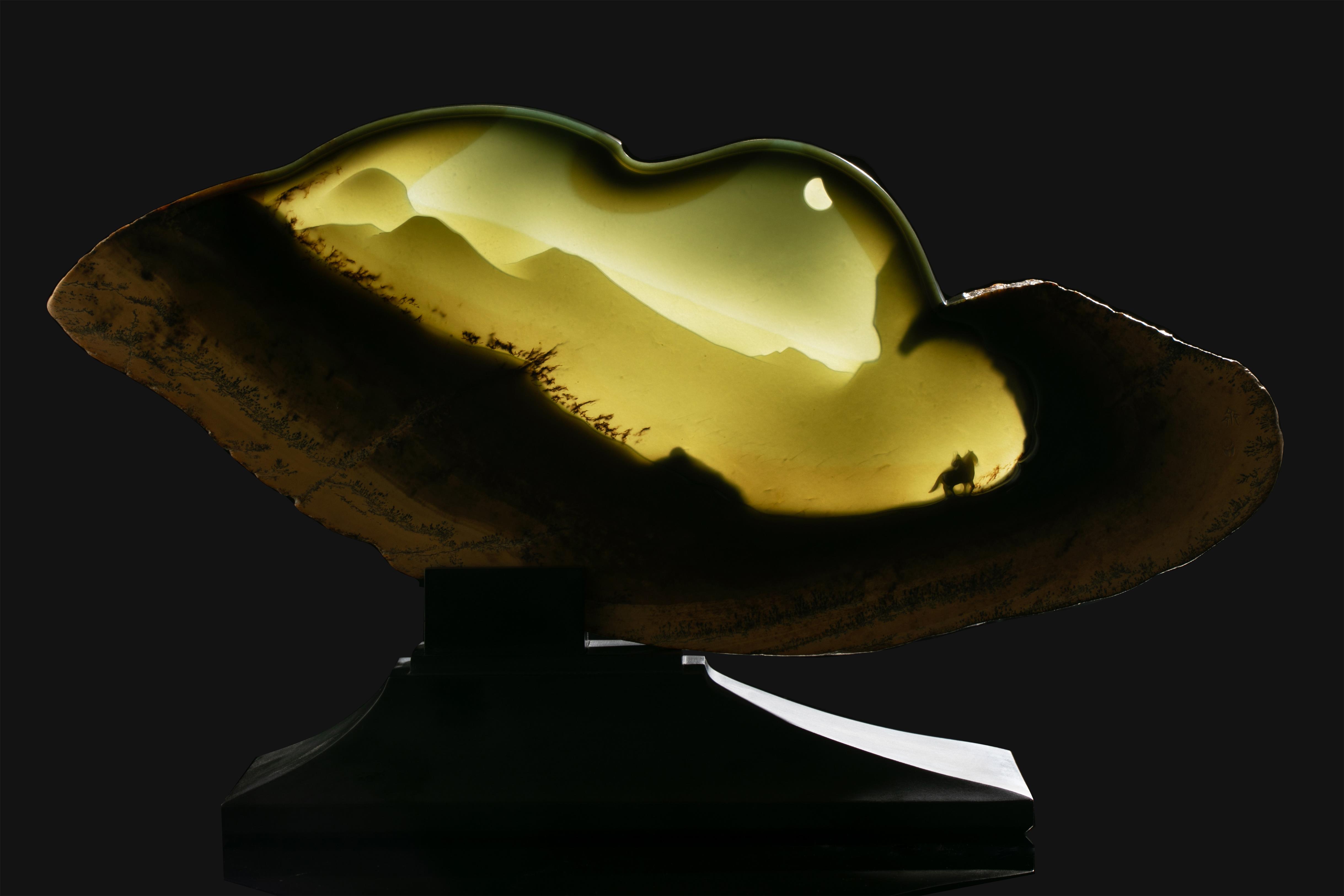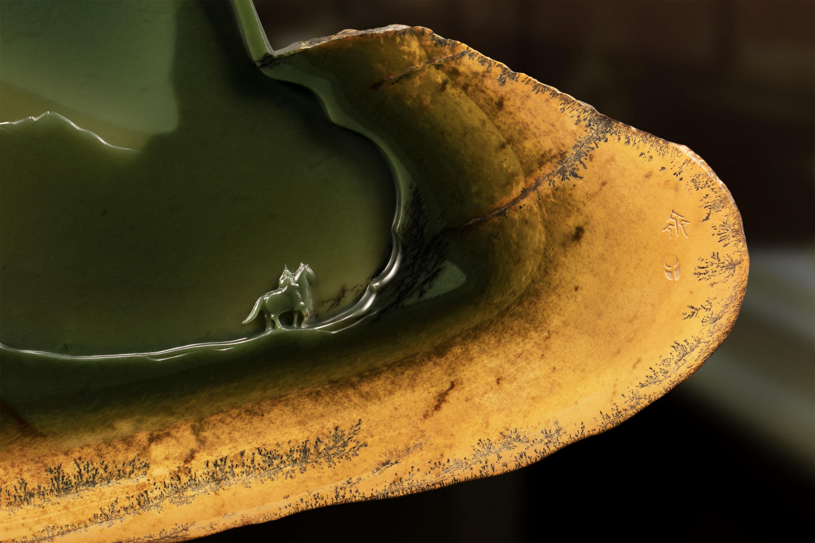 作者大体保留了玉皮,只依其上方不规则的料形去皮,并赋予它青葱起伏的山峦形廓,在一侧玉面雕刻绵延起伏的山脉和隐现在层峦叠嶂间的圆月、荒漠上孤独的骑士……