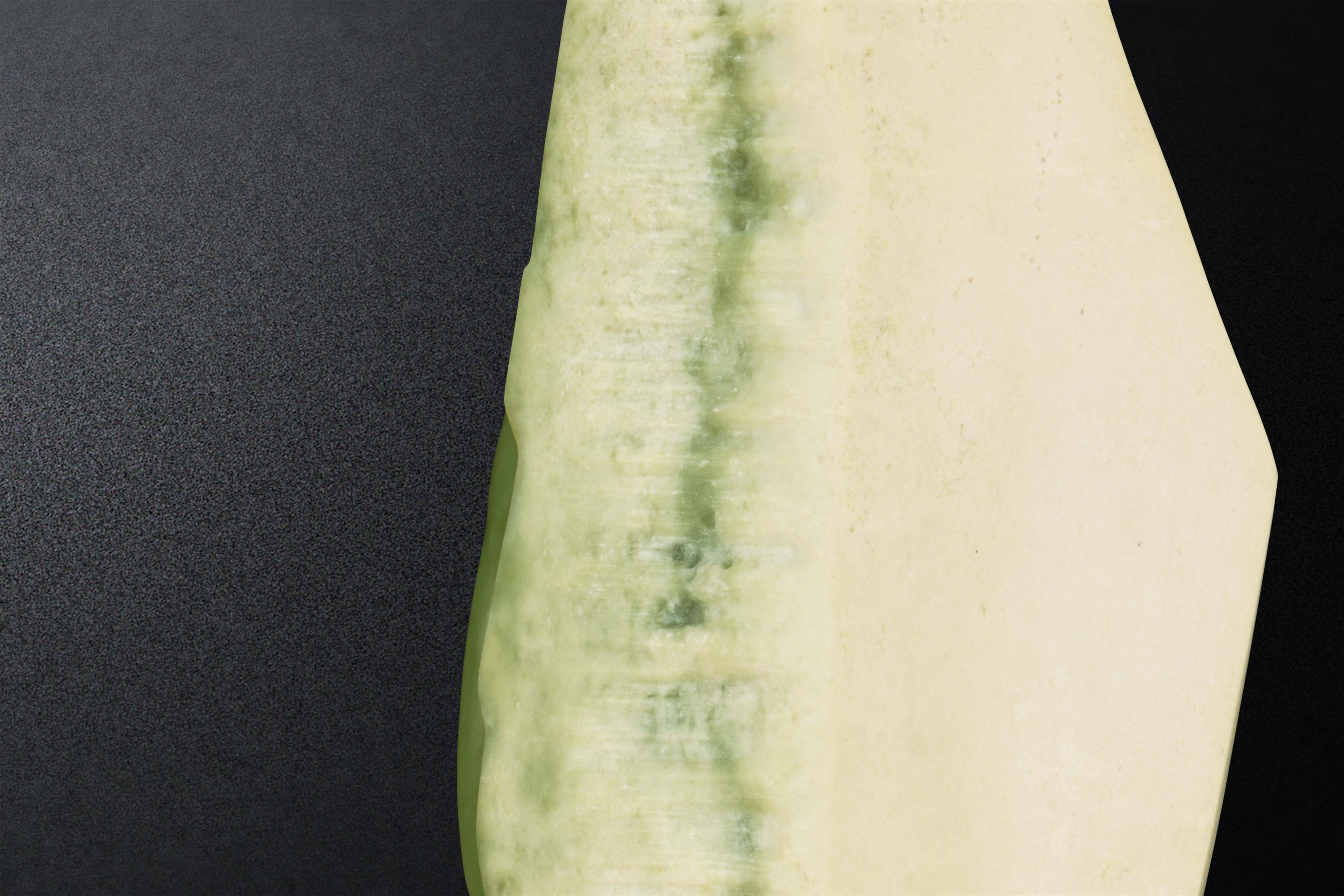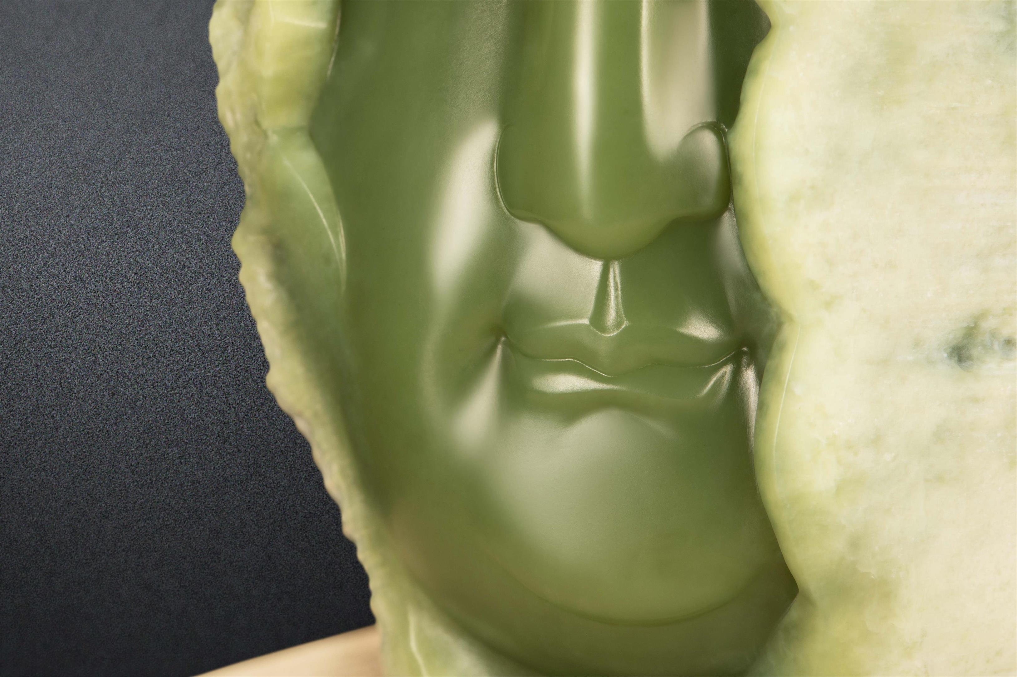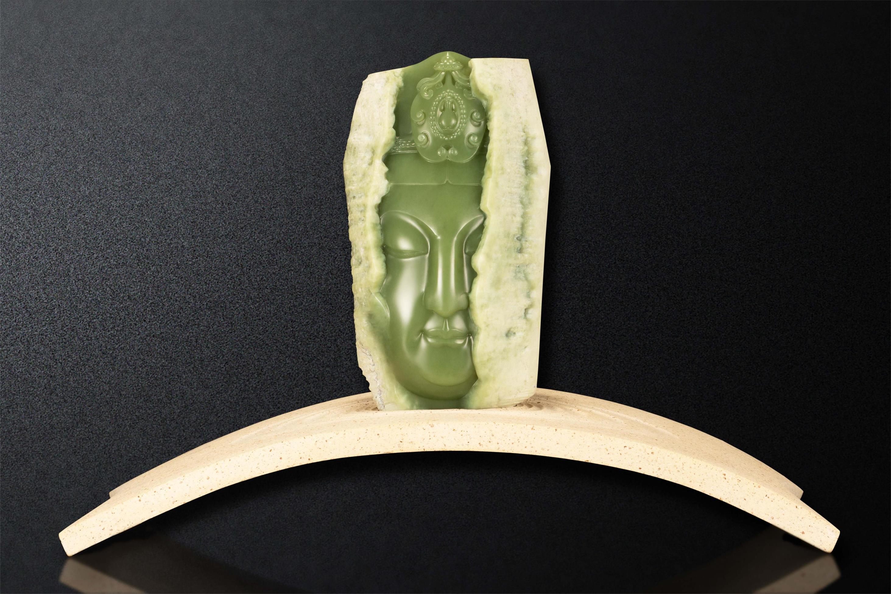 断面里裸露着玉肉,质地细腻无杂,色泽青葱有光,气度沉静温和,极为适合刻画神圣、庄严的观音像。