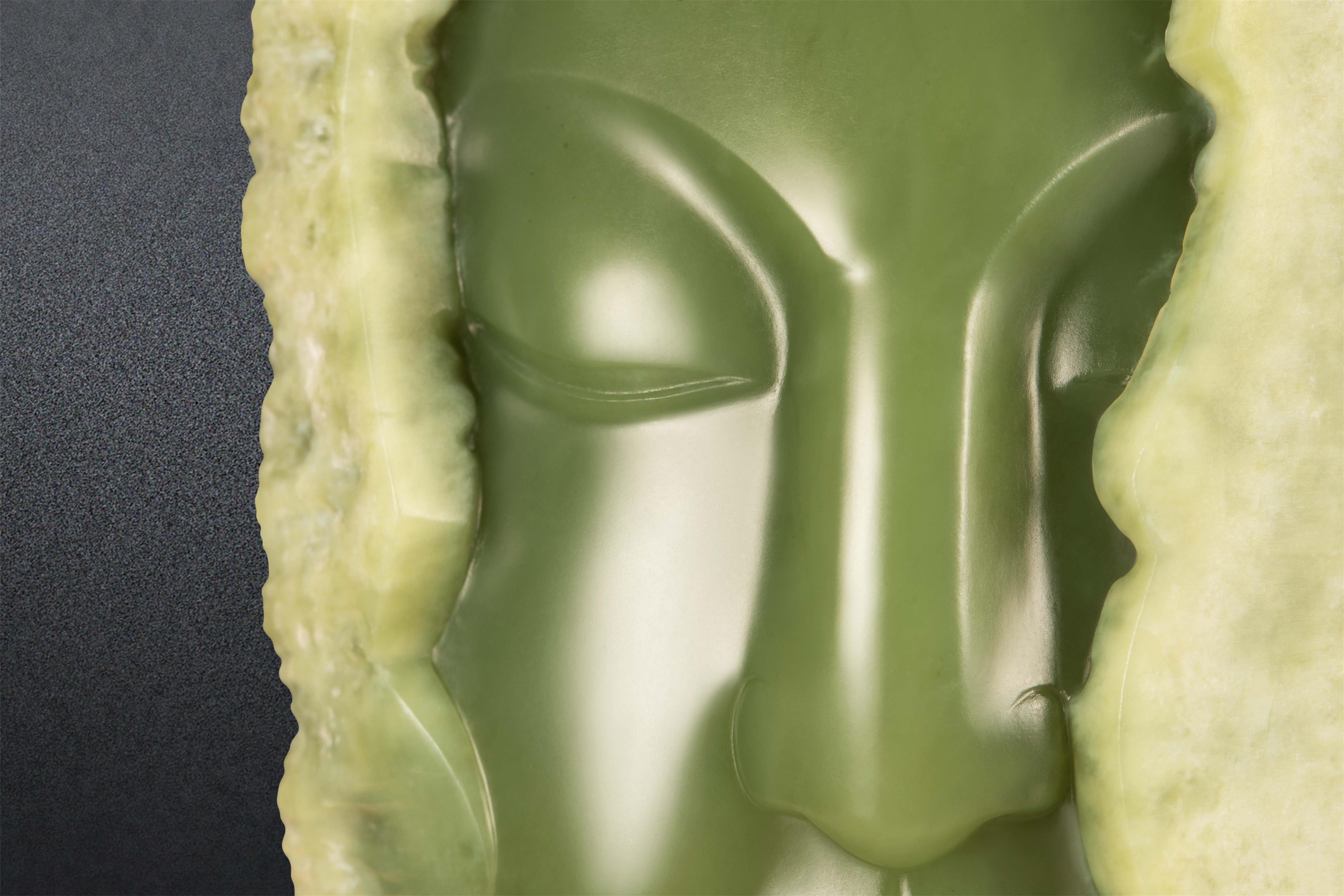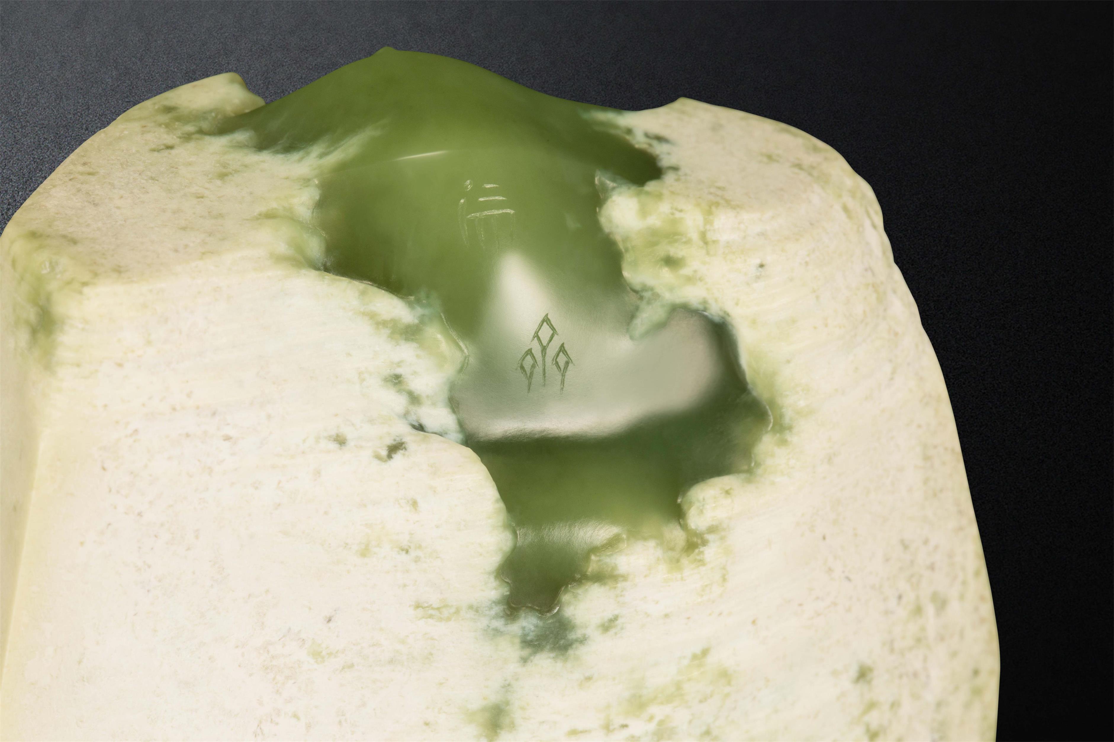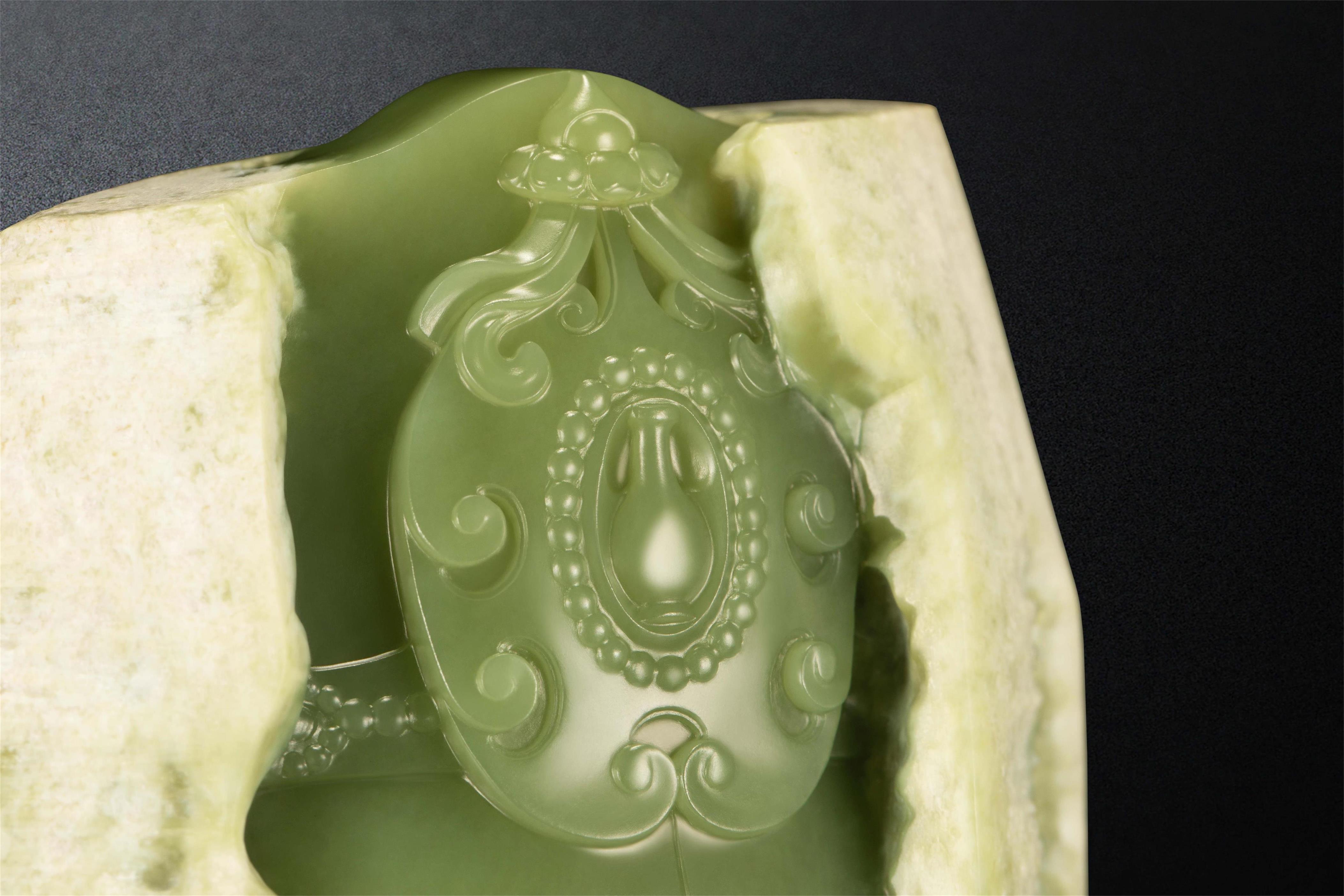 断面里裸露着玉肉,质地细腻无杂,色泽青葱有光,气度沉静温和,极为适合刻画神圣、庄严的观音像。