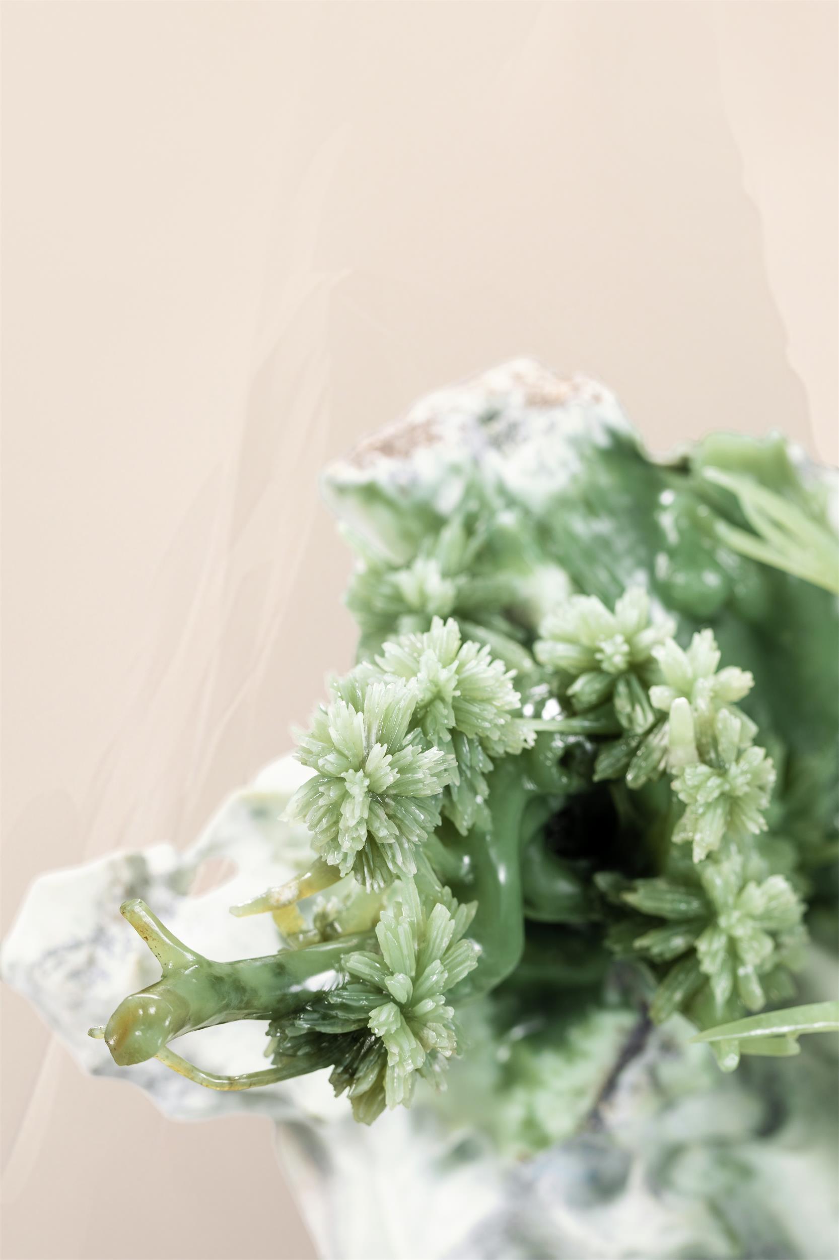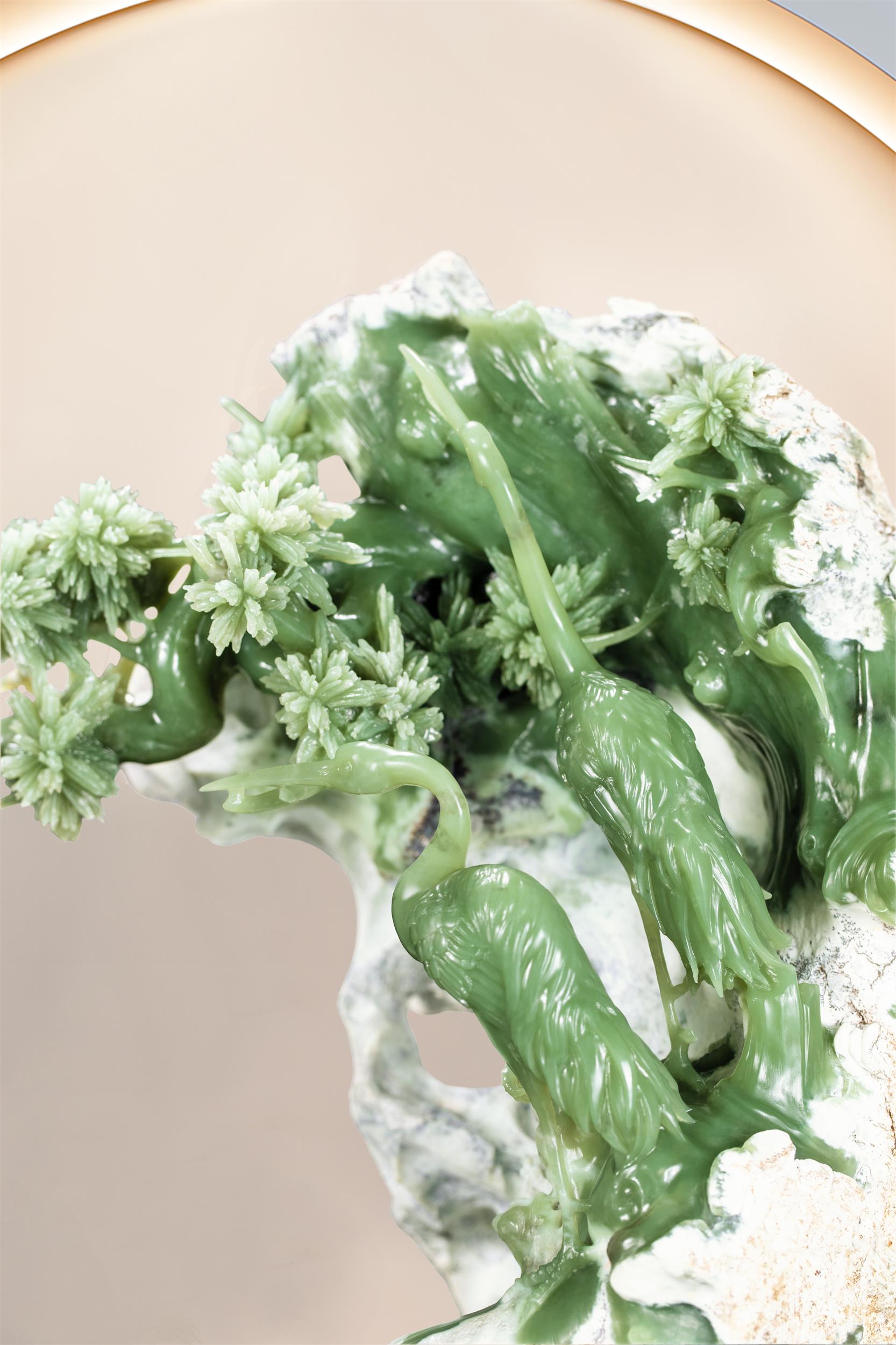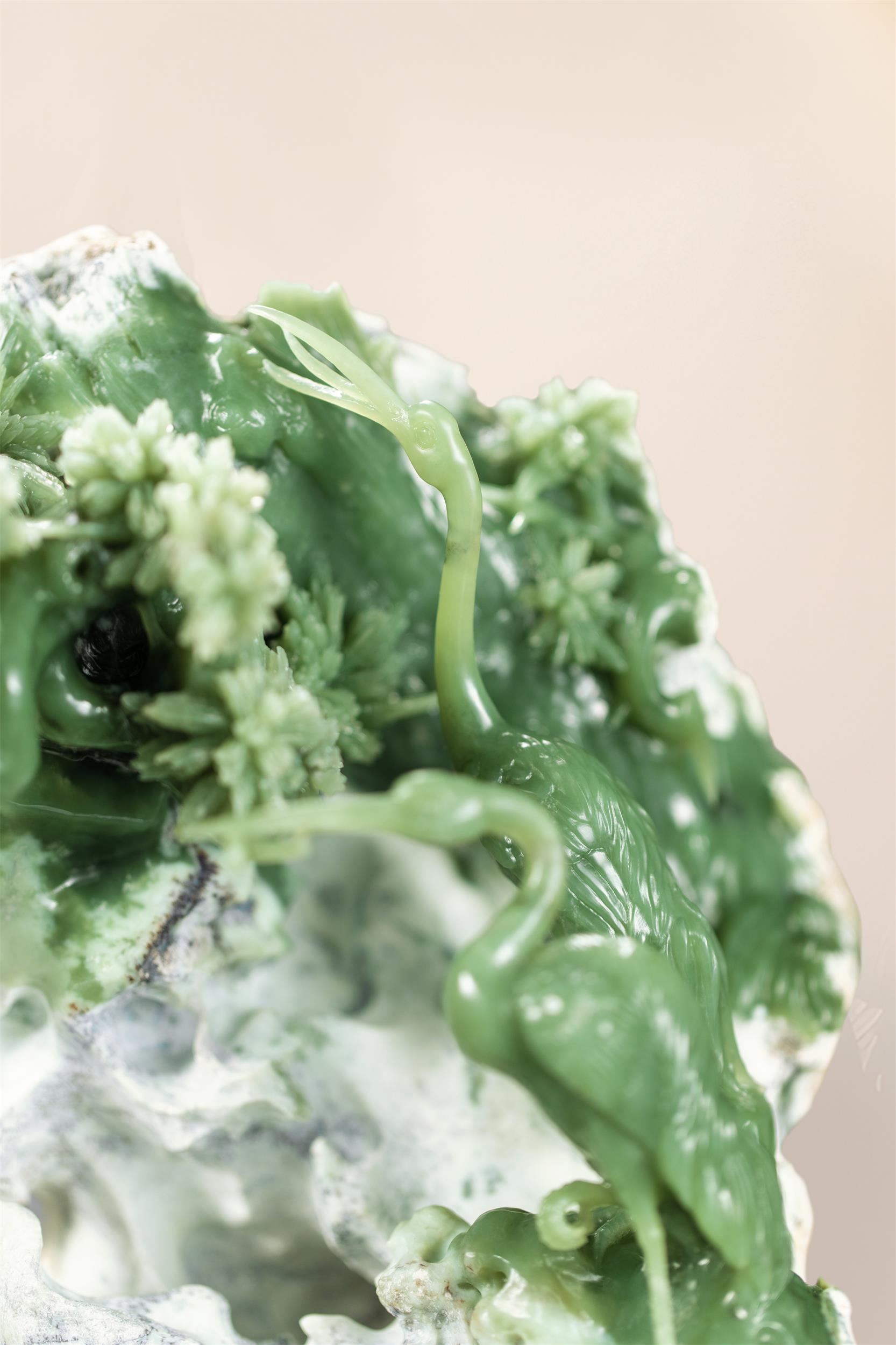 两只鹤的羽毛根根分明,被温润的玉色显得别般细腻柔软;它们的眼神,也如玉色般清澈而深邃,透着灵性。