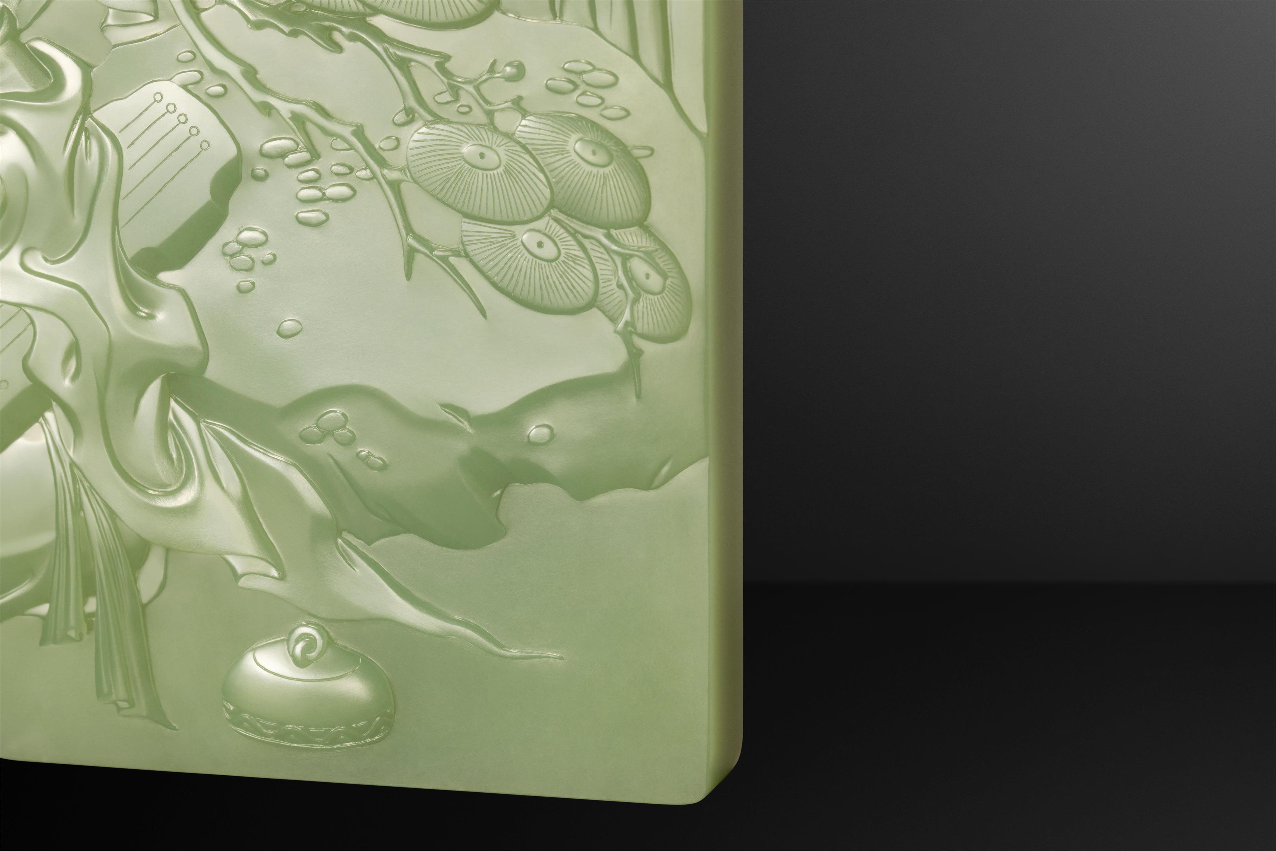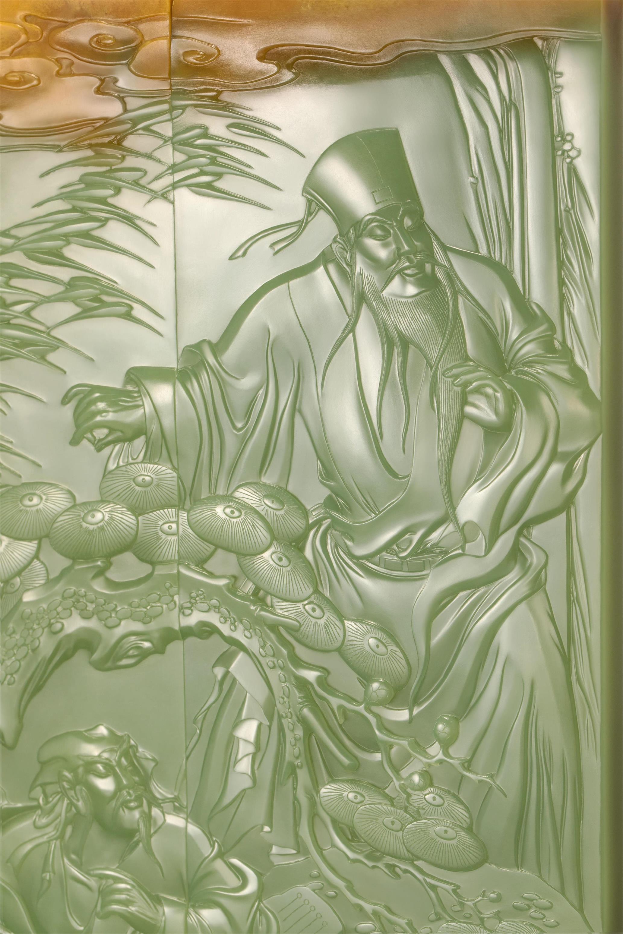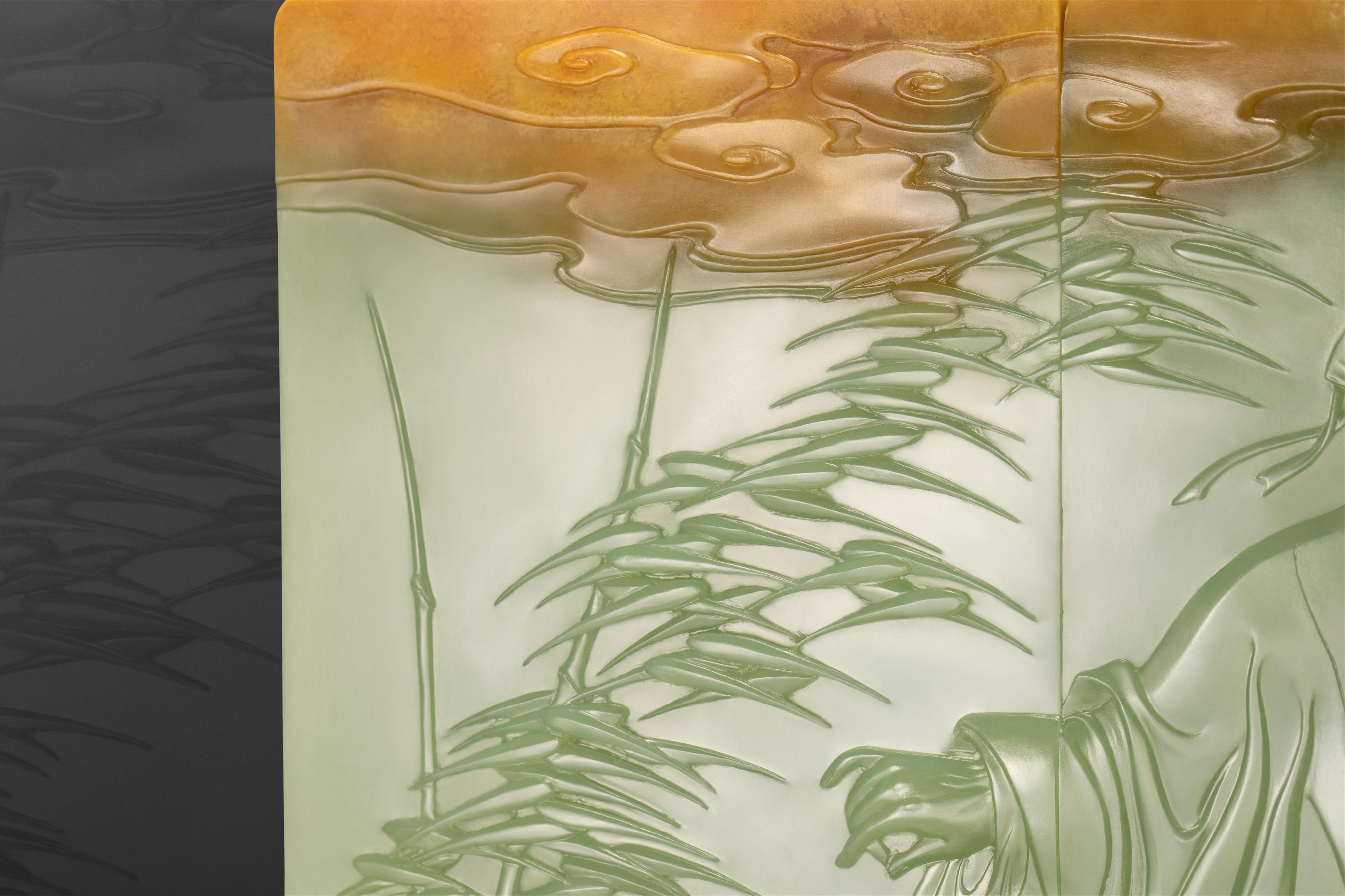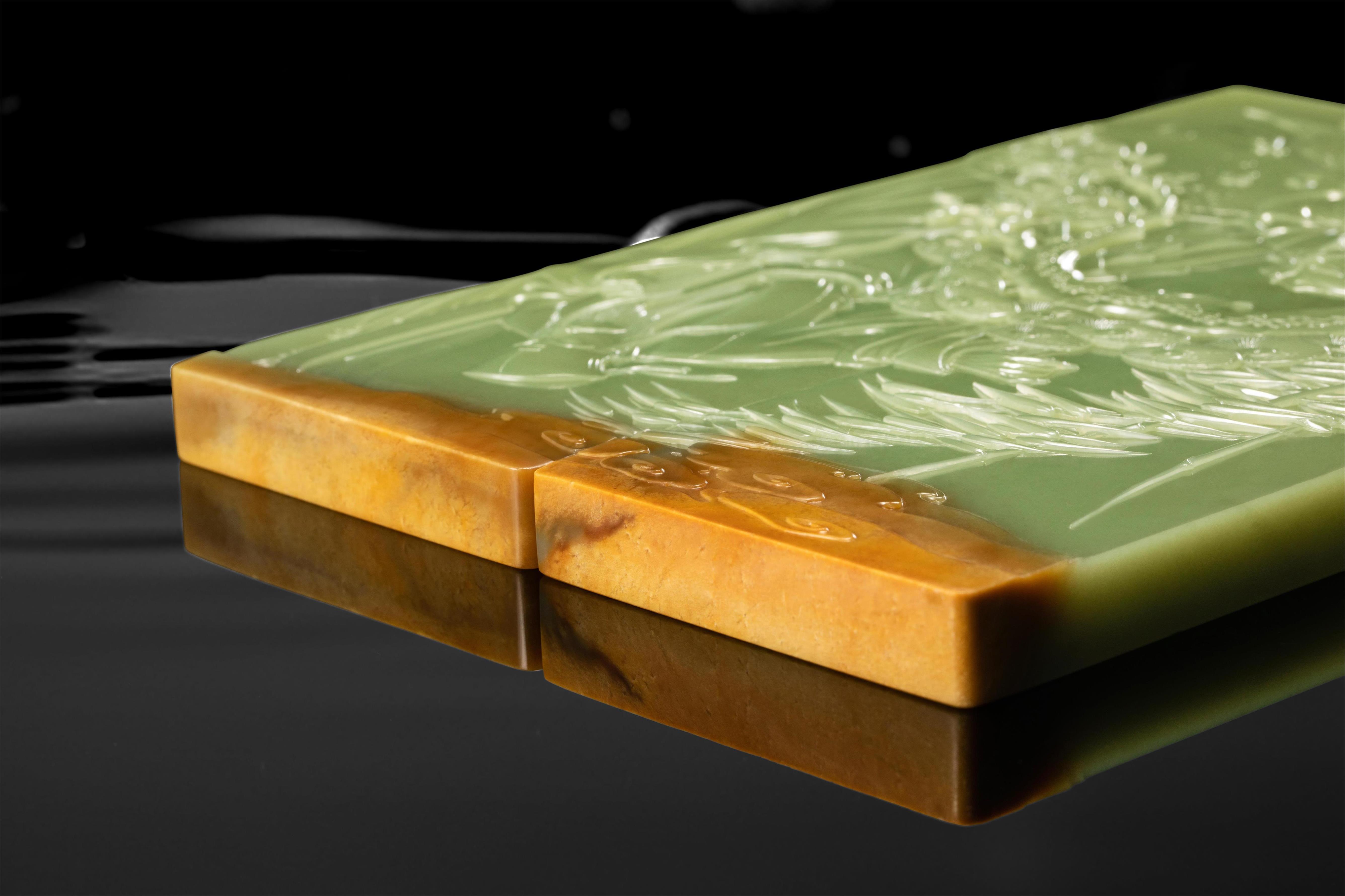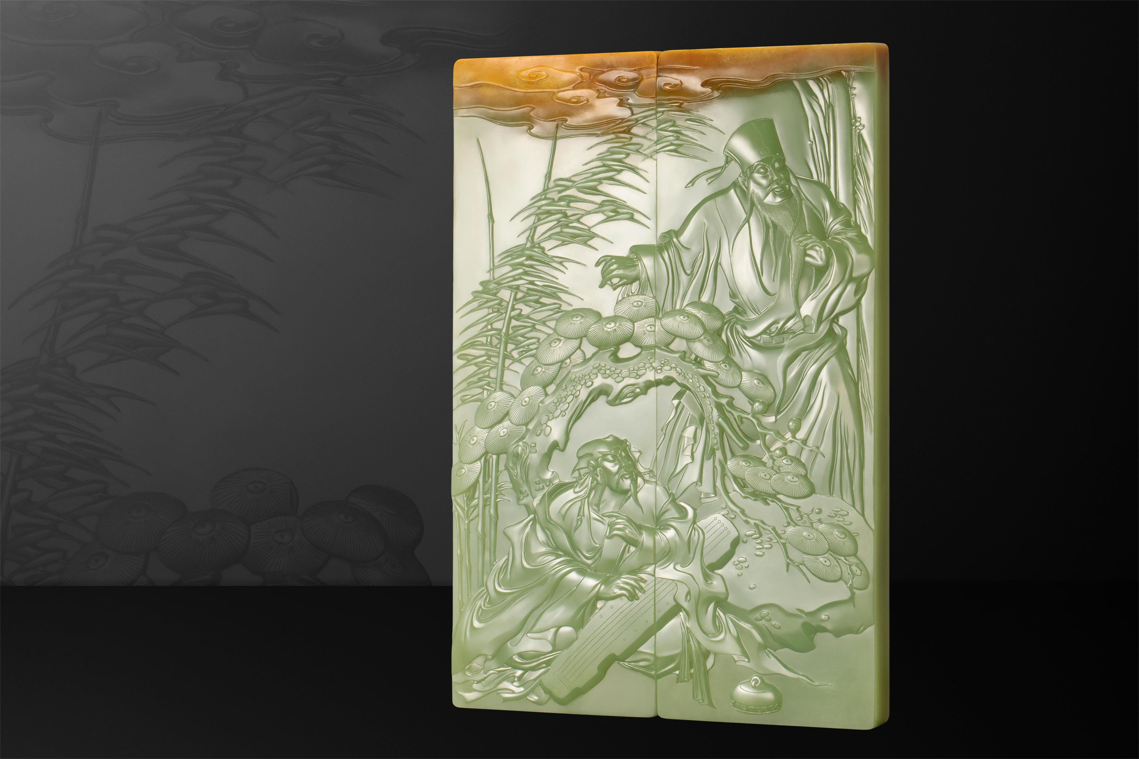 翟倚卫大师巧妙利用了这种俏色,刻下祥云朵朵,并将整块玉石分为两个独立的长方形薄片,各自刻画出俞伯牙与钟子期,使其即能独立成章,又能合而讲述一个完整的高山流水遇知音的故事。