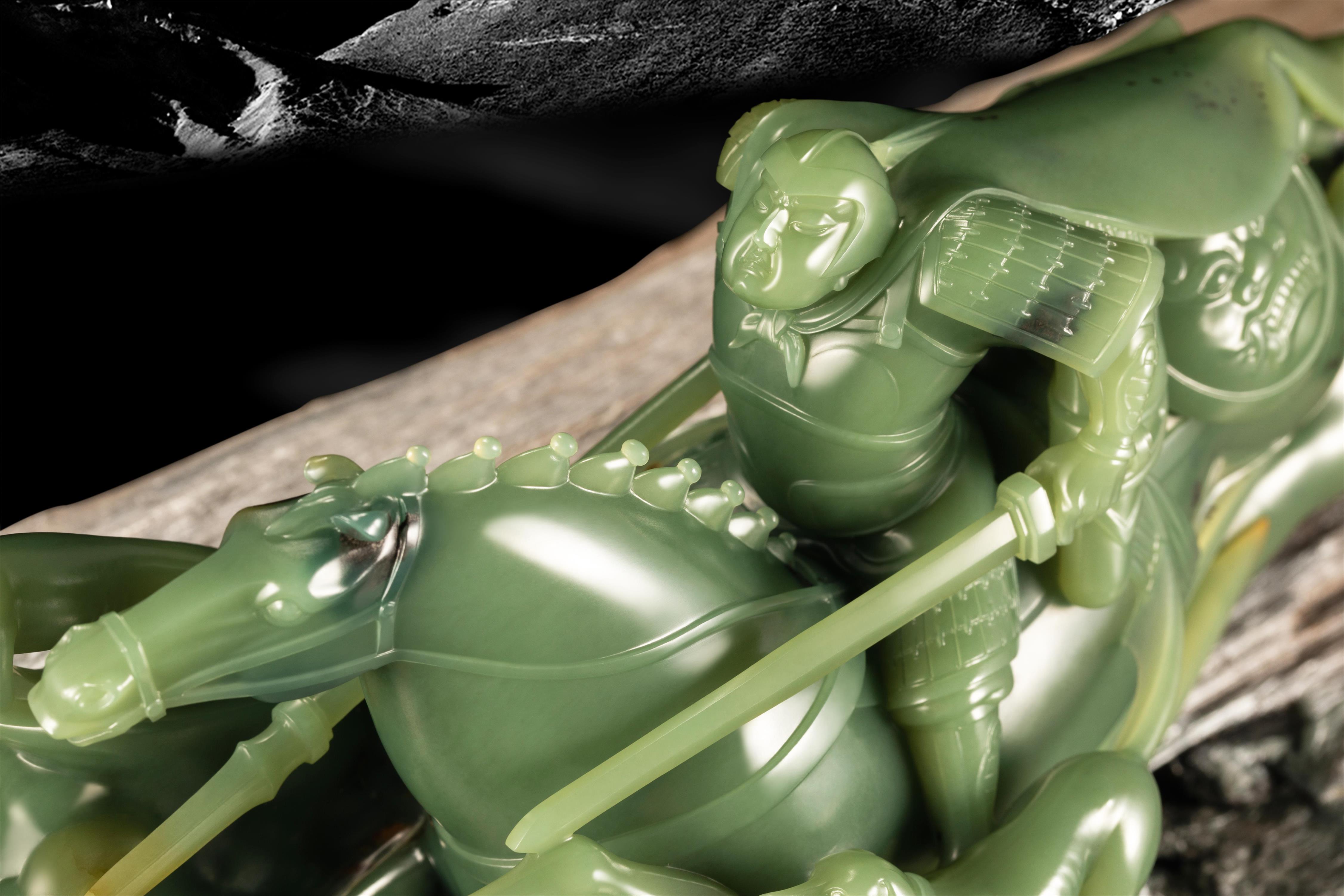 作者精细雕刻了武将铠甲上的复杂纹饰和威龙、瑞兽等装饰物,以彰显古老工艺的精湛与高贵。