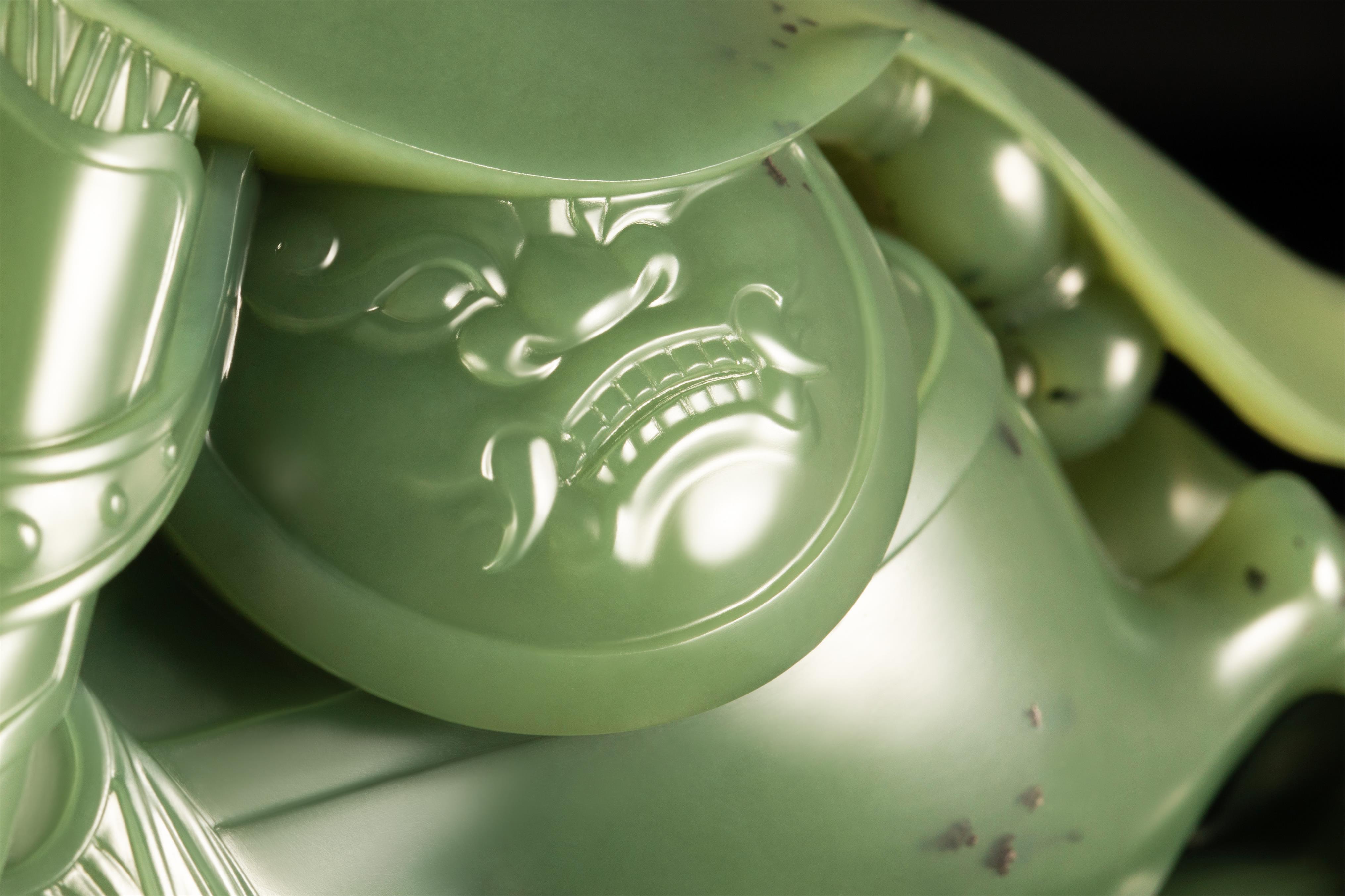 作者巧妙布局,充分利用这些所谓的瑕疵,为刀笔下呈现的每一个元素,增添层次、立体、色彩感和表现力,展示出艺术家对玉料和圆雕镂空技法的深刻理解,以及对动态美学的娴熟把握,使得观者无论从哪个角度欣赏,都能感受到那种逼真的动感和作品传达的历史厚重感。