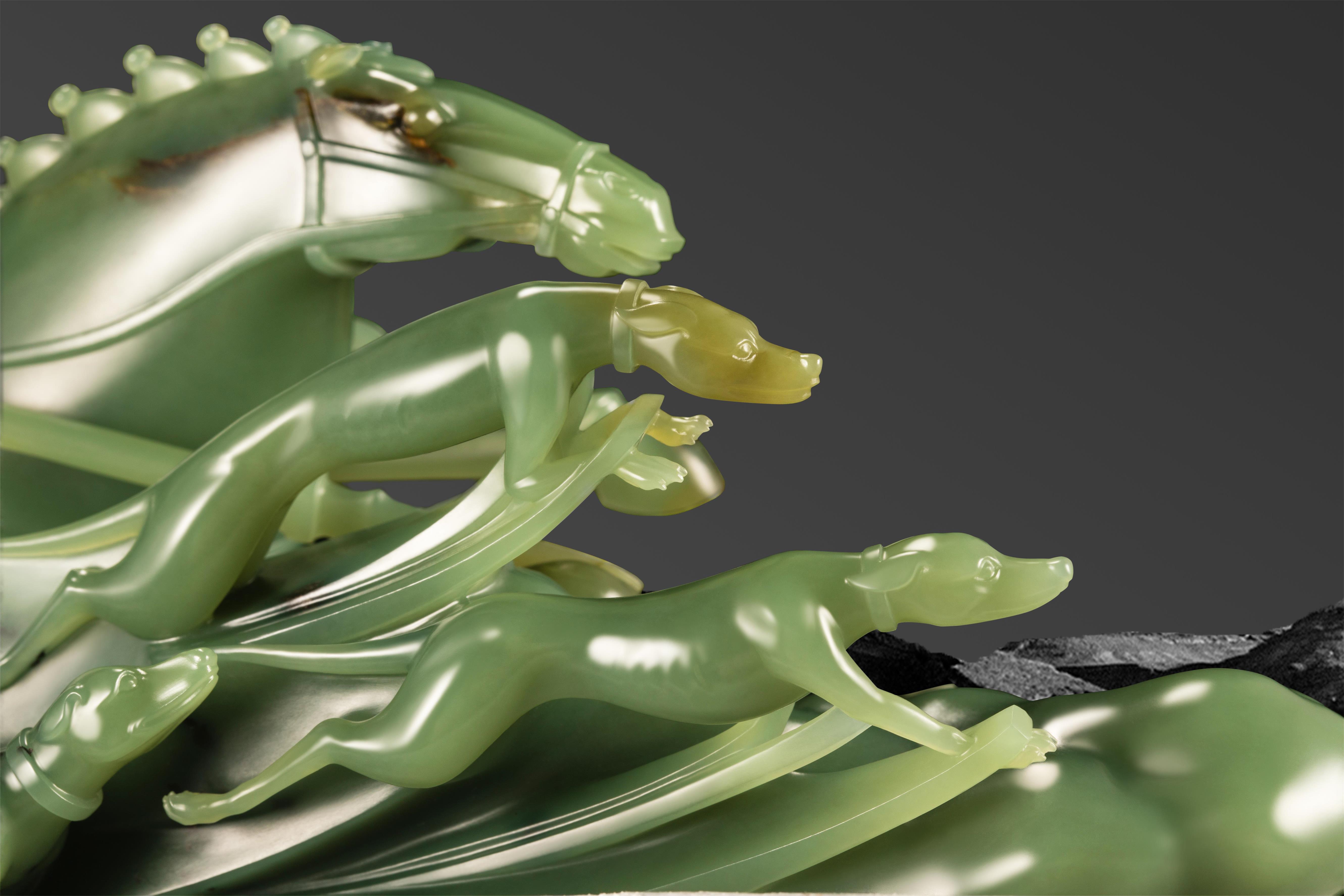 战马周围的猎犬紧随左右,向前疾奔的形态各不相同却栩栩如生,将场景的紧张感、真实感,以及团队合作、积极进取的精神表现得淋漓尽致。