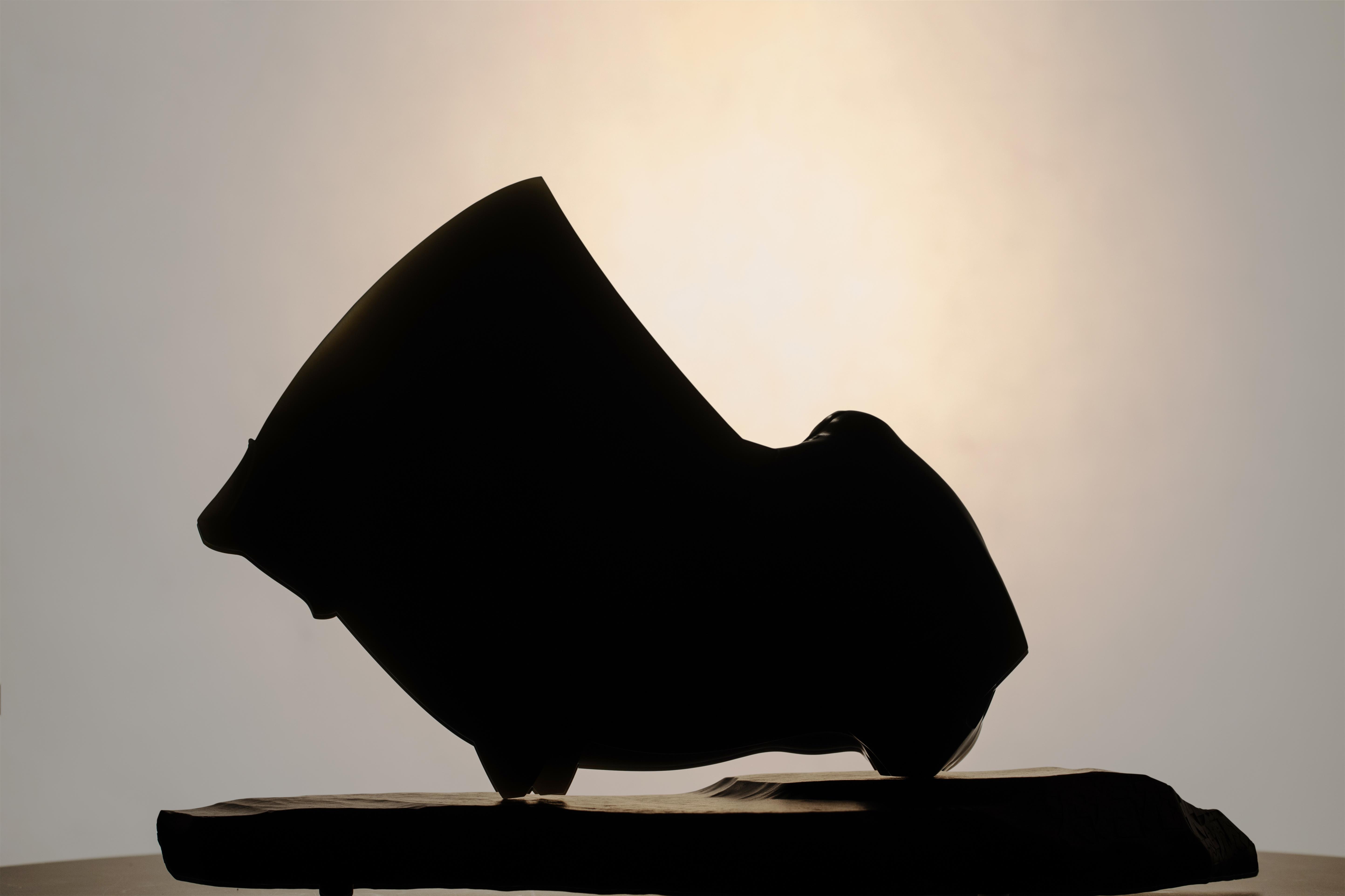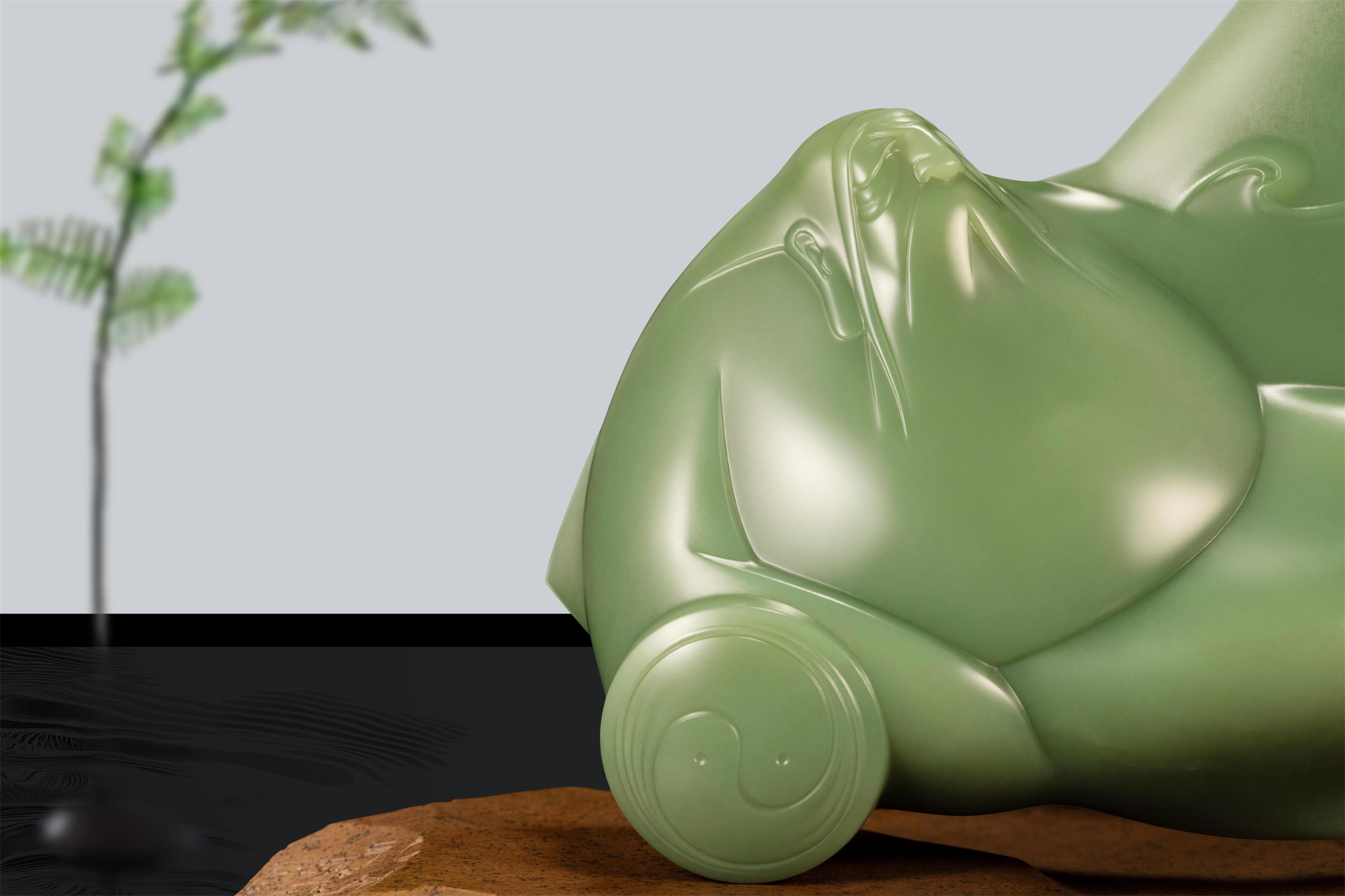 以变形的圆,塑造侧身倚卧在青牛前方的老子,展现他圆融的大肚子和圆润的下半身;