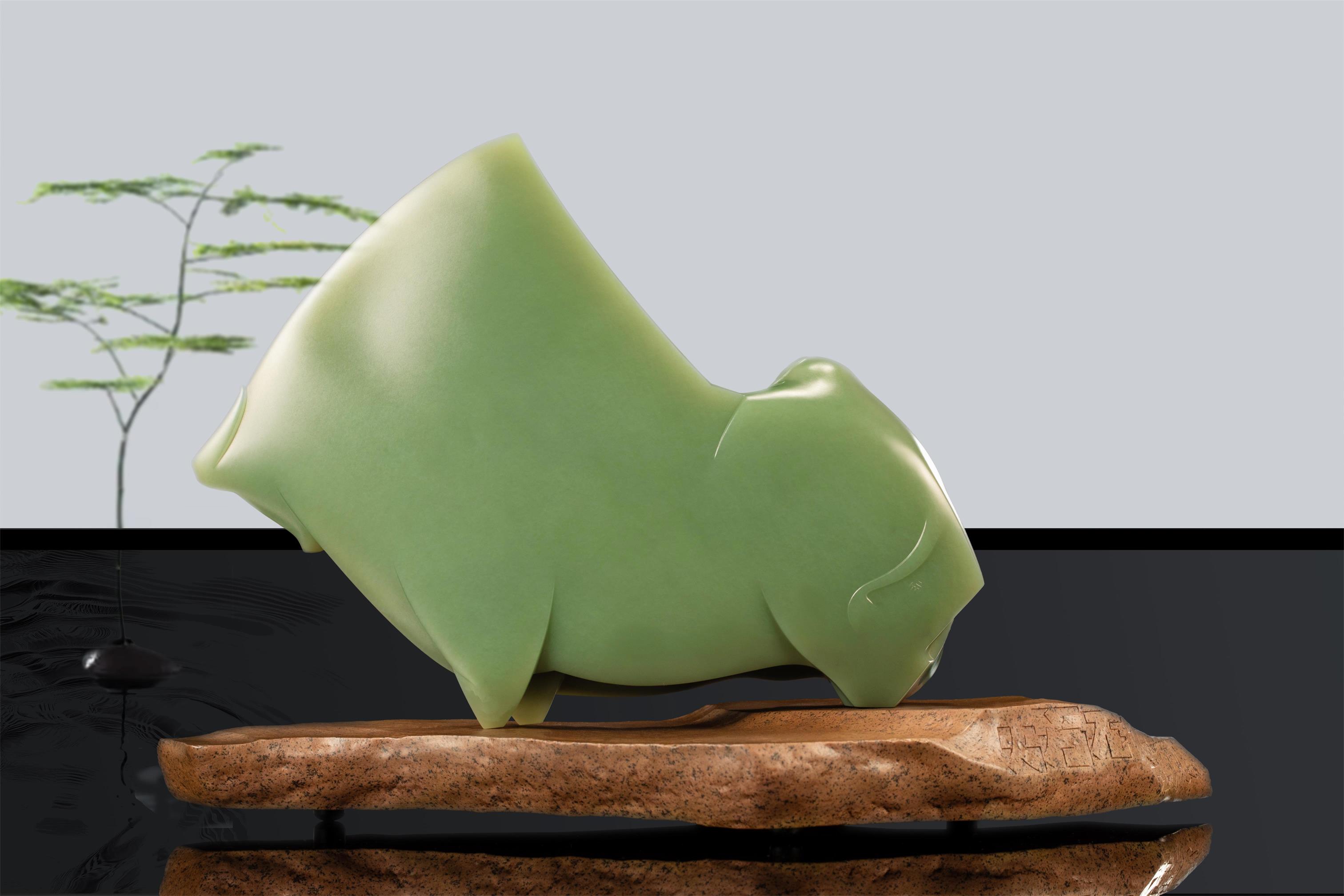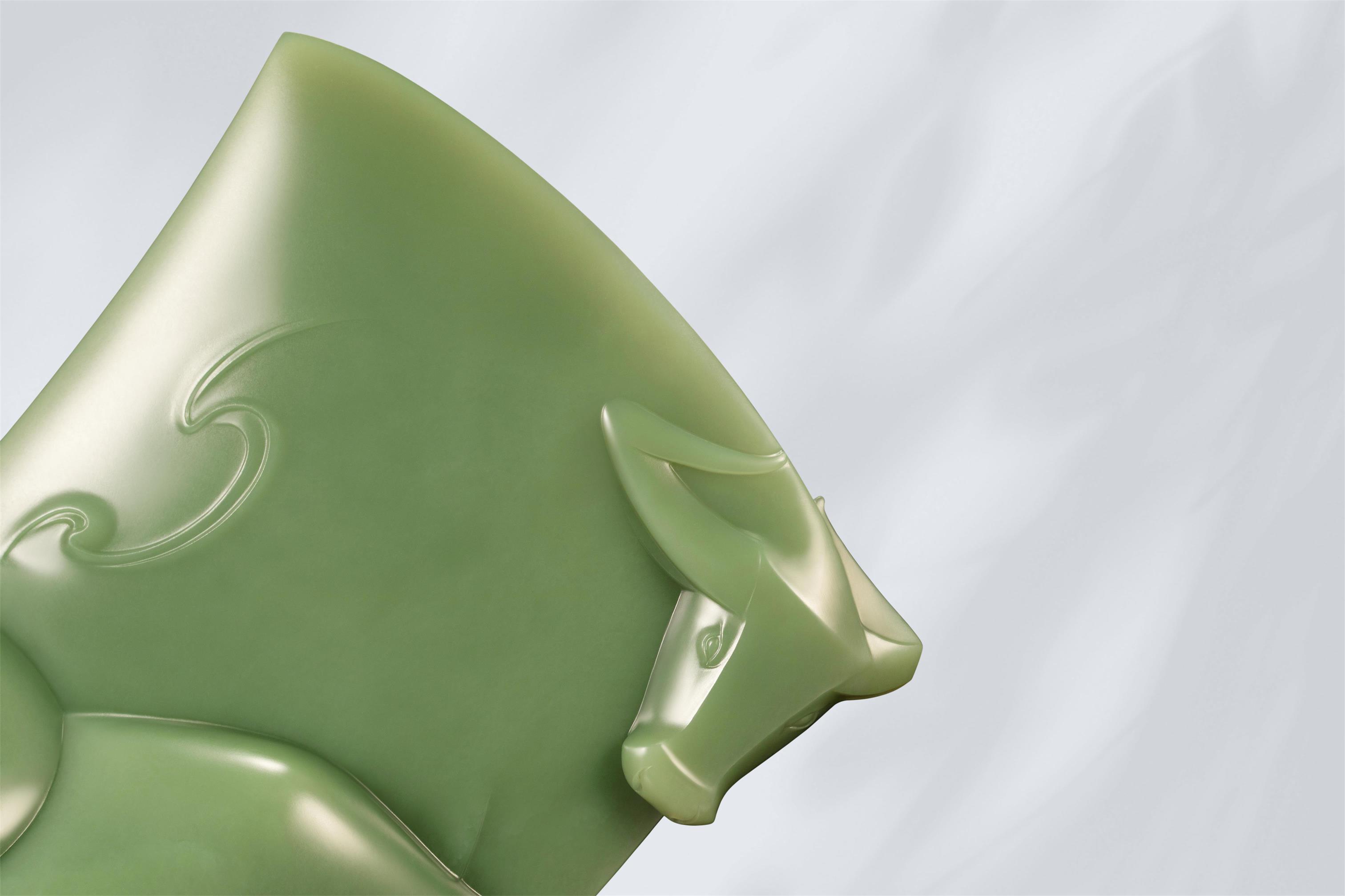 作品玉料形制为扁薄的片状,立体创作很受限,但作者却以智慧化难为简,融入齐晓波董事长与自己不谋而合的夸张、抽象和几何图形设计元素,以劲朗的线条,刻画形体呈方形的青牛,夸张表现它直挺耸高的脊背;