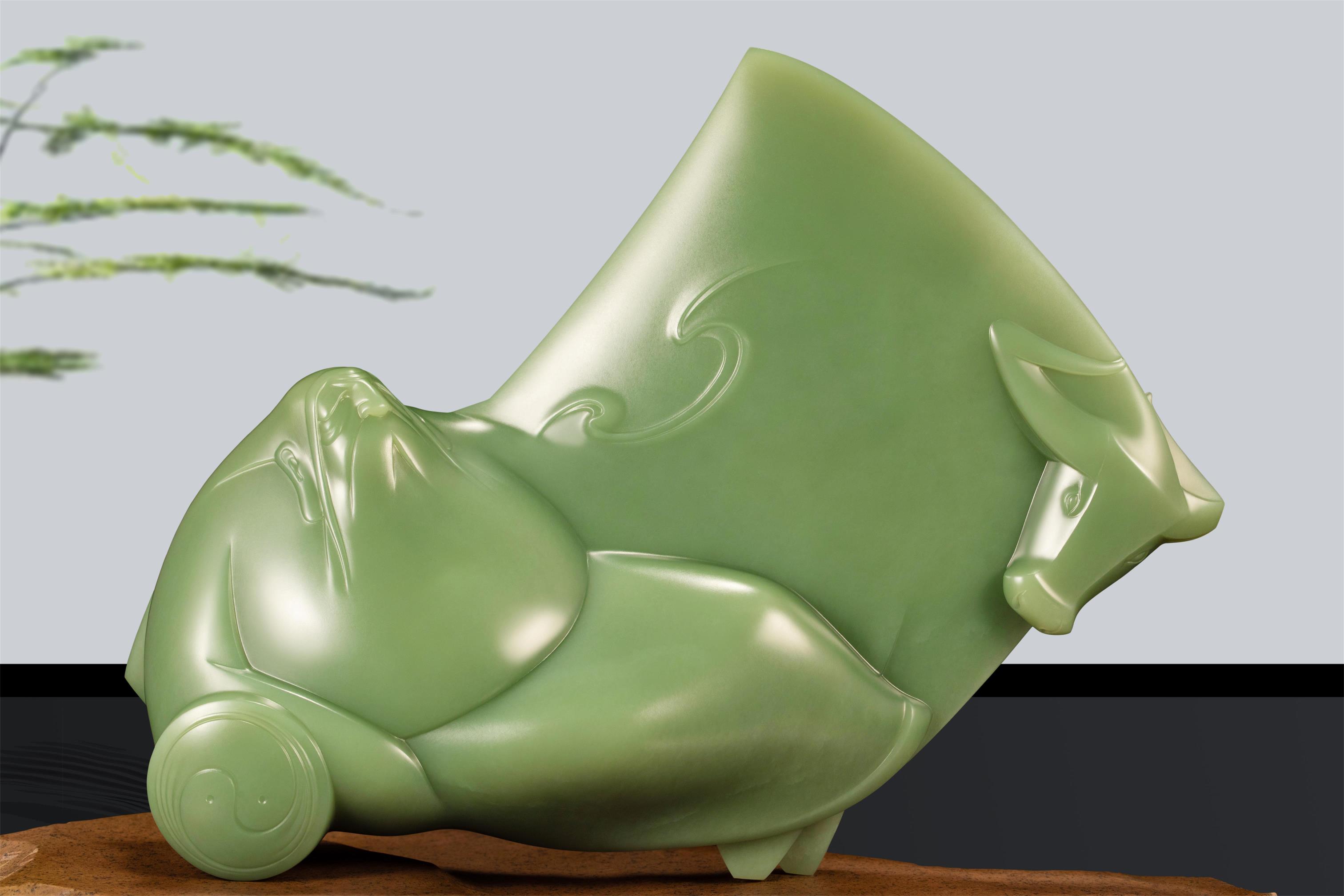 作品《大道至简》,以夸张、抽象和简约的艺术表现形式为其特色,摒弃冗余的细节,自然展现析木玉料如月般素洁、如君般内敛的特质,刻画出一个不同寻常的老子悠然倚靠青牛的生动画面。