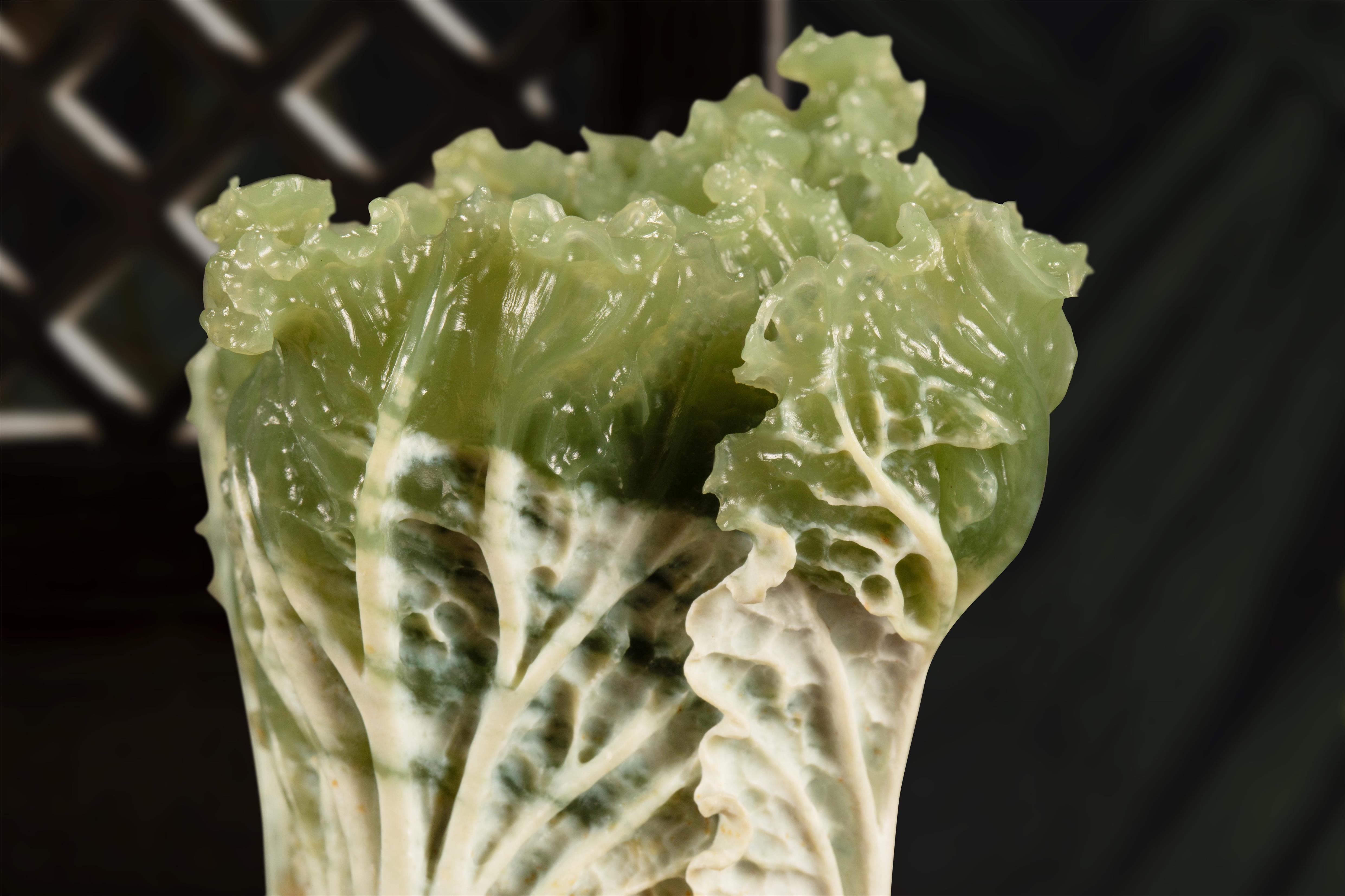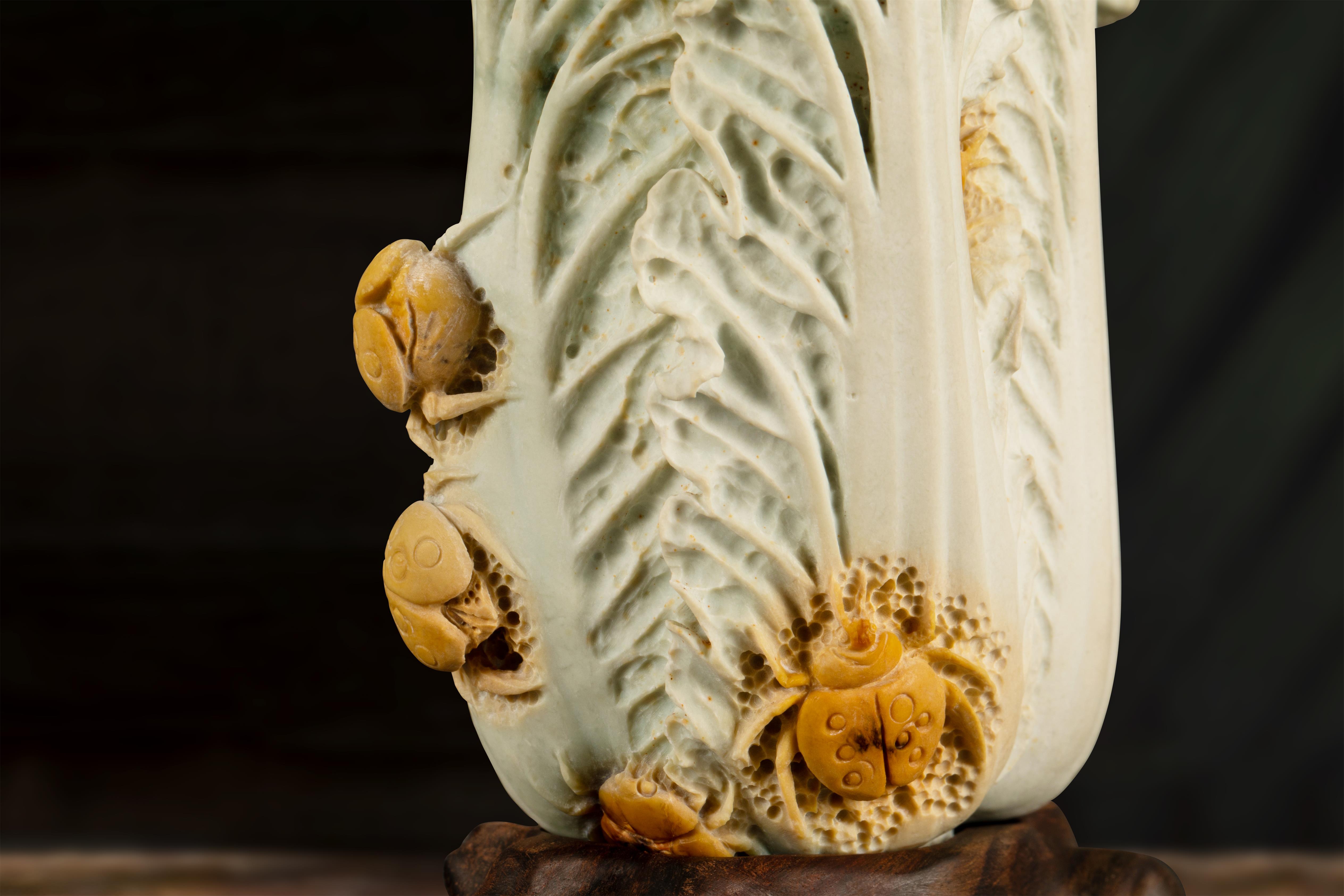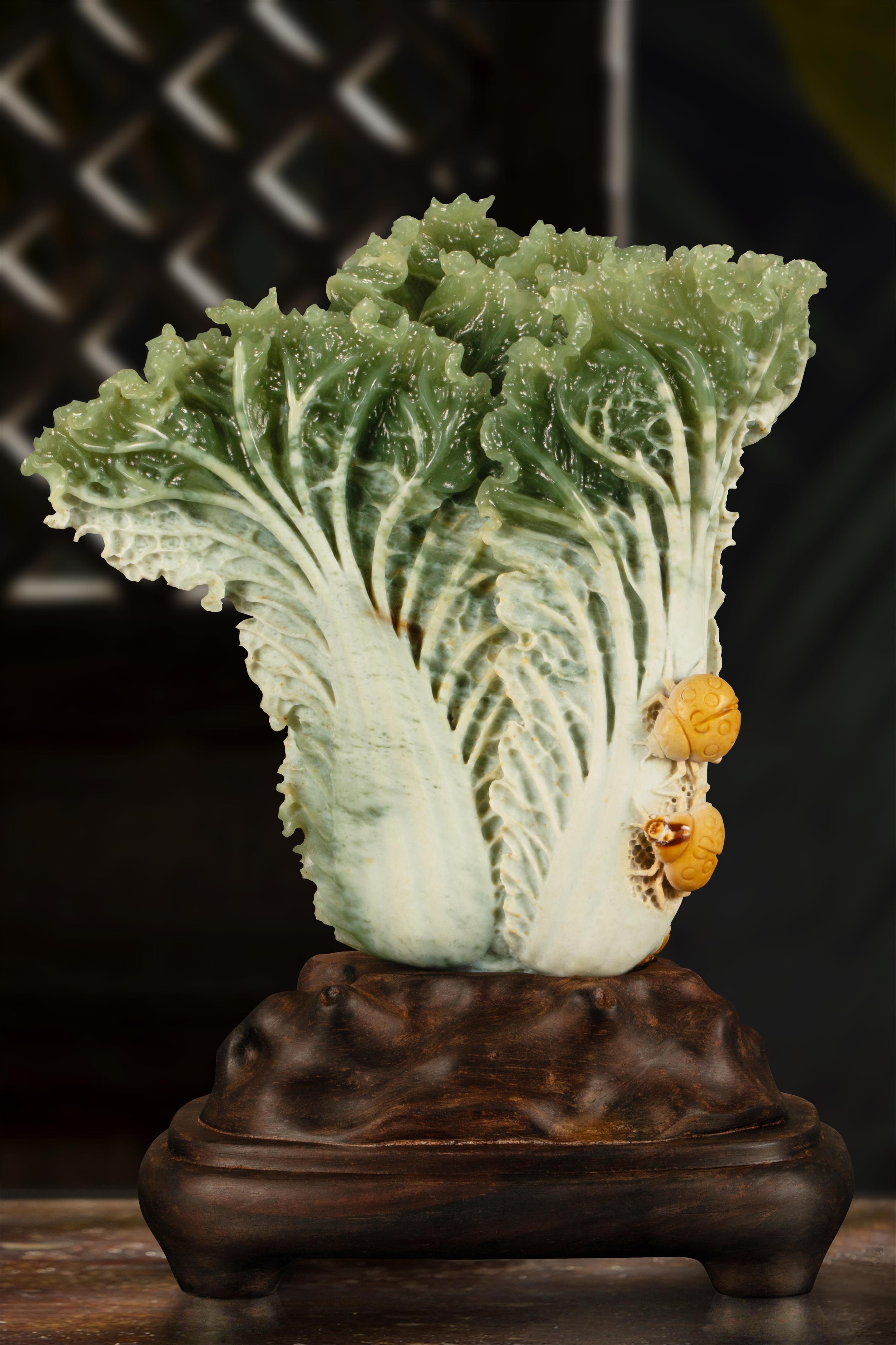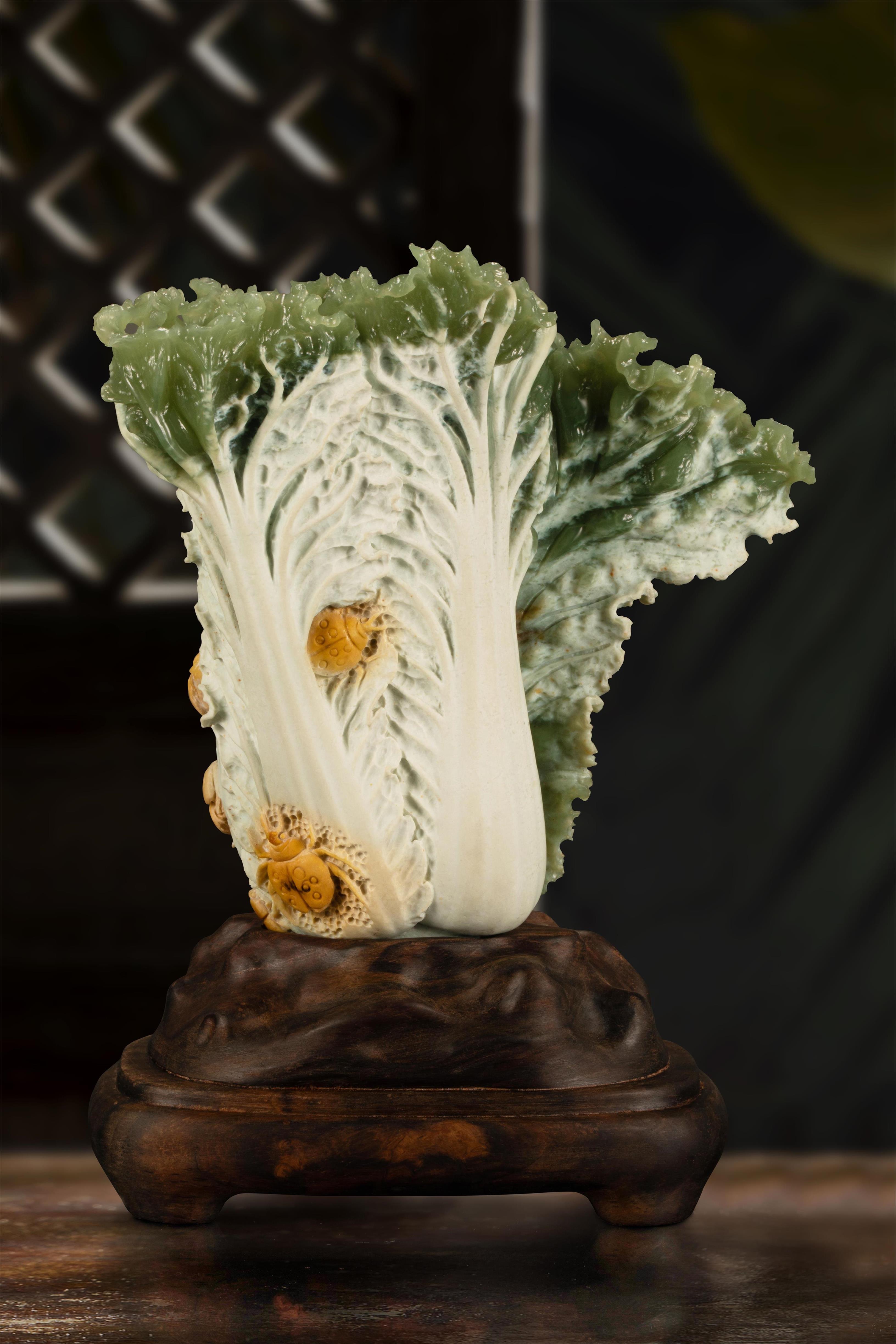 李红伟利用析木玉特有的天然色泽,将白菜的青绿叶片和白中透绿的白菜梆部雕刻得玲珑剔透。