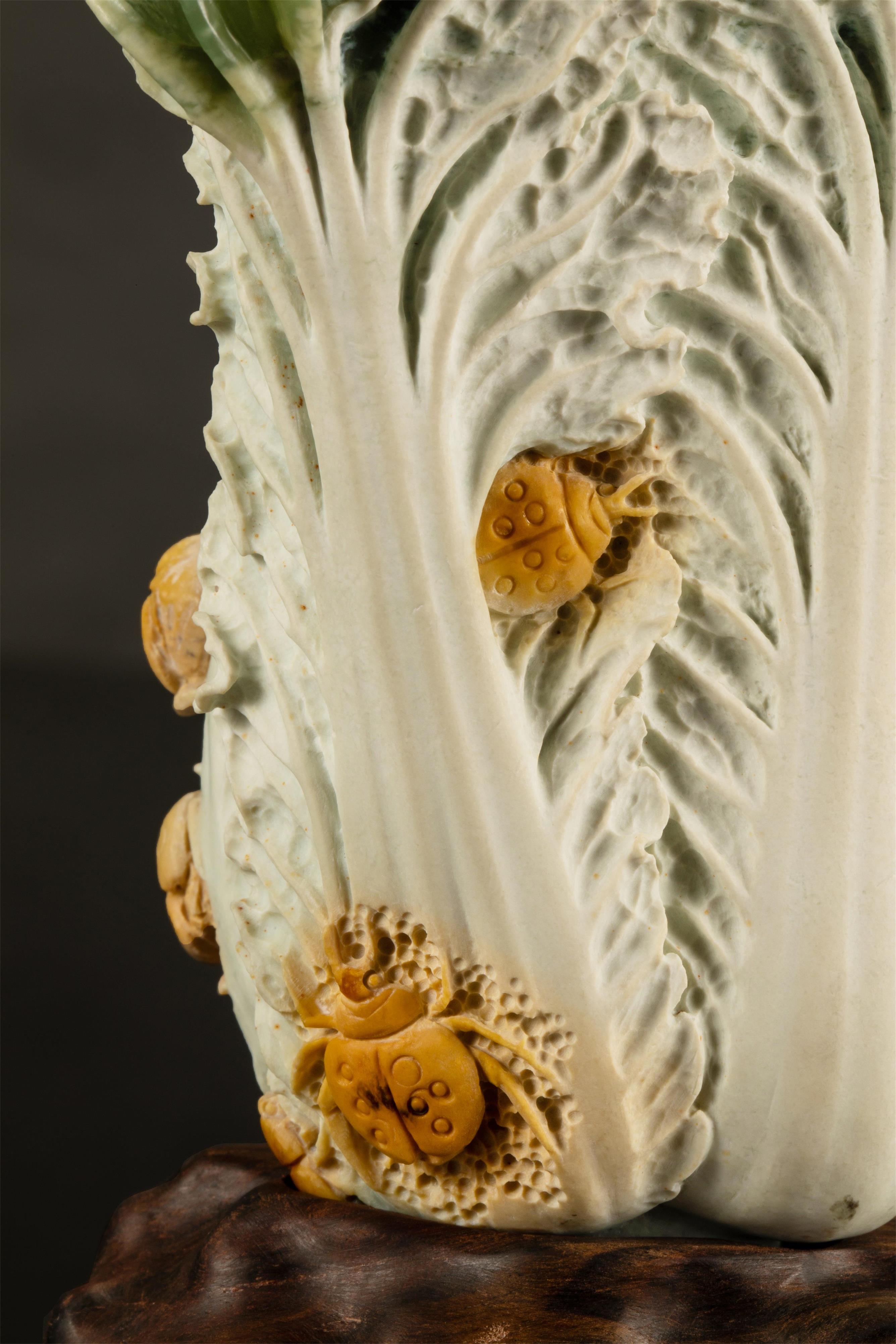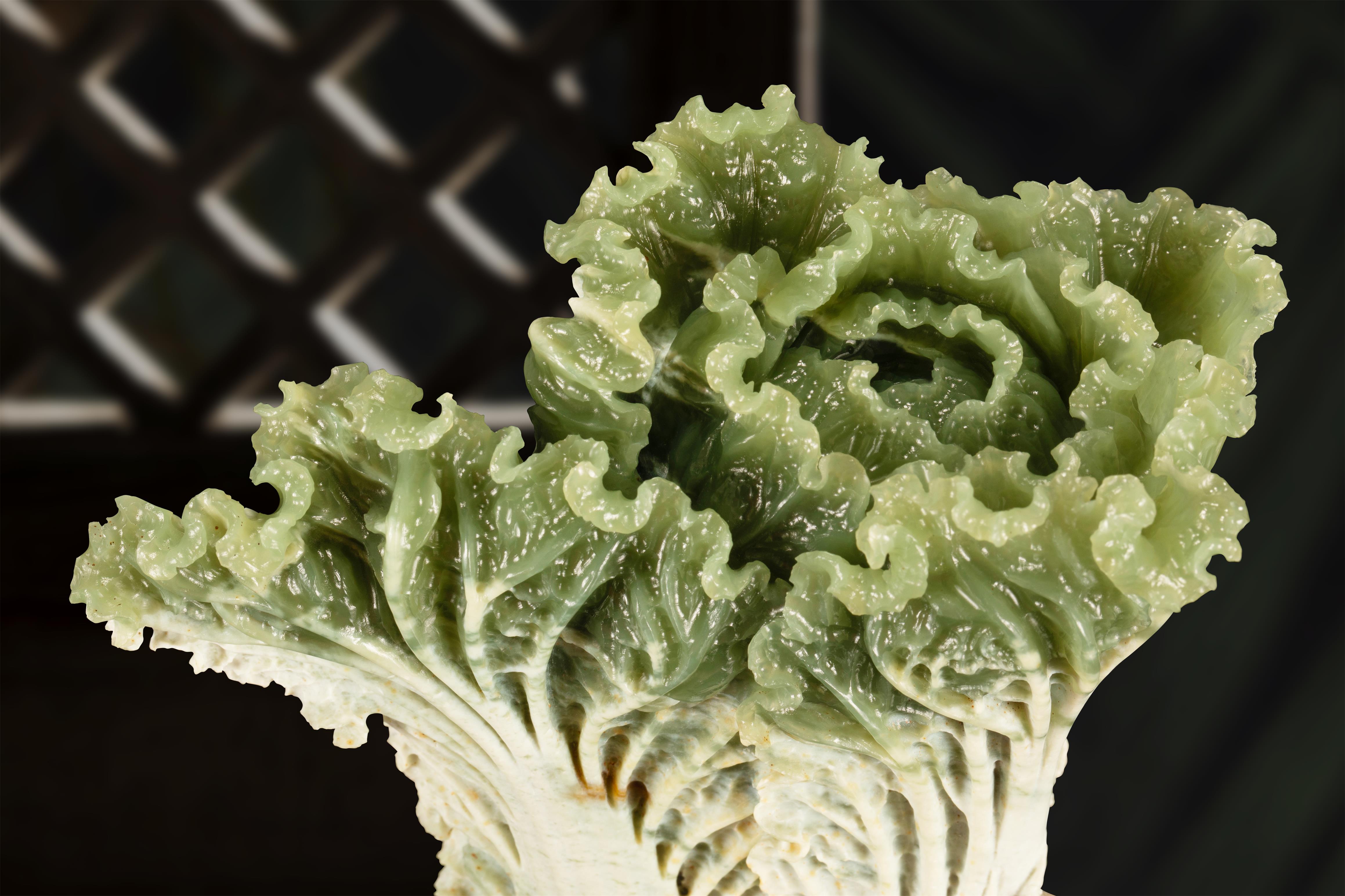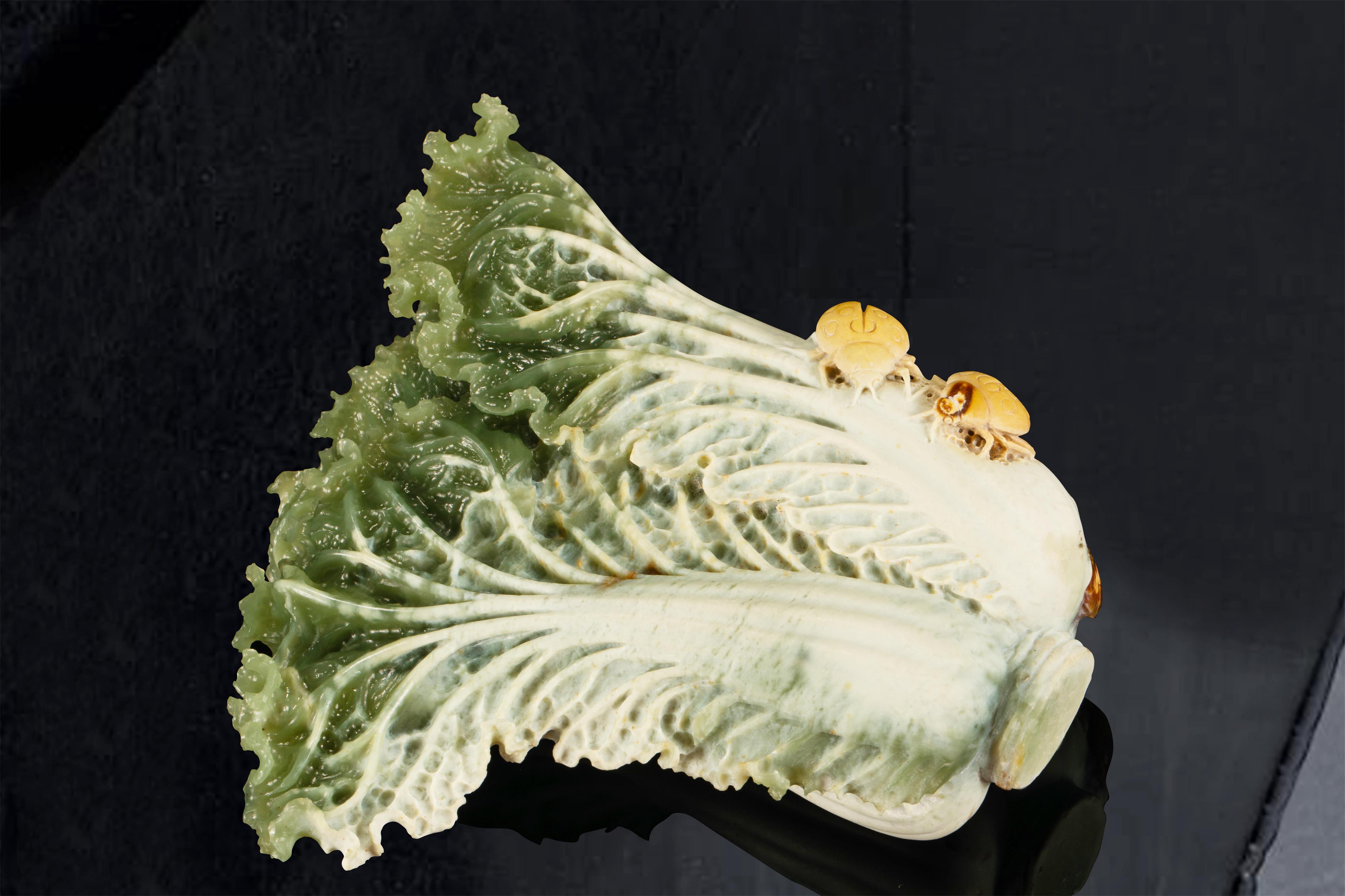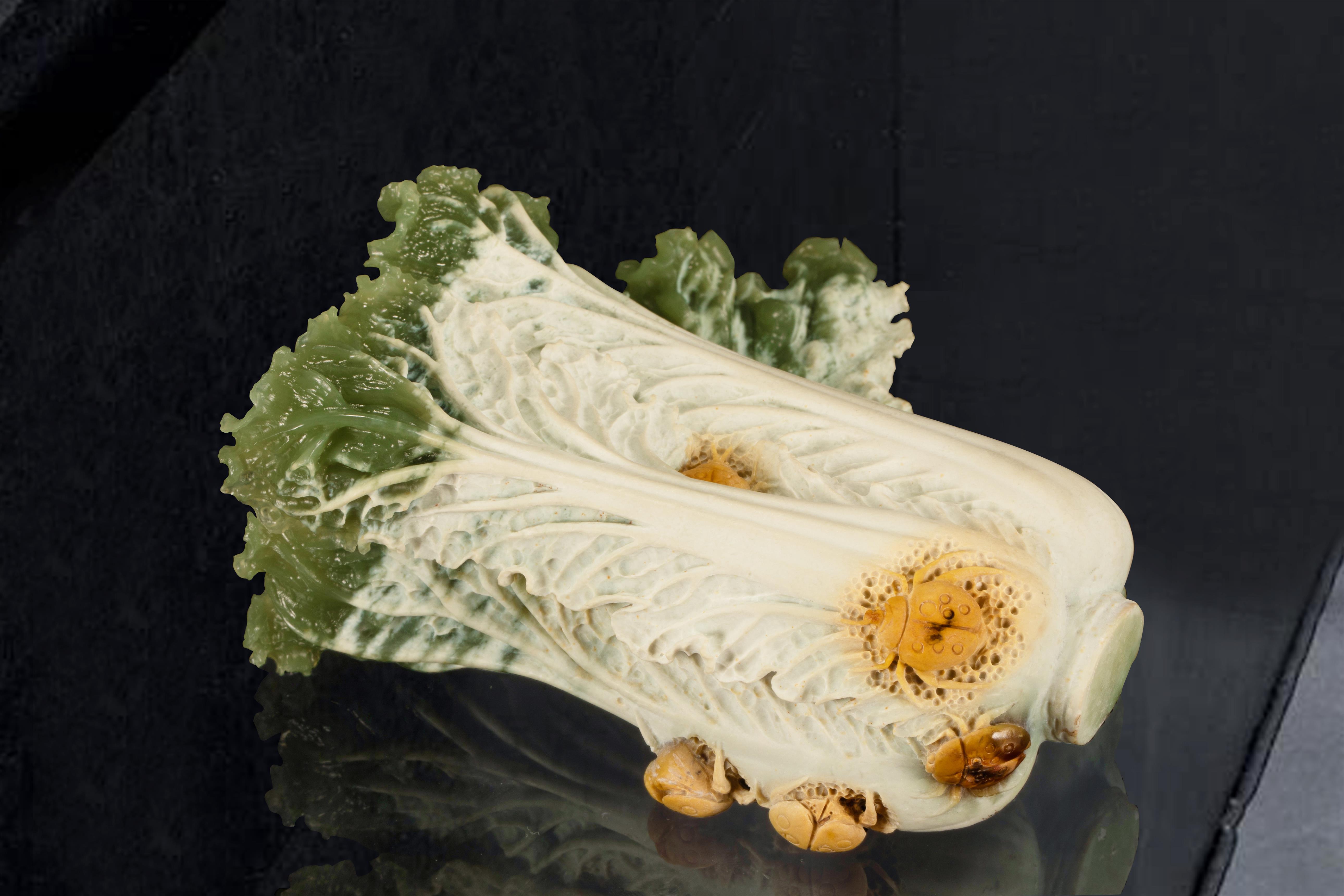 李红伟利用析木玉特有的天然色泽,将白菜的青绿叶片和白中透绿的白菜梆部雕刻得玲珑剔透。