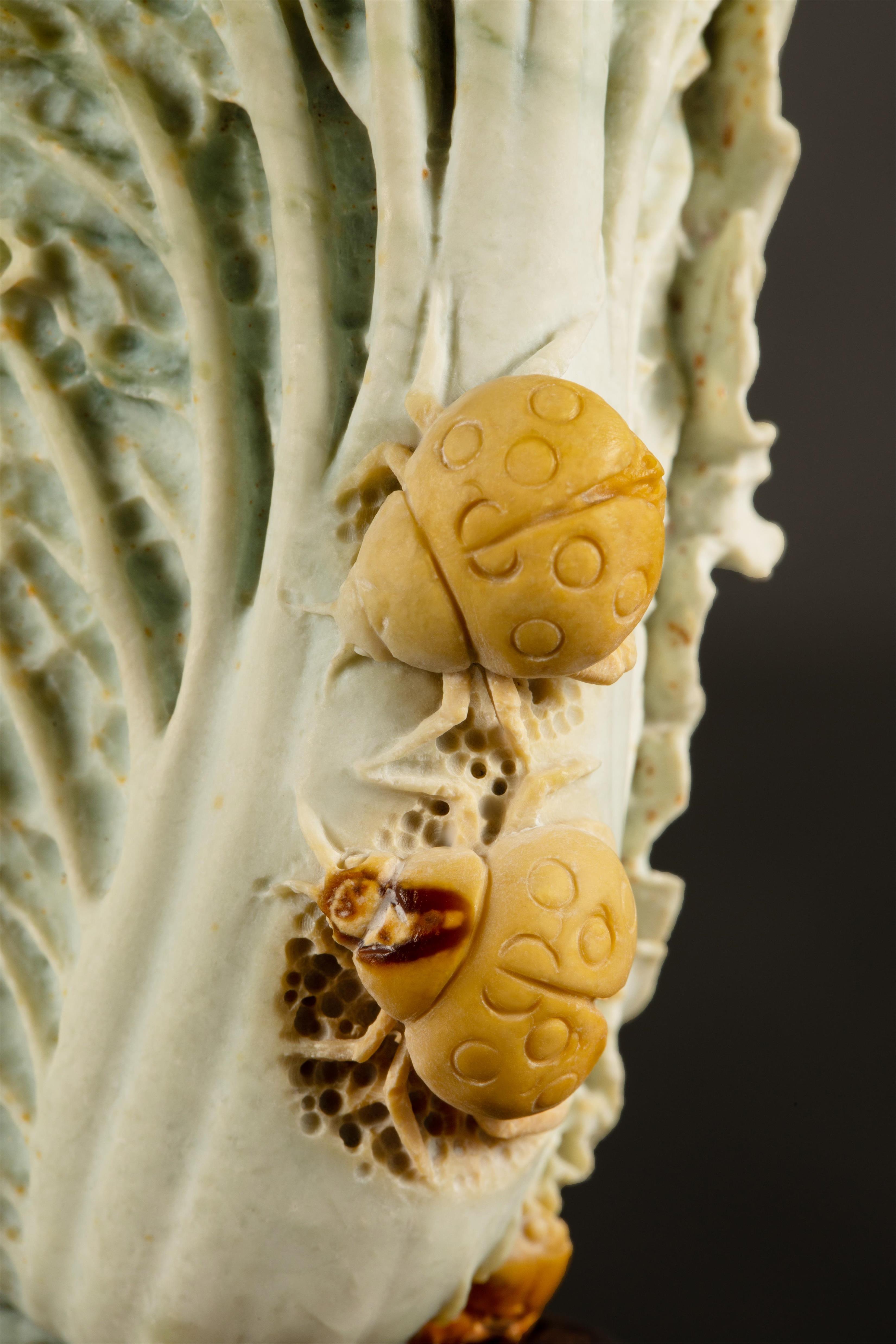 作品独具匠心之处在于它底部的俏色运用,在通透的白菜梆上,作者保留三五处金黄的皮色,将其巧妙设计成聚散错落、姿态各异、活灵活现的小甲壳虫。甲壳虫背部雕刻精细,头部或缀白或缀褐,生动有趣,整体色泽犹如财富的象征。
