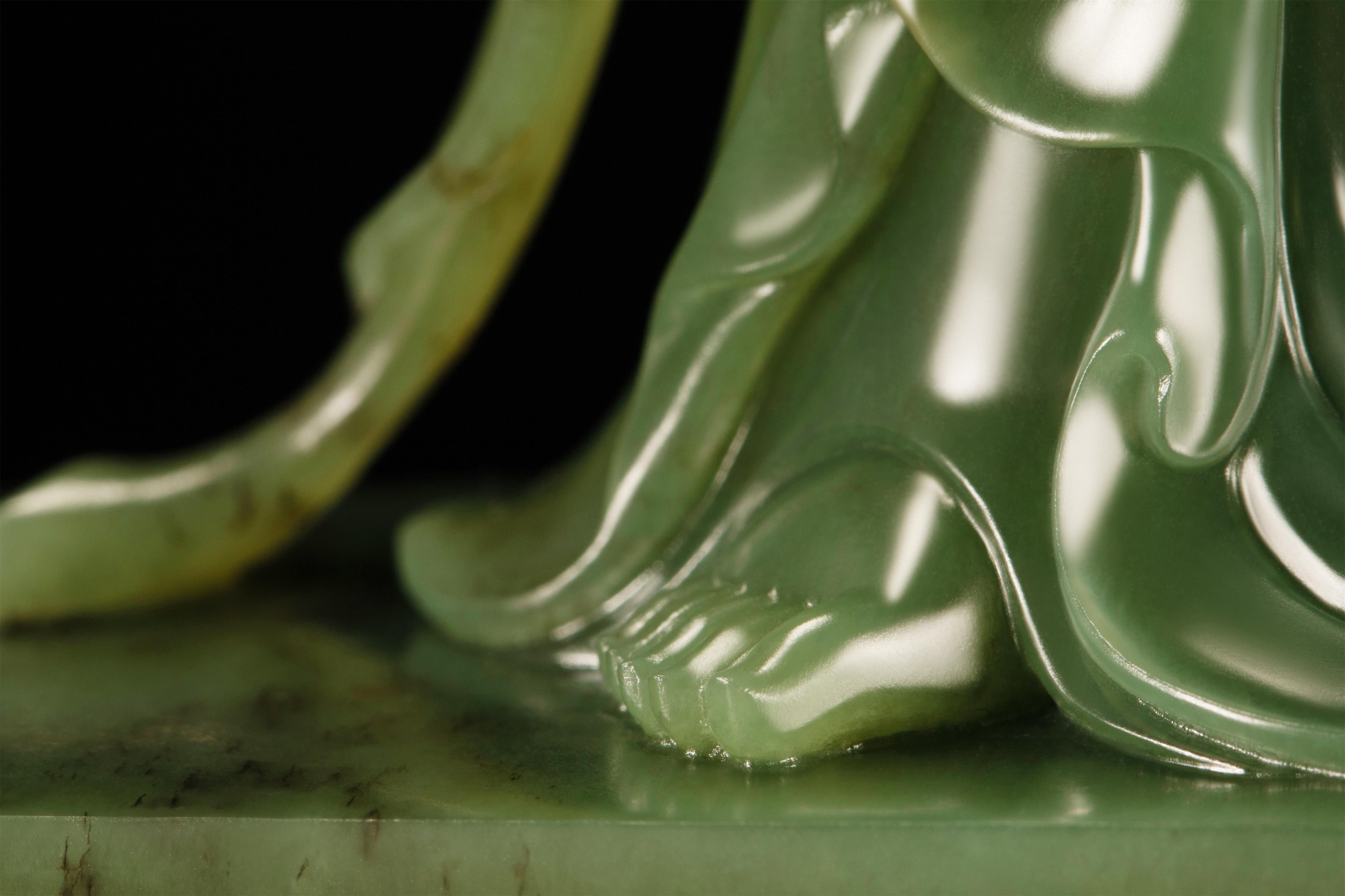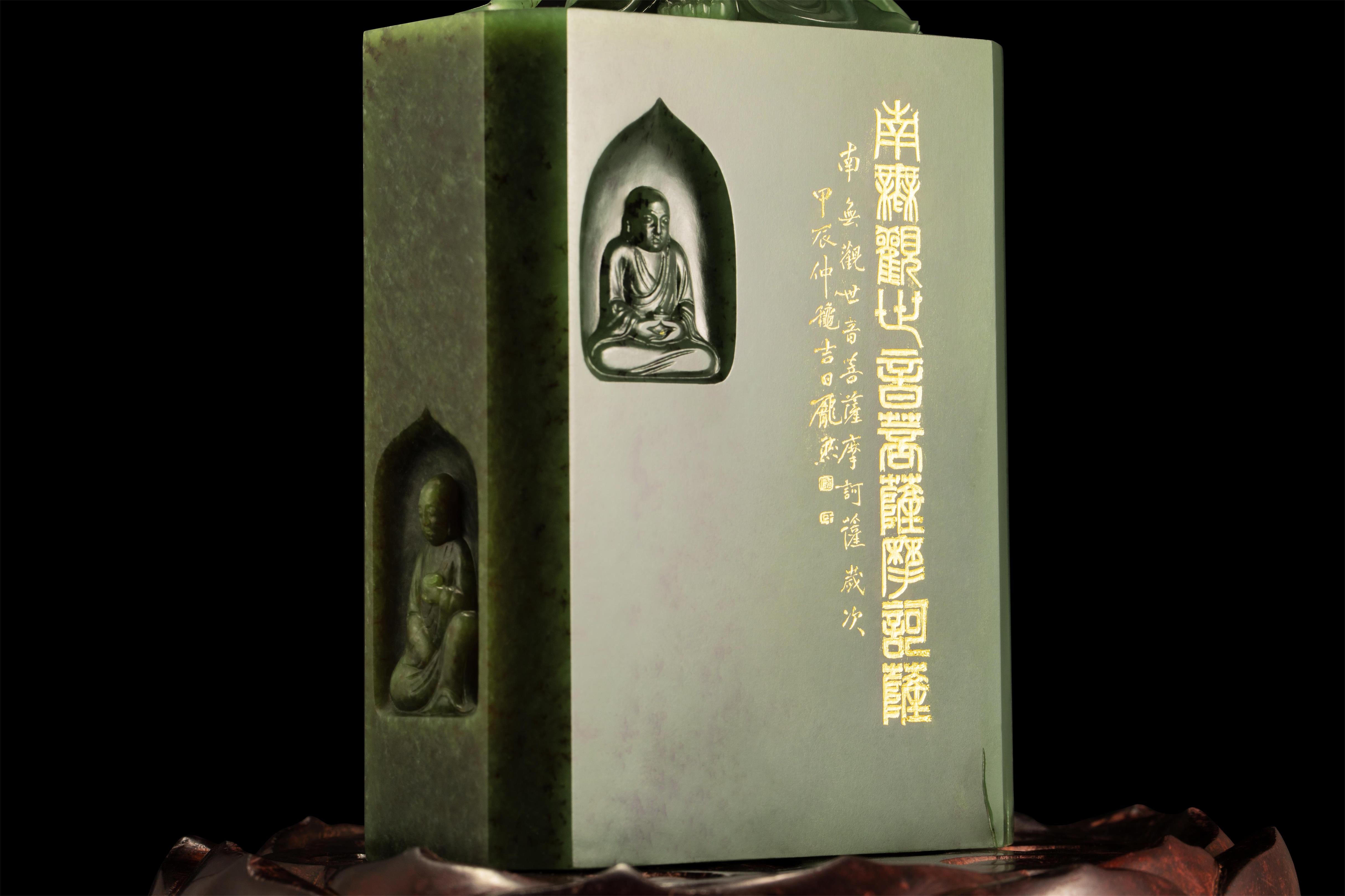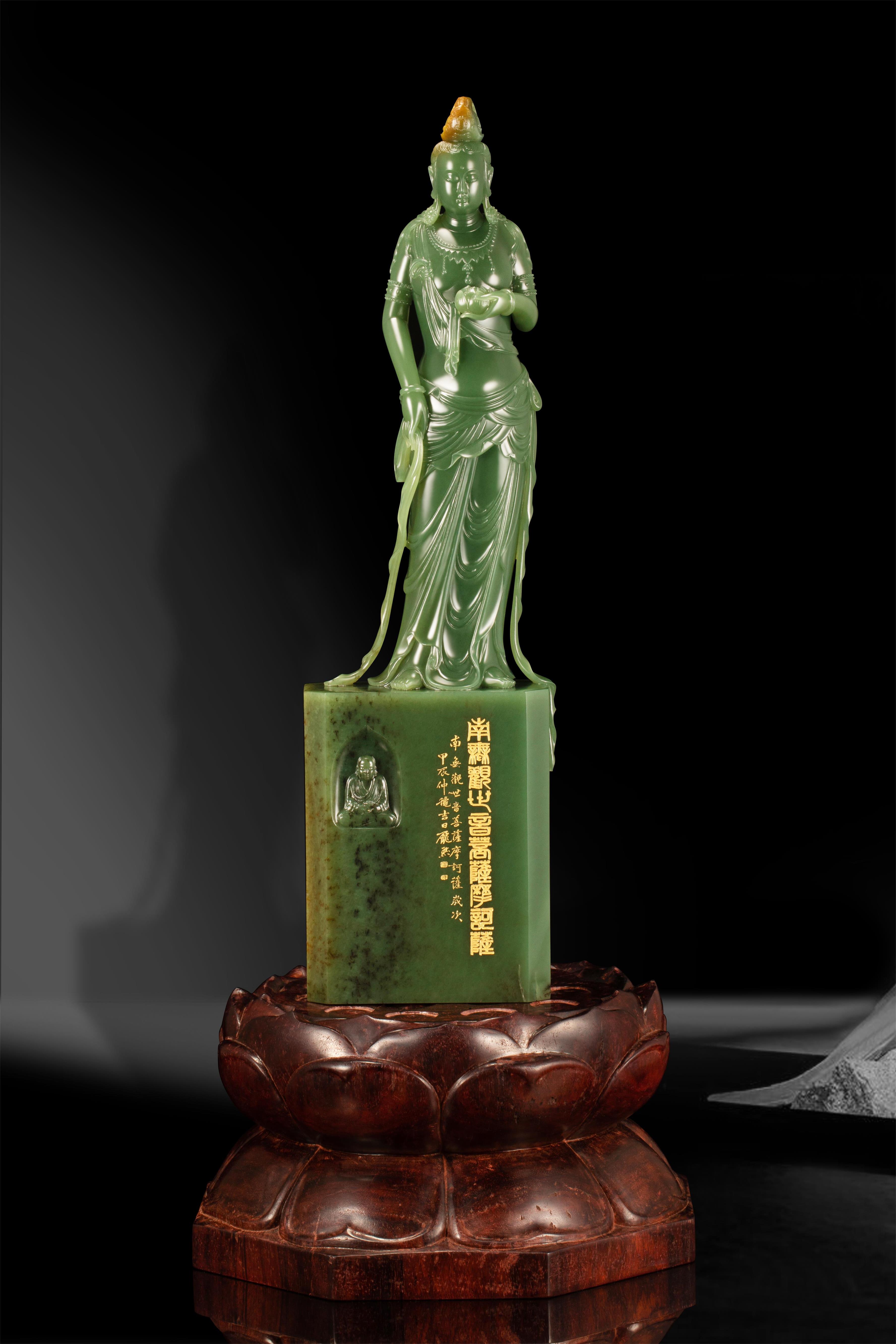 02-02 千璞汇析木玉在新春佳节到来之际,由中国玉石雕刻大师赵泽民设计,鞍山市玉石雕刻大师应永跃制作,中国玉石雕刻大师、河南省工艺美术大师、高级工艺美术师庞然刻字,三位大师合力完成的析木玉立体圆雕作品——《南无持莲观音》,如同一道灵光,为新的一年送来吉祥与好运!