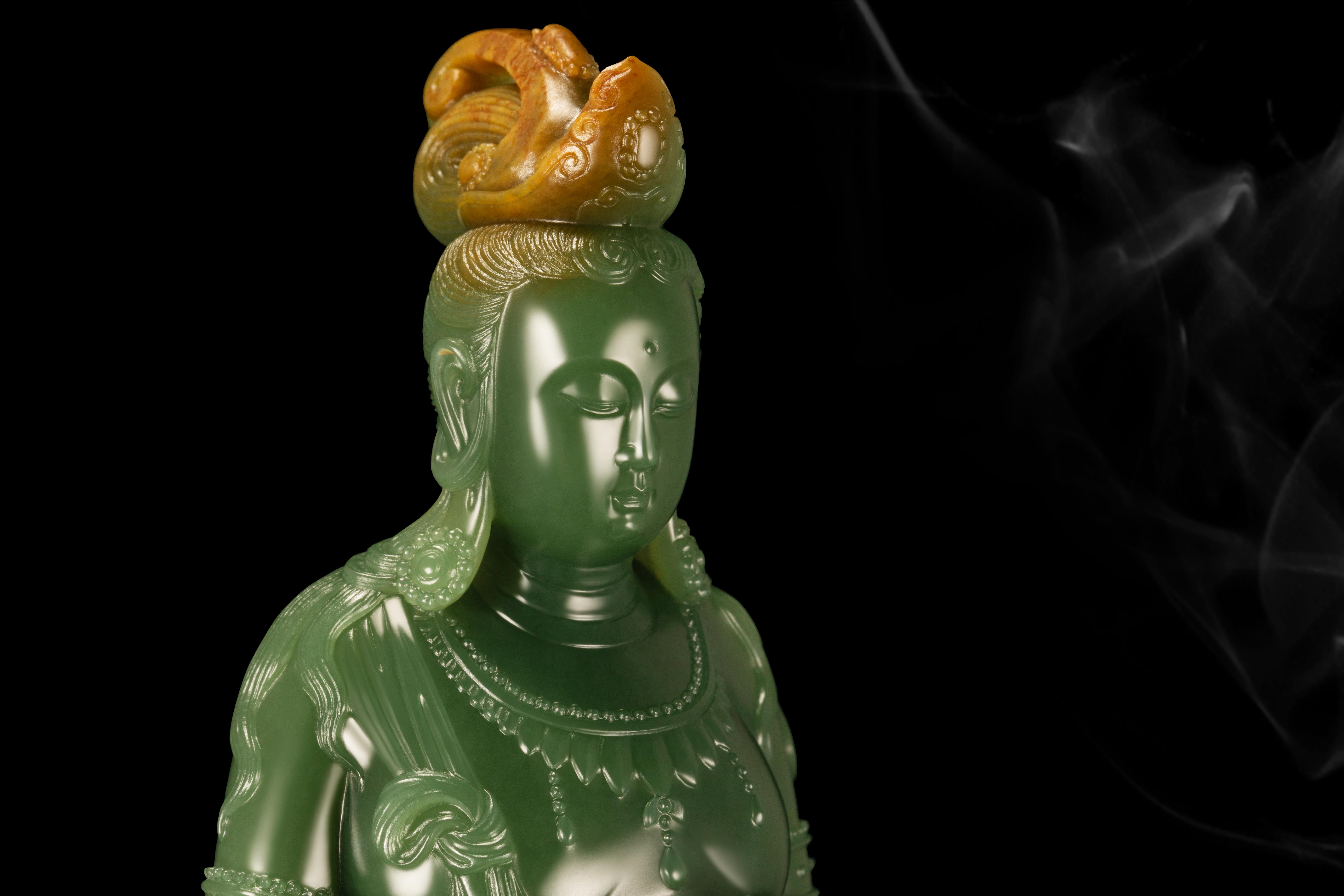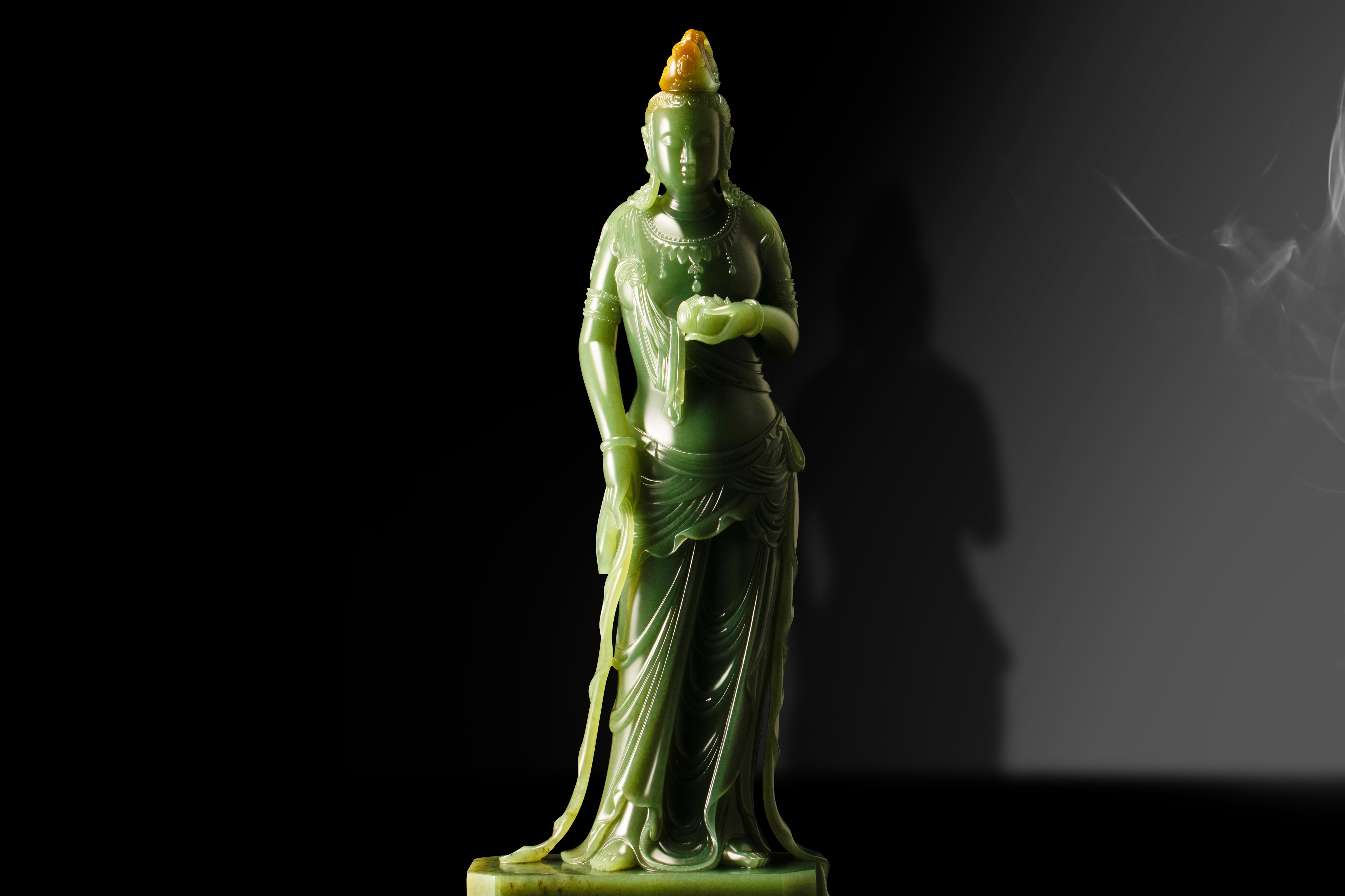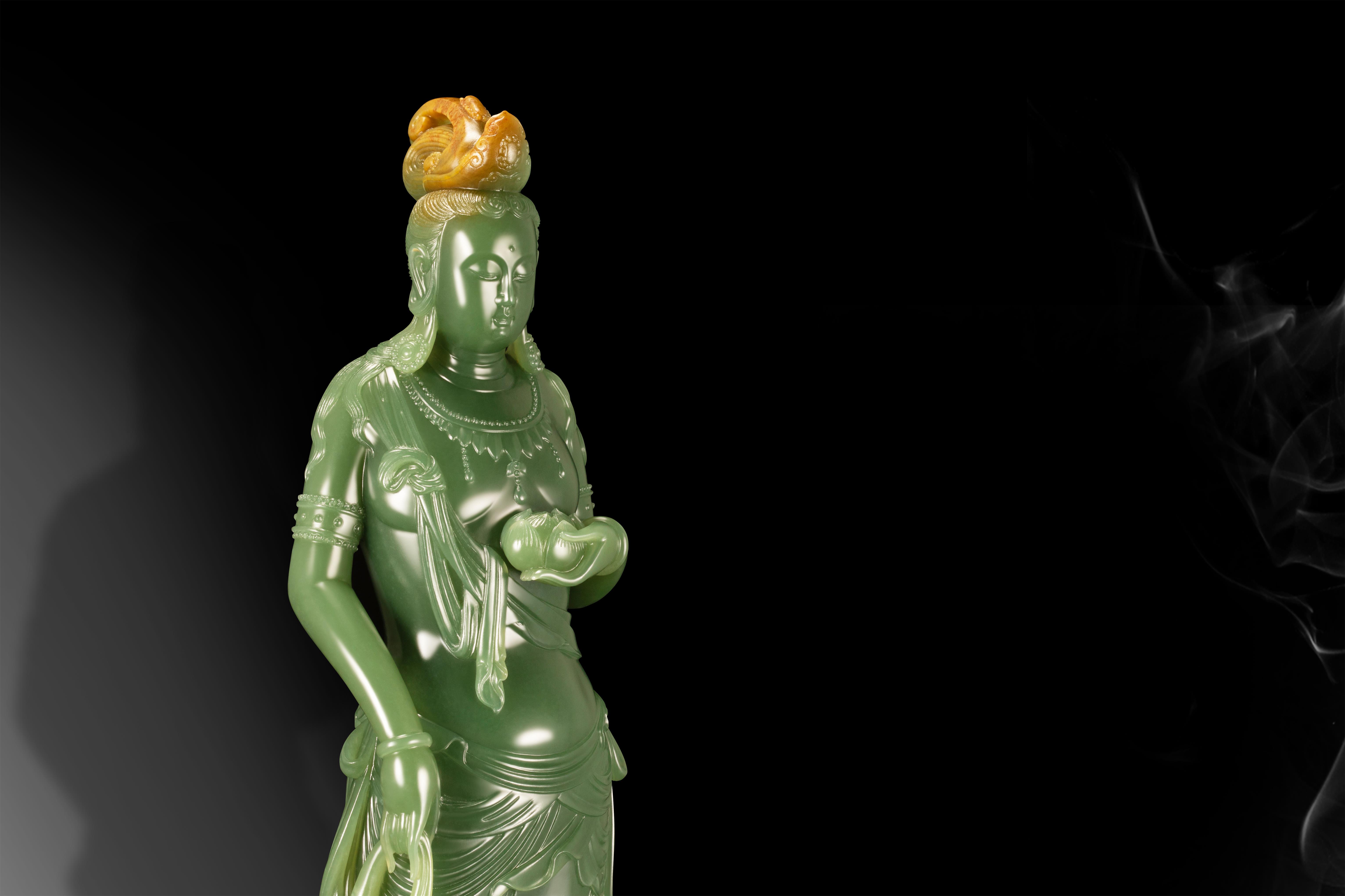 这件作品将传统持莲观音佛造像的庄严与现代设计的巧妙创新完美融合,引领观者于观赏之间,净化心灵、洗涤灵魂。