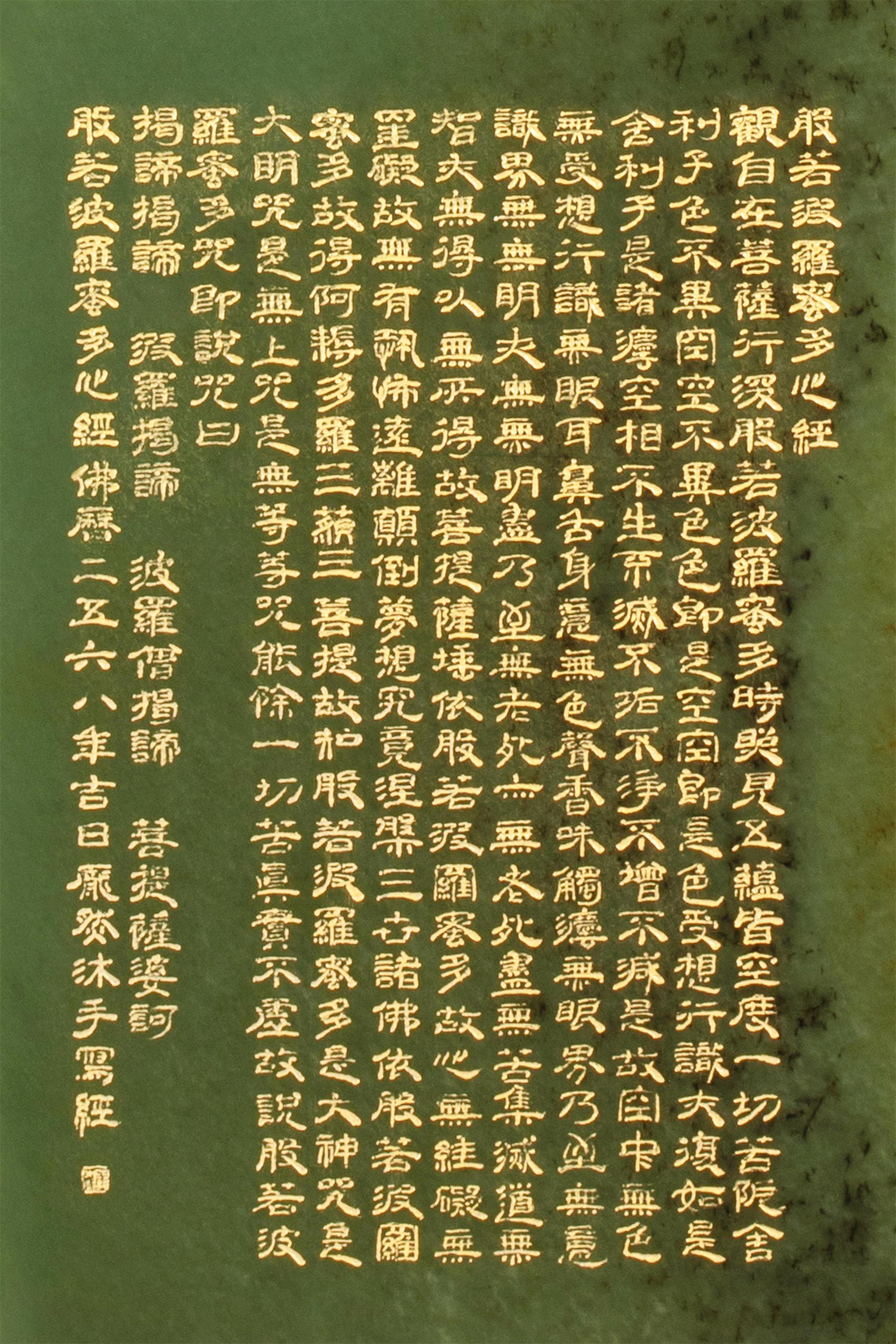 庞然为作品添上点睛之笔,在绿玉经柱上镌刻金字“般若波罗蜜多心经”等铭文,这些文字在光影中熠熠生辉,增添了作品的神秘与庄重,传达着悠久的佛教文化与深邃的人类智慧。这些细节不仅是艺术的展示,更是文化与信仰的传递。