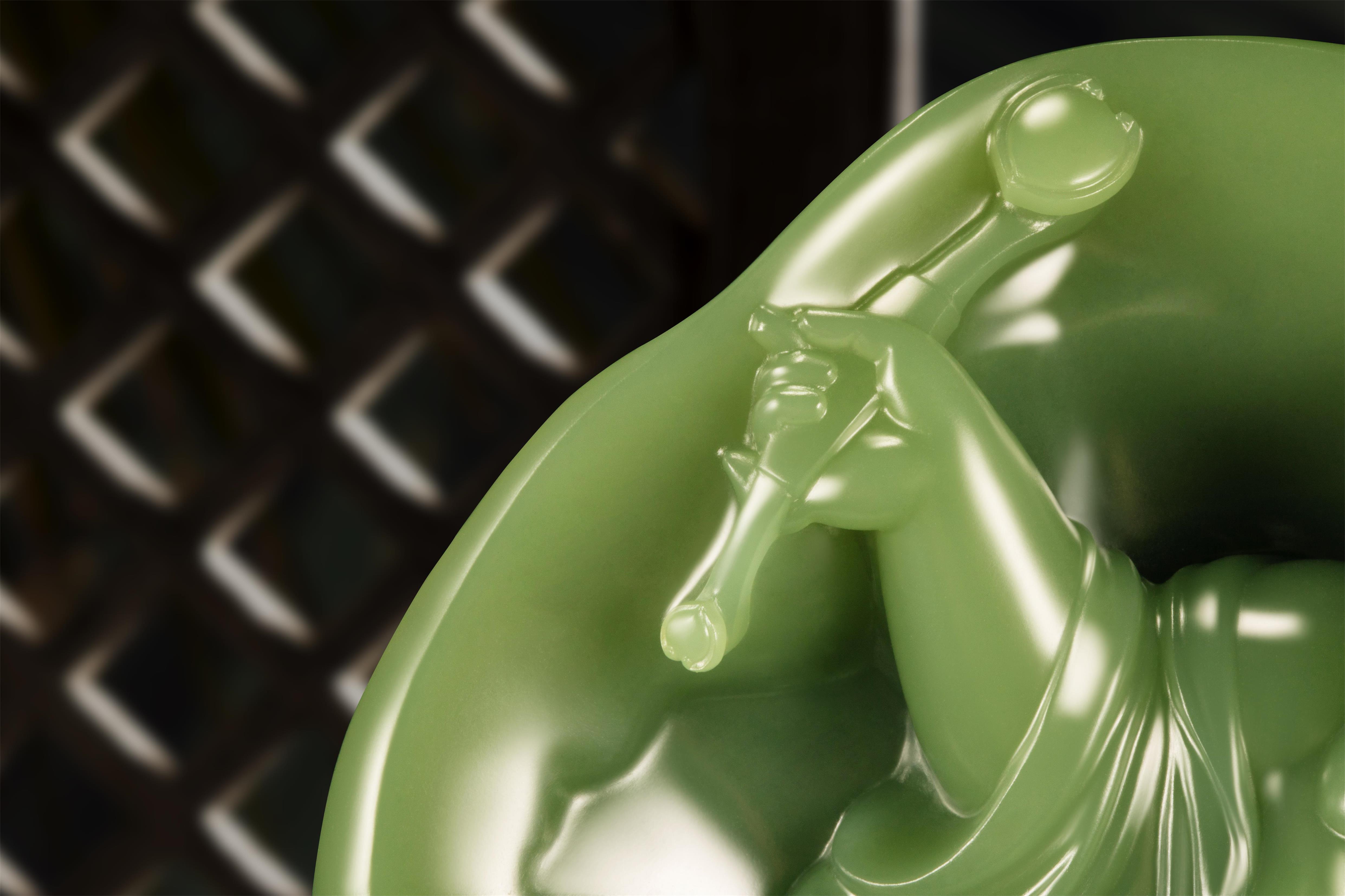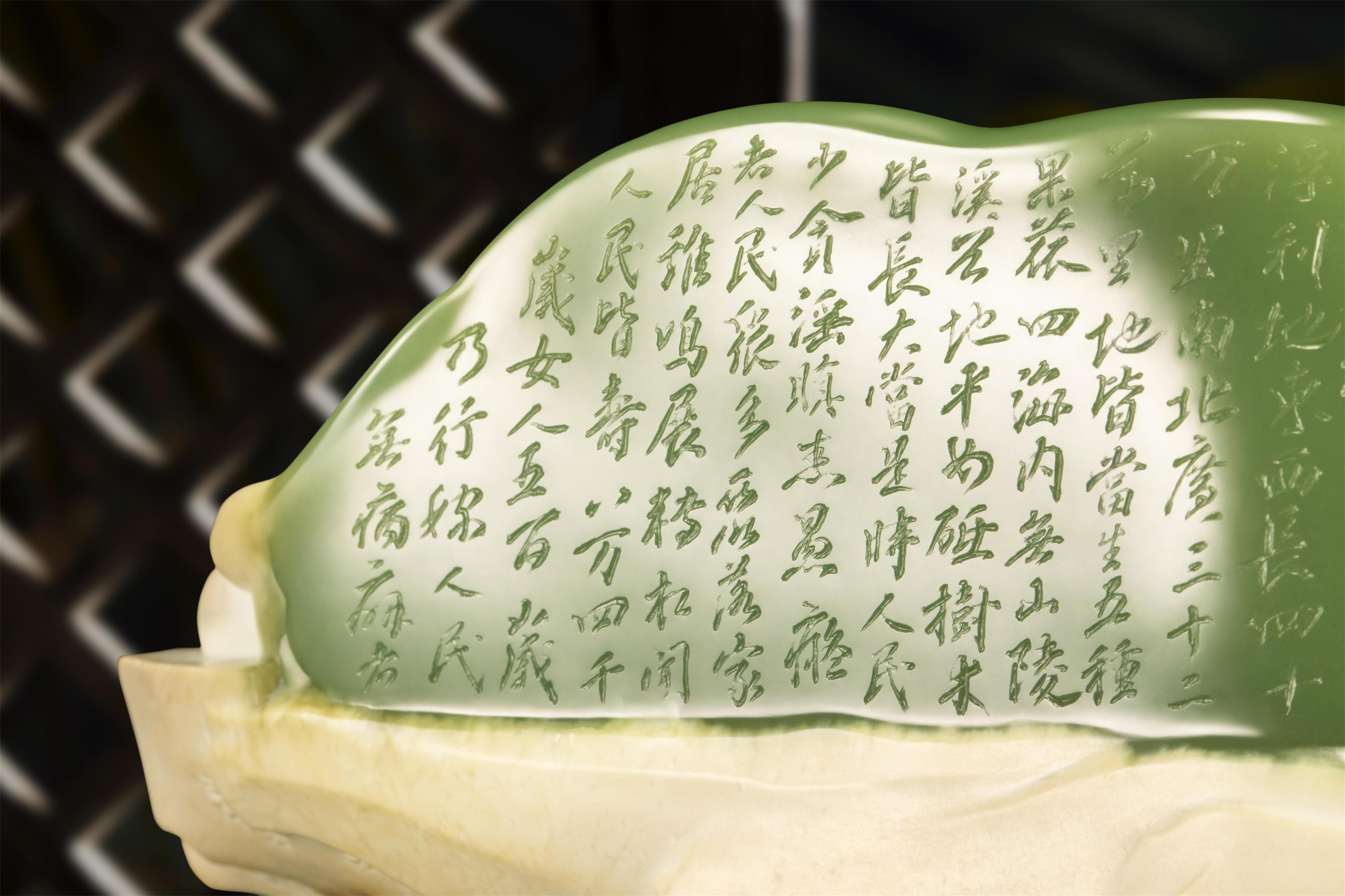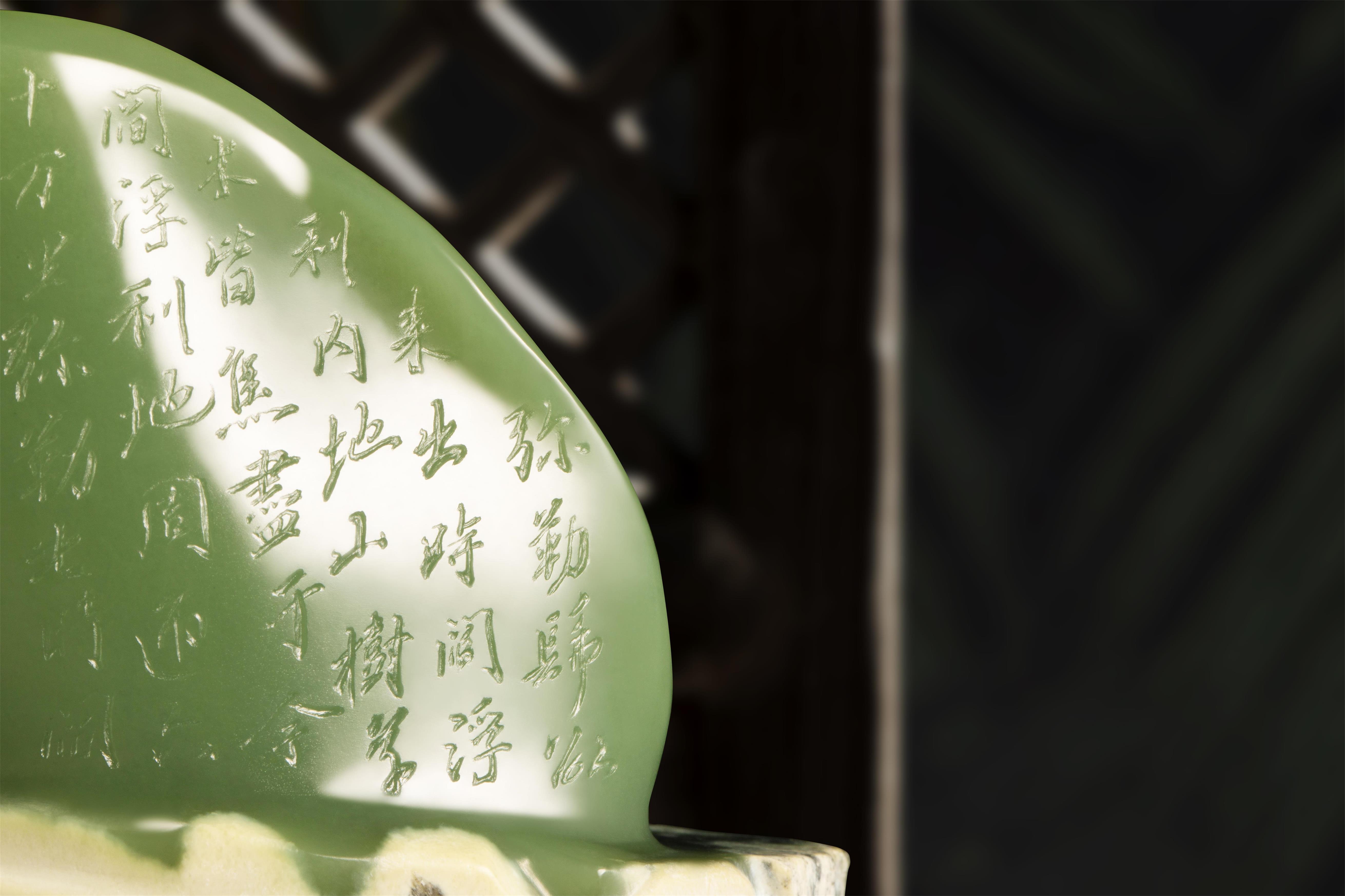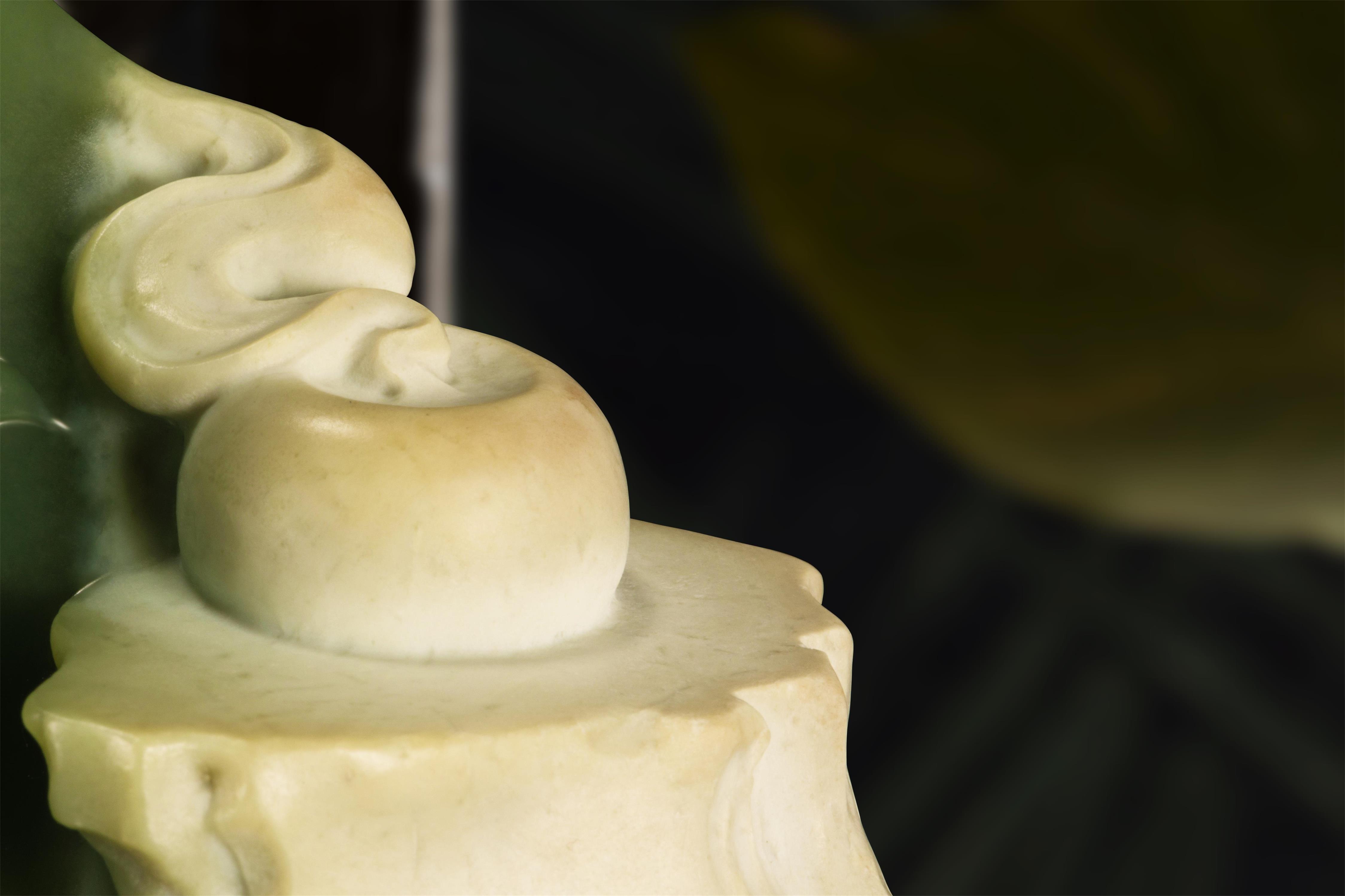雕像底座由磨砂质感的亚克力材料制成,结合透明水纹与白色山石,完美展现了自然与文化的结合,体现出“清水出芙蓉,天然去雕饰”的艺术美感。其水纹象征生命的流动,山石代表坚定的意志,彰显出对比与和谐的哲学思考。这种设计不仅提升了雕像的视觉高度,使人心生敬仰,还架起传统玉石雕刻与现代设计之间的桥梁,展示古今交融之美。