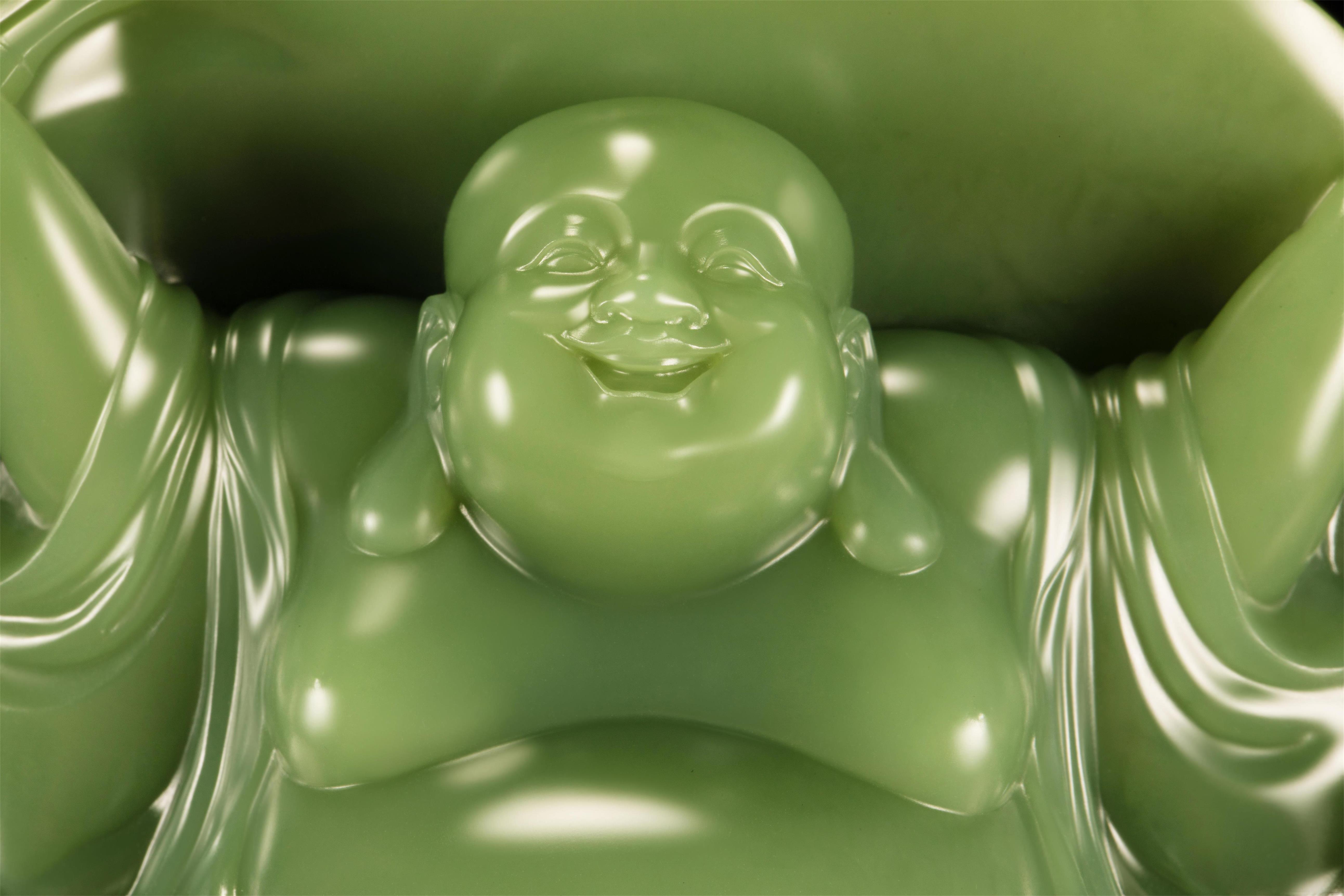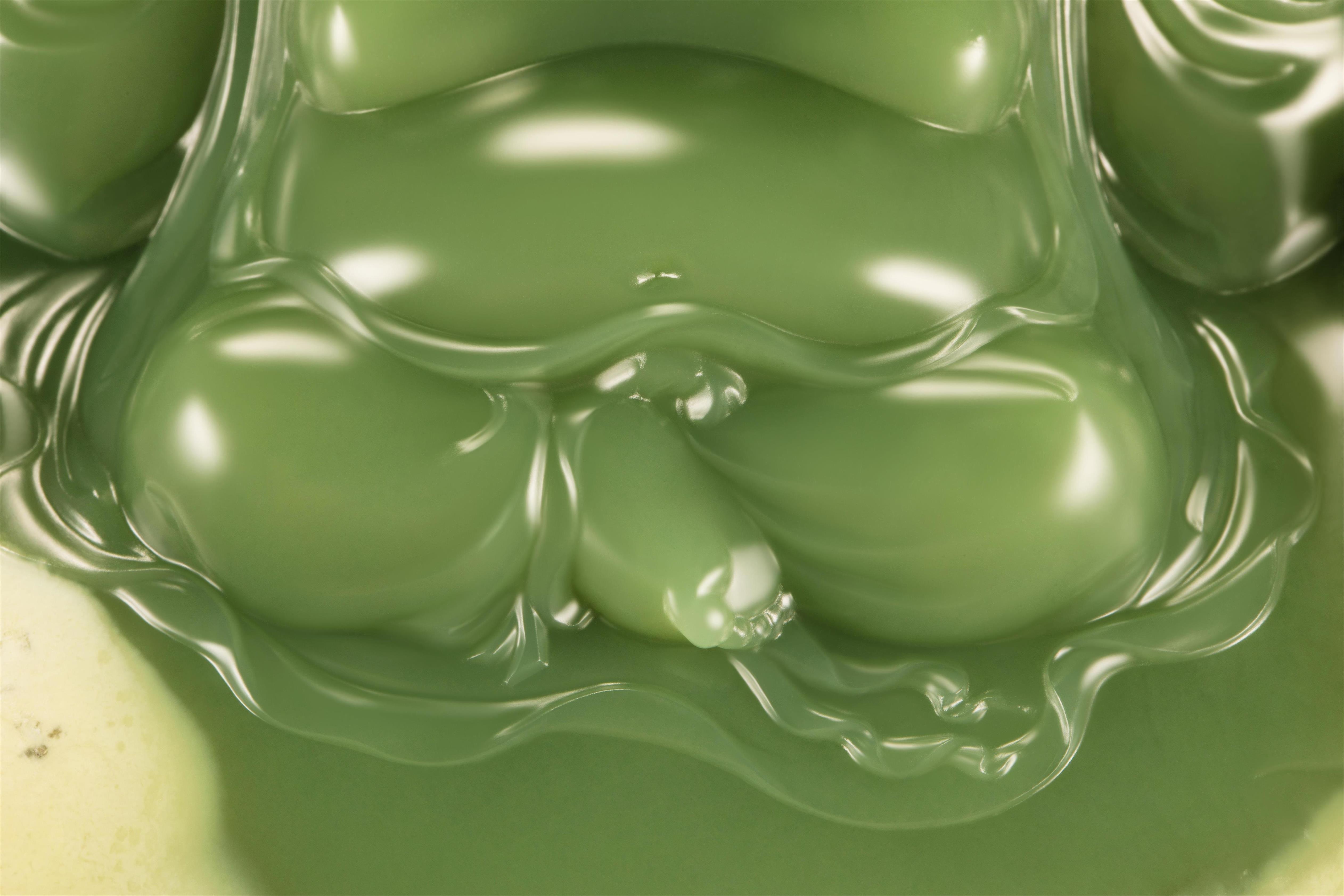 他“海纳百川”的大肚子毫无遮掩,展现出玉质的莹润光泽,也映射出“放下而心生欢喜”的智慧。