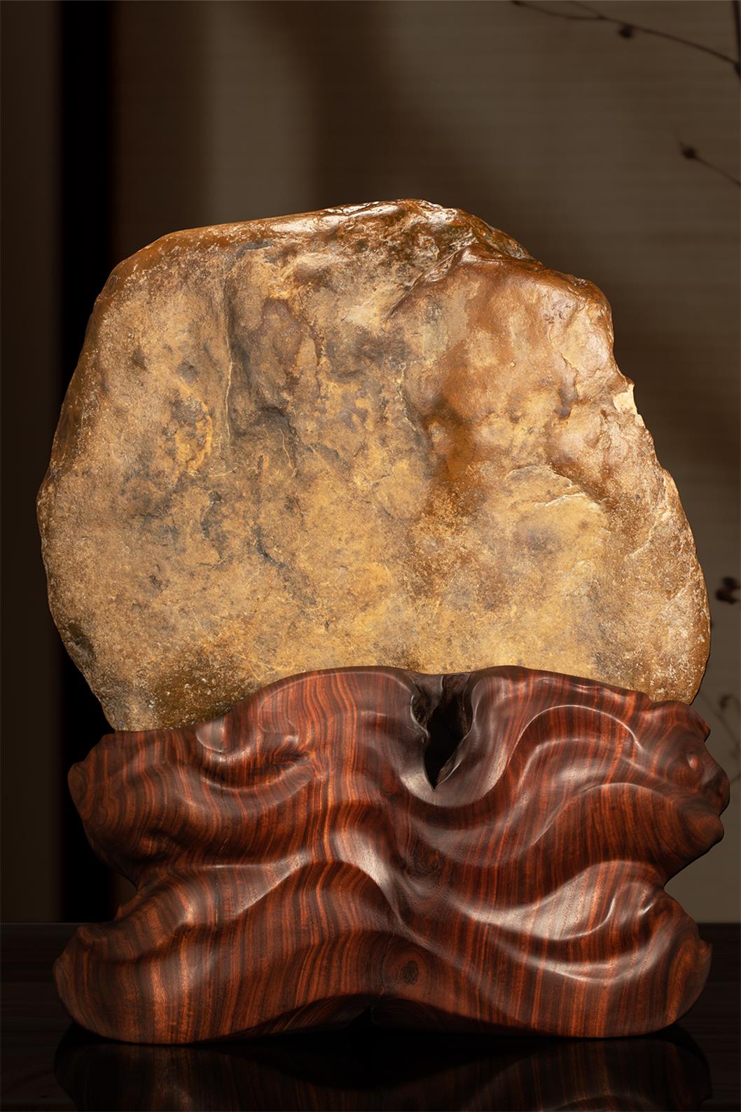 那块天然析木玉料上斑驳的绺裂与金黄的皮色,在他“因势象形”的东方美学观照下,蜕变为承载千年智慧的立体画卷,构建起自然造化与人文精神的对话!