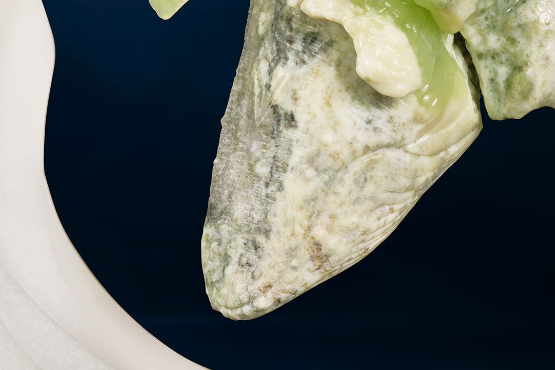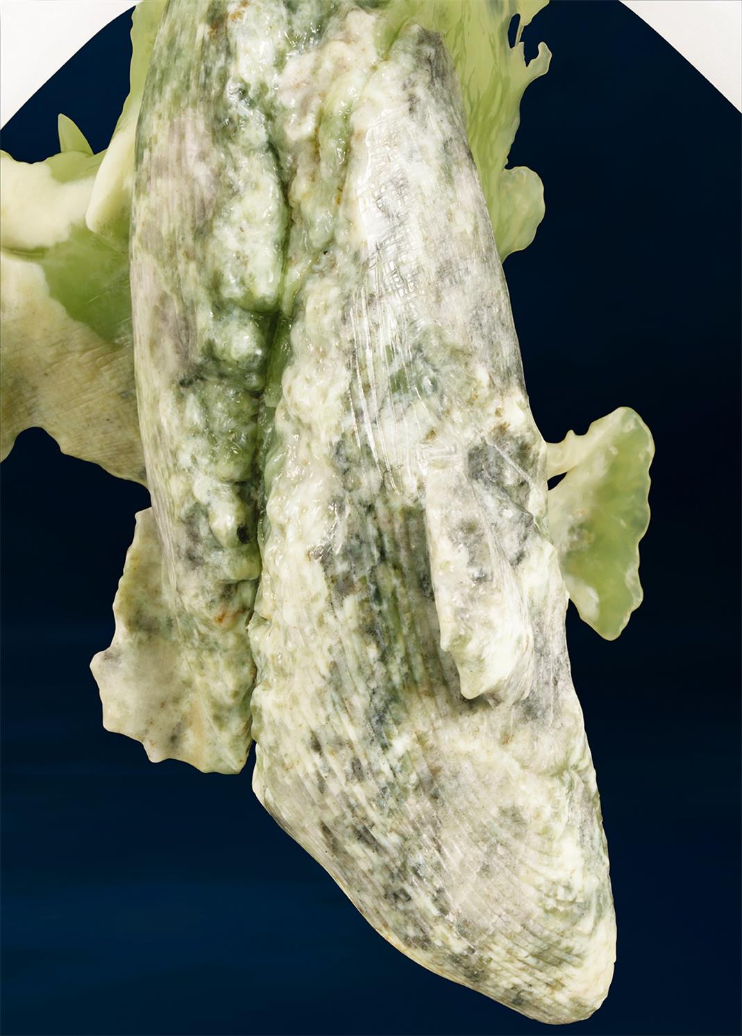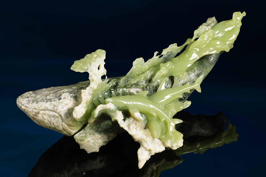 他用劲朗的刀触,刻画出斑驳沧桑的皮色肌理,一条条纹路仿佛岁月的沉淀,承载着生命的厚重与坚韧。于是,古老礁石般的苍老花肉,被雕琢成有亿万年海洋记忆的大虎鲨。