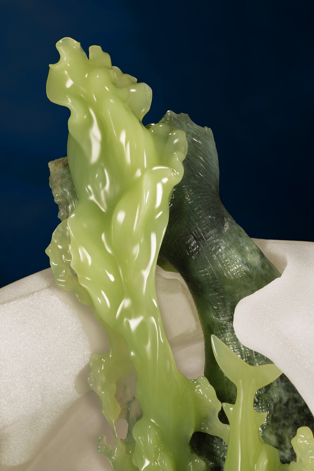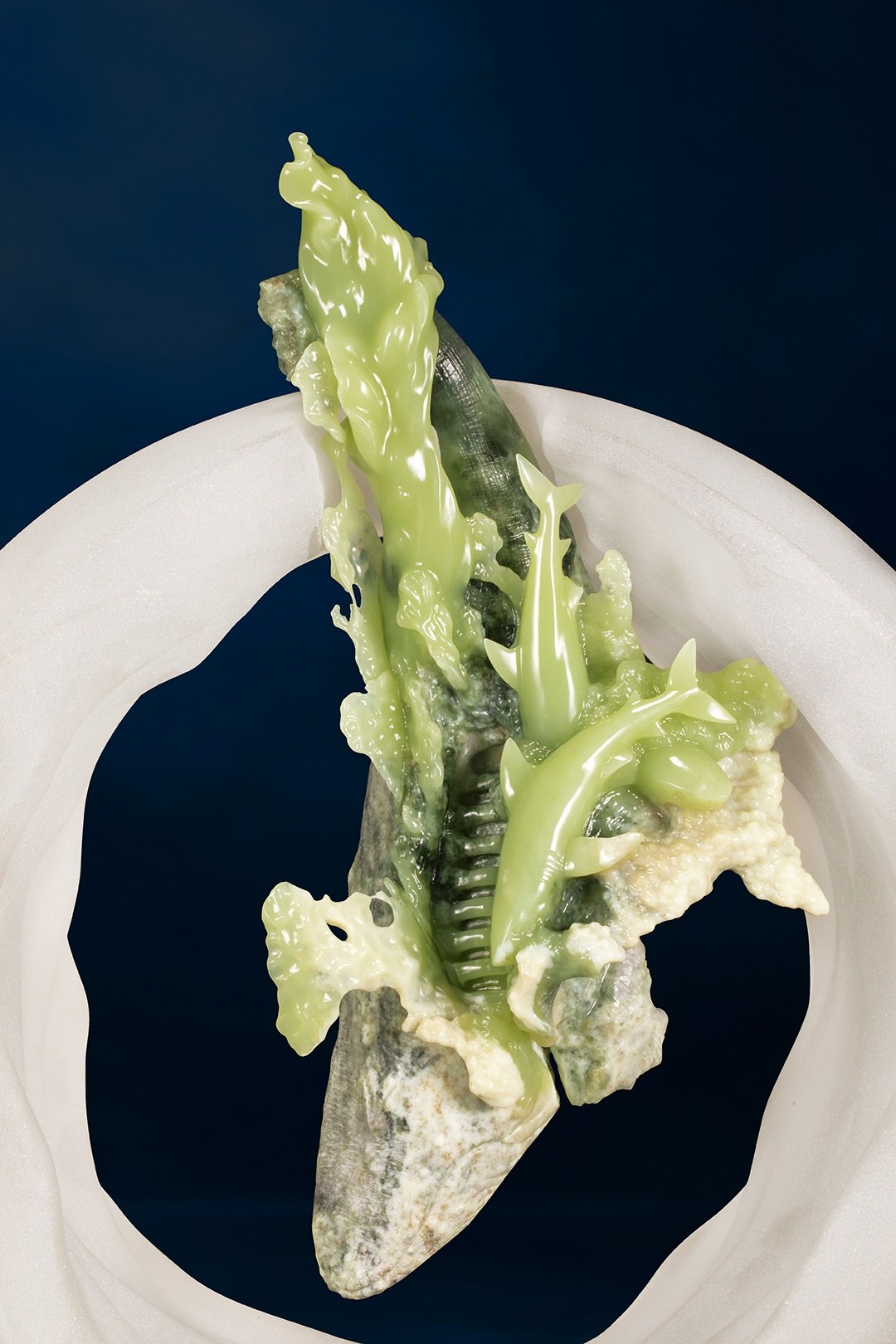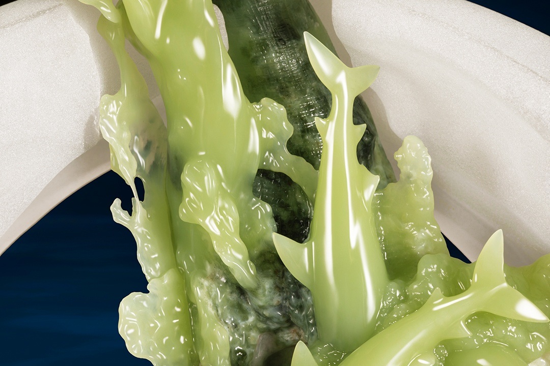 大虎鲨身侧,通体莹润的嫩绿玉肉则化作身姿轻盈、欢快畅游的幼鲨,母子间爱意流转,与海潮和鸣,满溢温馨与希望。
