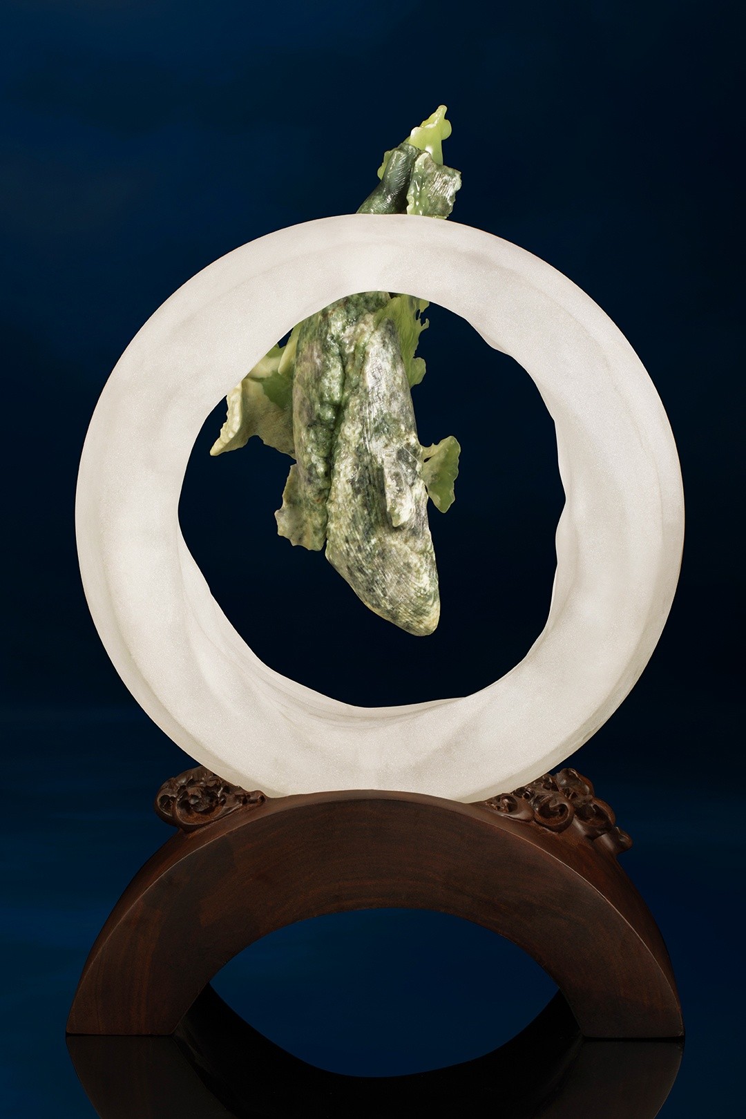 唐勇还突破传统玉雕“因形就势”的局限,引入人造水晶打造圆形外框,以经纬脉络勾勒出“水球”的宇宙图式,宛如打开神秘宇宙之门,将《山海经》“海内西经”的浩渺想象化为可触摸的微观宇宙。