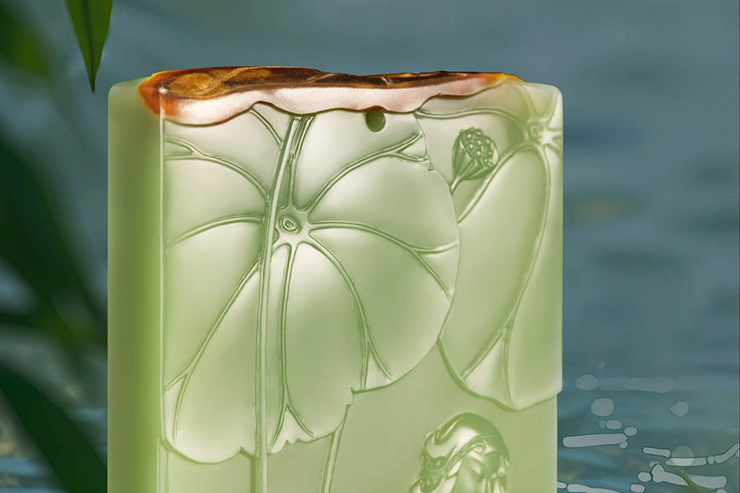 在这充满生机的时节,中国玉石雕刻大师、国家级非物质文化遗产(海派玉雕)代表性传承人翟倚卫,以其独具匠心的艺术笔触,将“惟有绿荷红菡萏,卷舒开合任天真”的美妙景致,深情镌刻于温润的玉石之上,敬献给玉友们《舒卷菡萏》这一玉雕杰作。