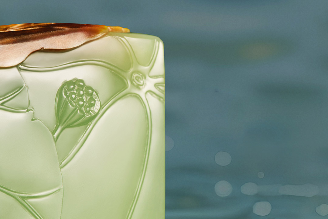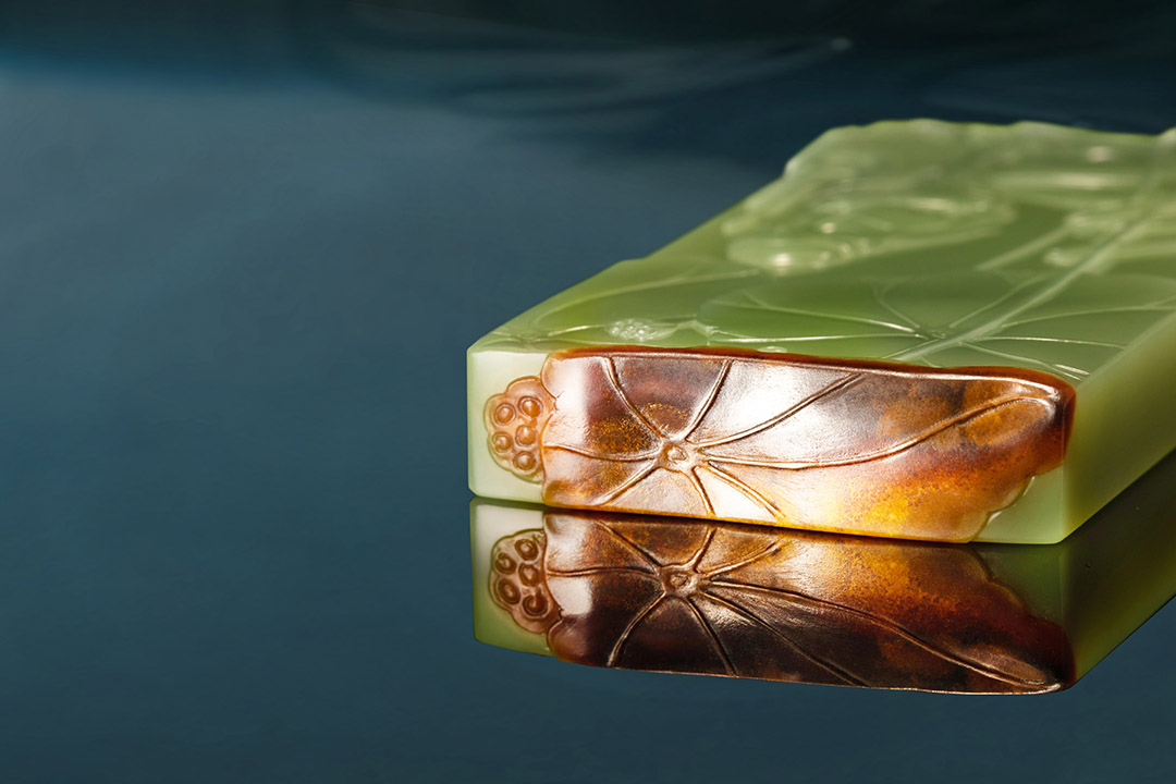 接着,他采用“去装饰化”的极简线条,以精湛的深浅浮雕技法,精心雕琢荷叶自然生动的舒展姿态。