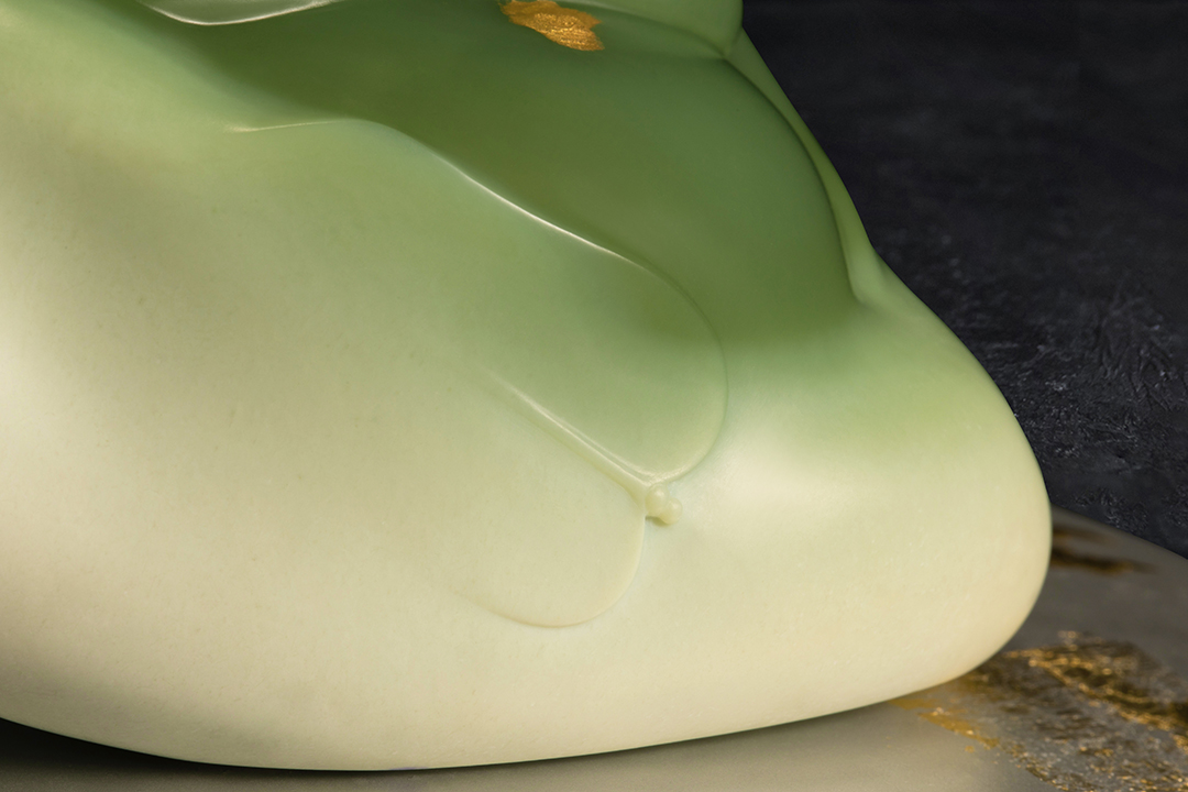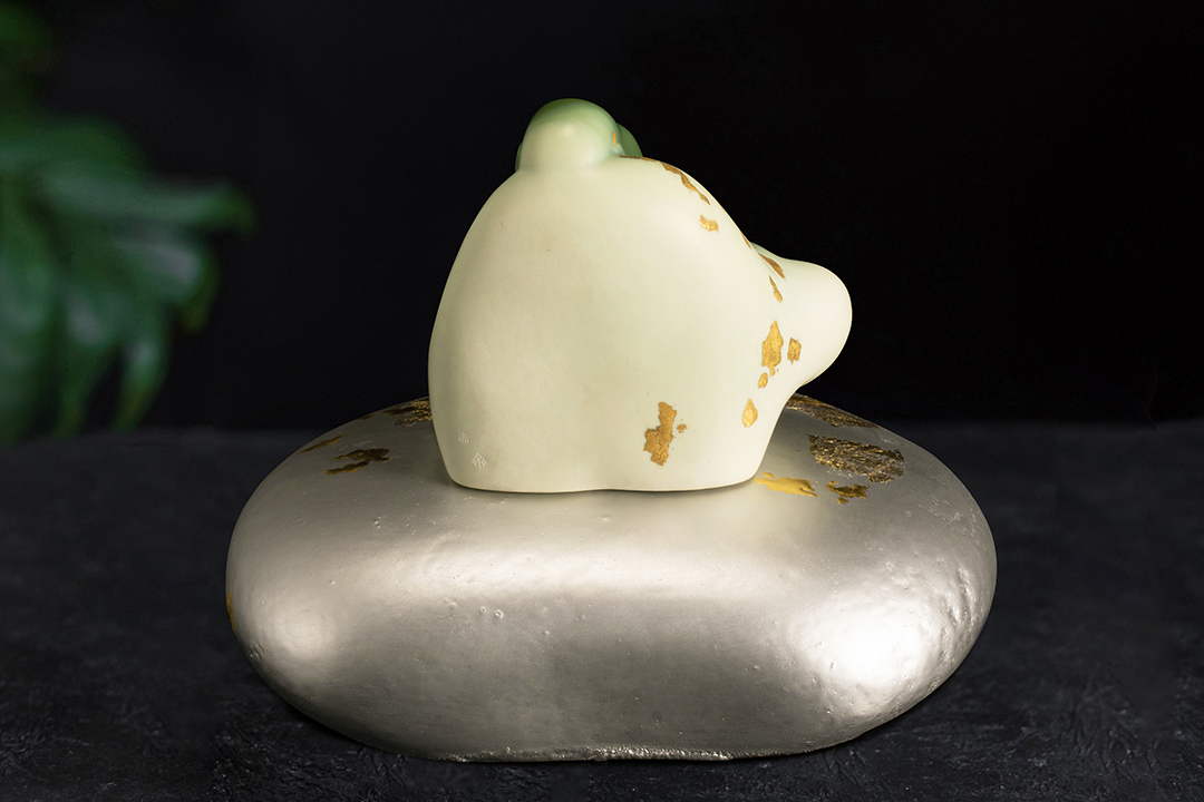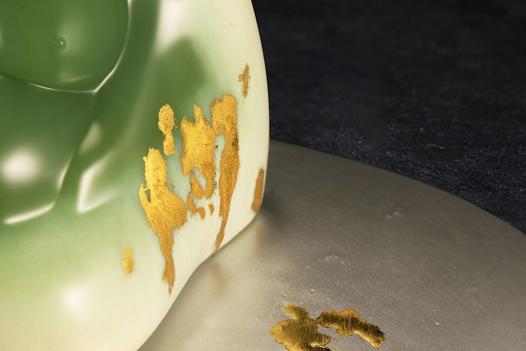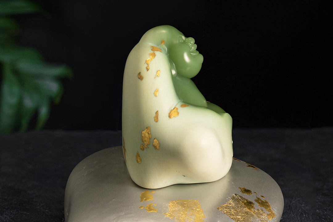 作品底座,是戈壁风砺石,表面粗粝,镌刻着岁月沧桑,与玉雕的温润形成强烈对比,恰似生活的艰辛与慈爱的温柔相互交织。而嵌入银粉和金箔的“金缮工艺”,源自唐代的智慧,在此焕发出新的光彩,象征着母爱的永恒光辉,也提醒着我们以谦卑之心体悟“金屑虽贵,入眼成翳”的佛理。这“金玉共生”的意象,宛如夜空中的星辰,璀璨却需用心感受。