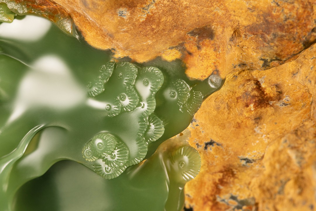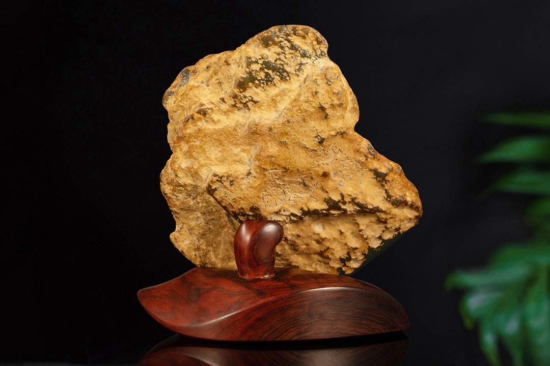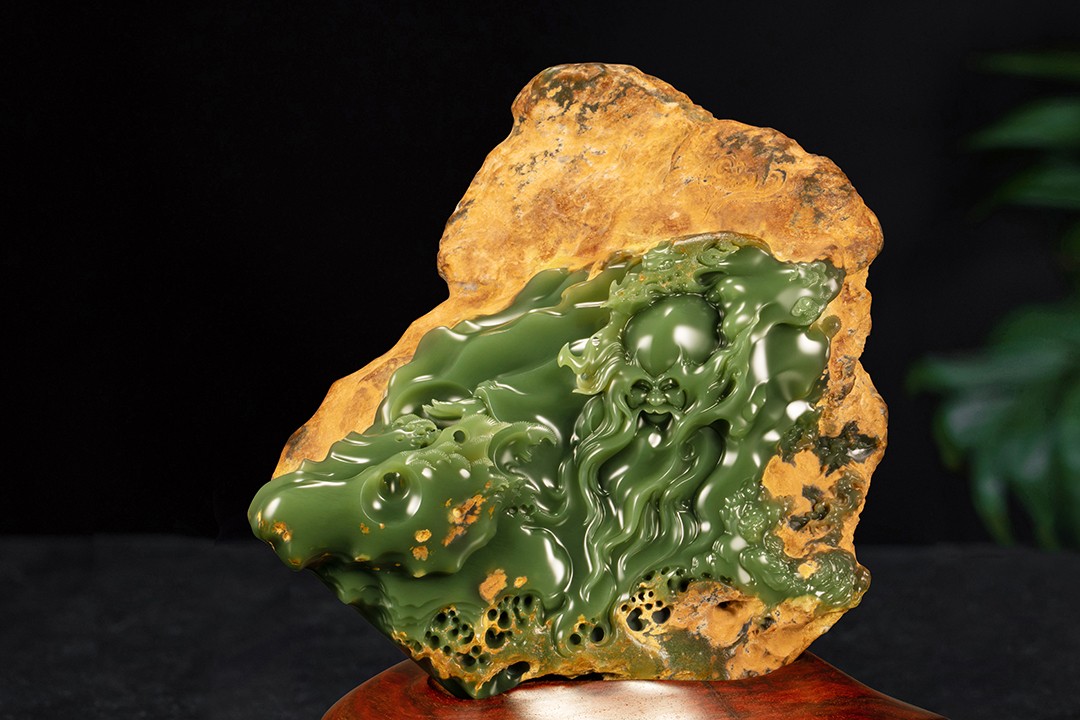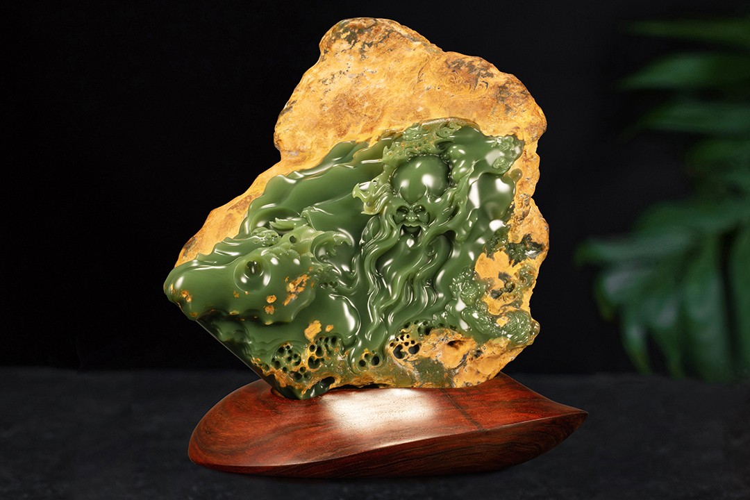 作品选用的析木玉原石展现出惊人的自然馈赠:深绿色玉肉如苍翠山峦般浑厚,褐黄皮色似岁月包浆般温润,天然孔洞与纹理恰似山间云雾与河流脉络。