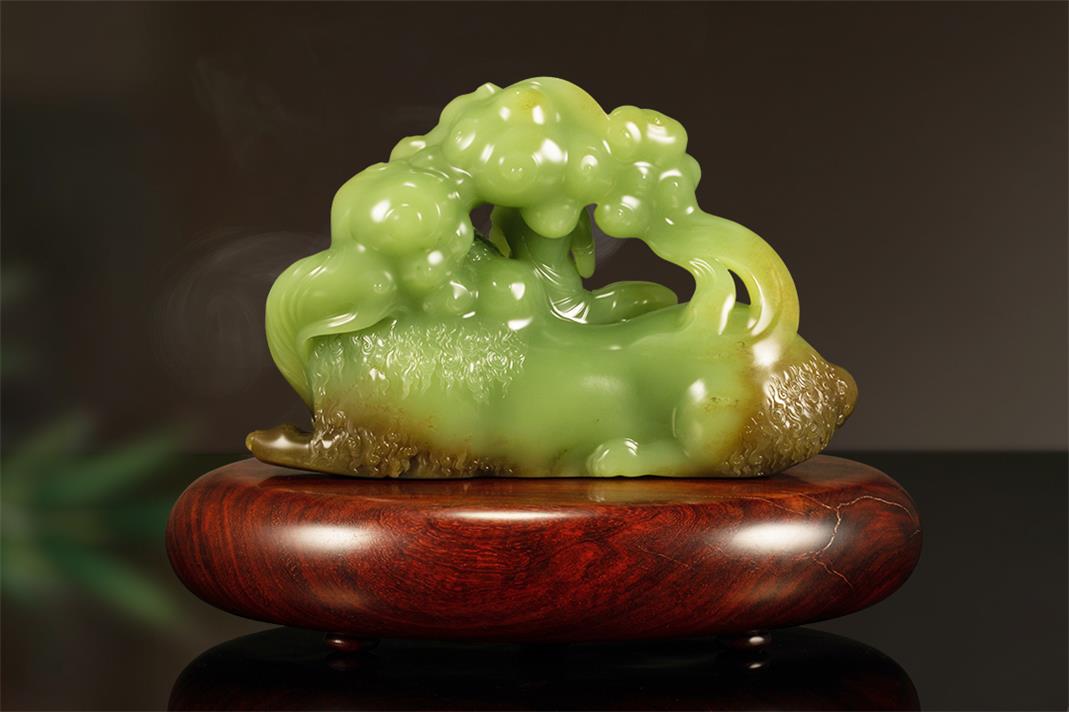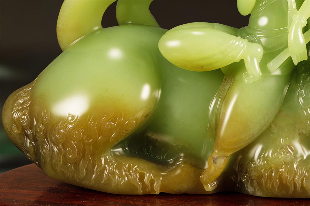 作品主体玉色黄绿,质感纯净细滑,气度古朴高雅,向底部渐变呈现出的红褐色“麻糖”,如凝固的琥珀蜜蜡,与青玉部分形成冷暖色调的哲学对话,展现出大自然的神奇与美妙。