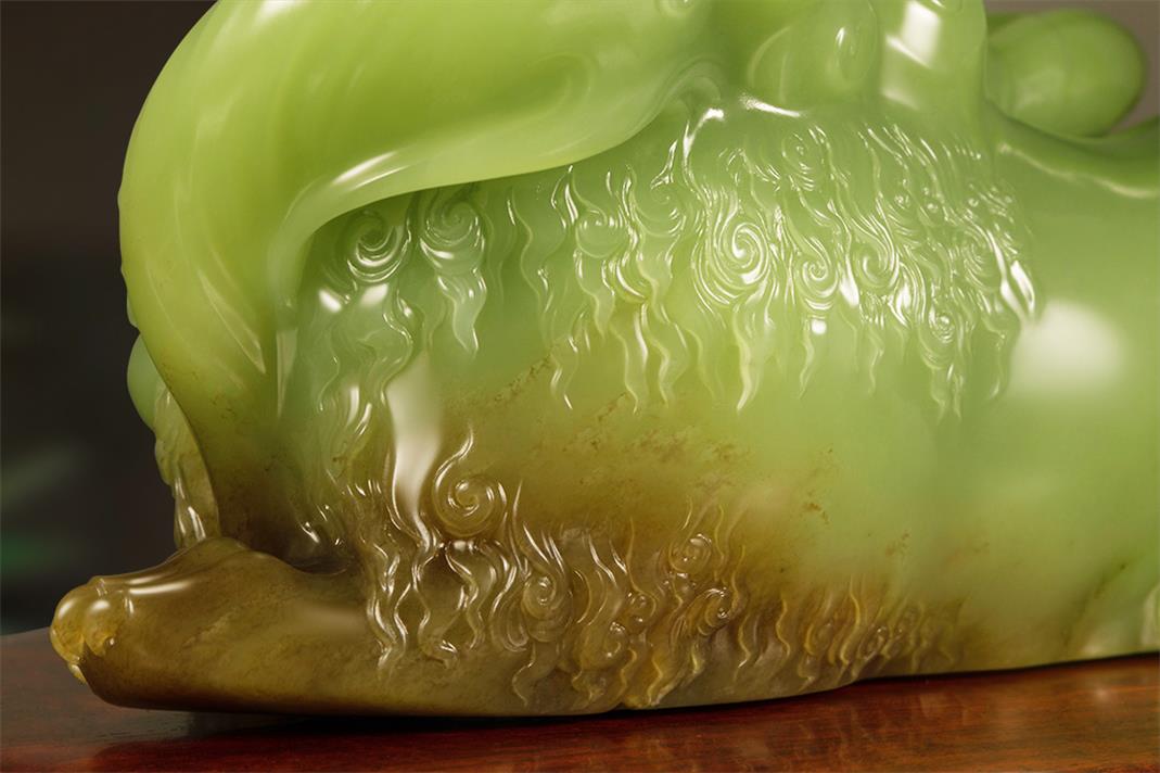 夸张的狮首造型中,青玉雕琢的瞳孔如深潭倒映星河,透着清澈的威凛和深邃的智慧,凝视间使人仿佛洞察了世间的一切。