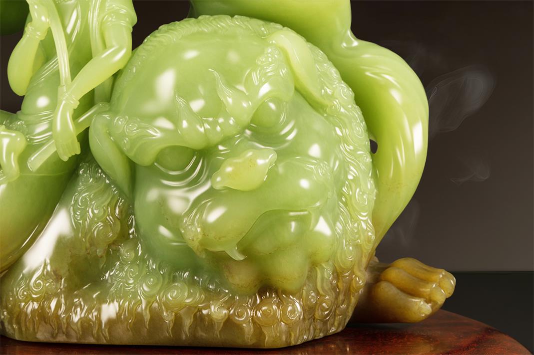 作品以文殊菩萨骑乘青狮的立体圆雕造型呈现,寓意文殊菩萨以智慧利剑斩断烦恼,以狮吼威风震慑魔怨,表达出佛法予以众生的保护和指引。