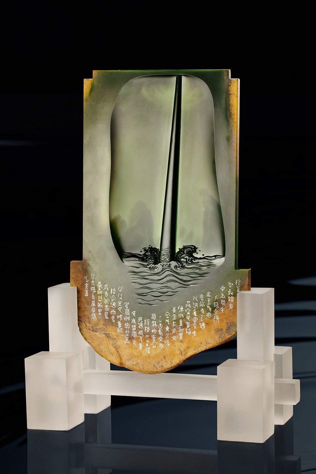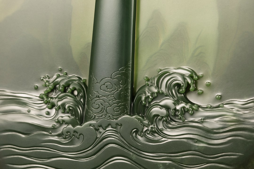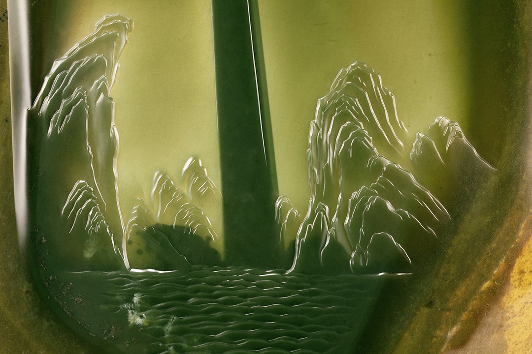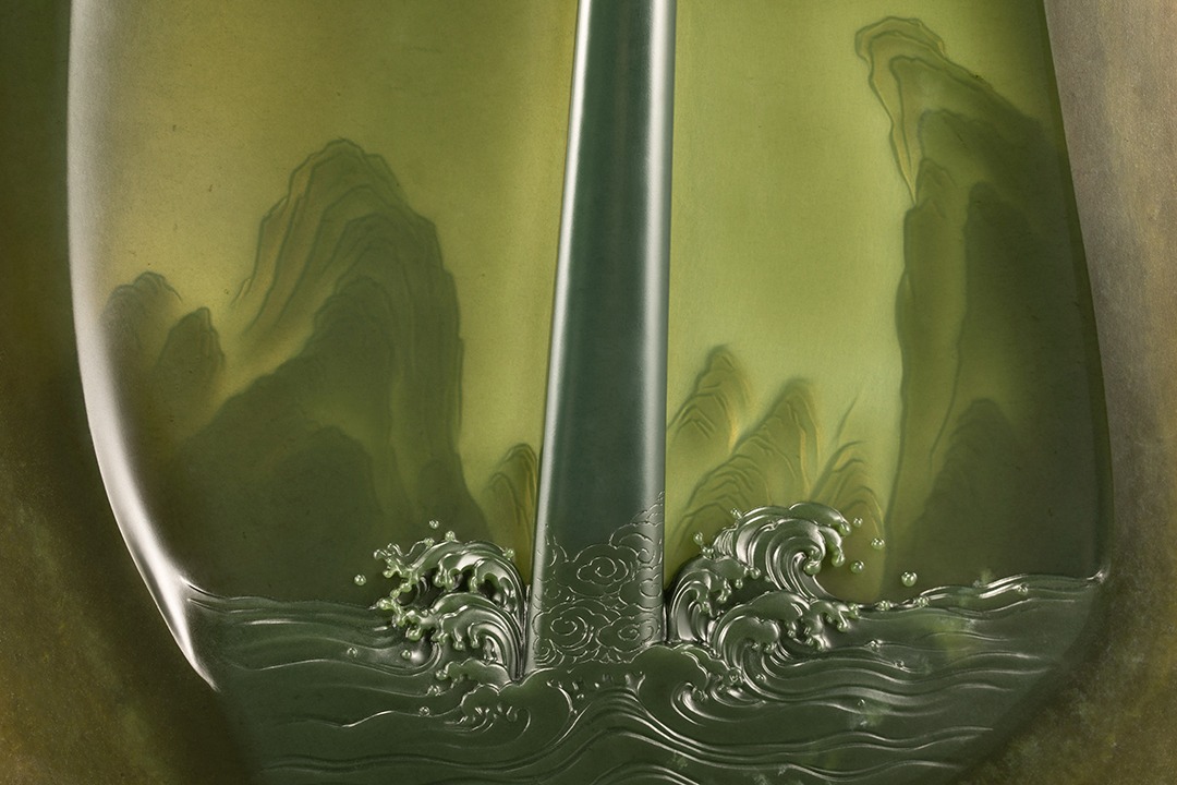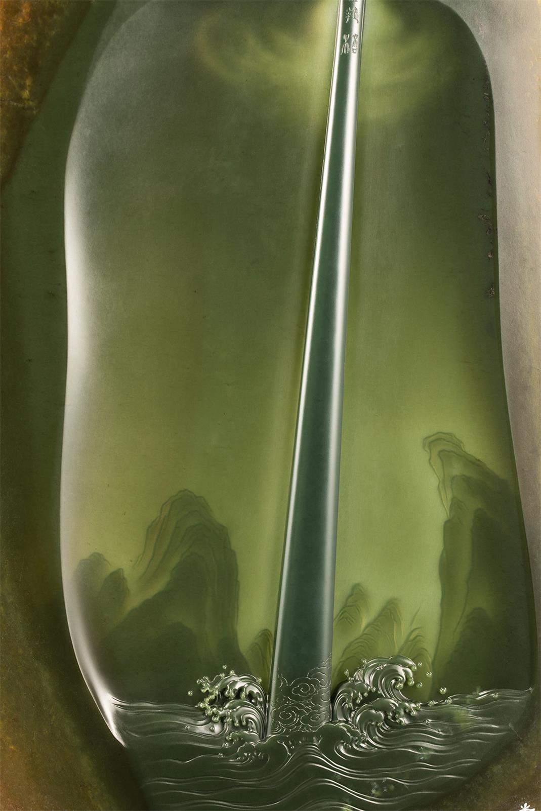 作品背面,远近景深的奇竣山峦,在玉质肌理间若隐若现,海天辽阔的意境如呼吸般起伏,传达出“定山海”的愿望,以及无边的力量感和影响力。