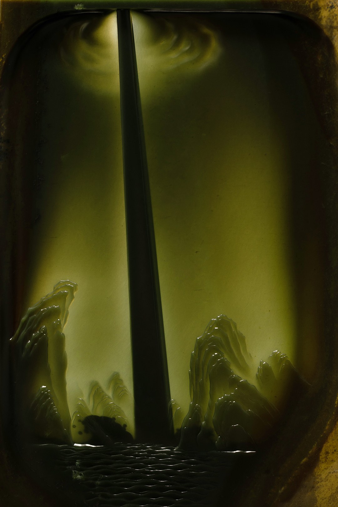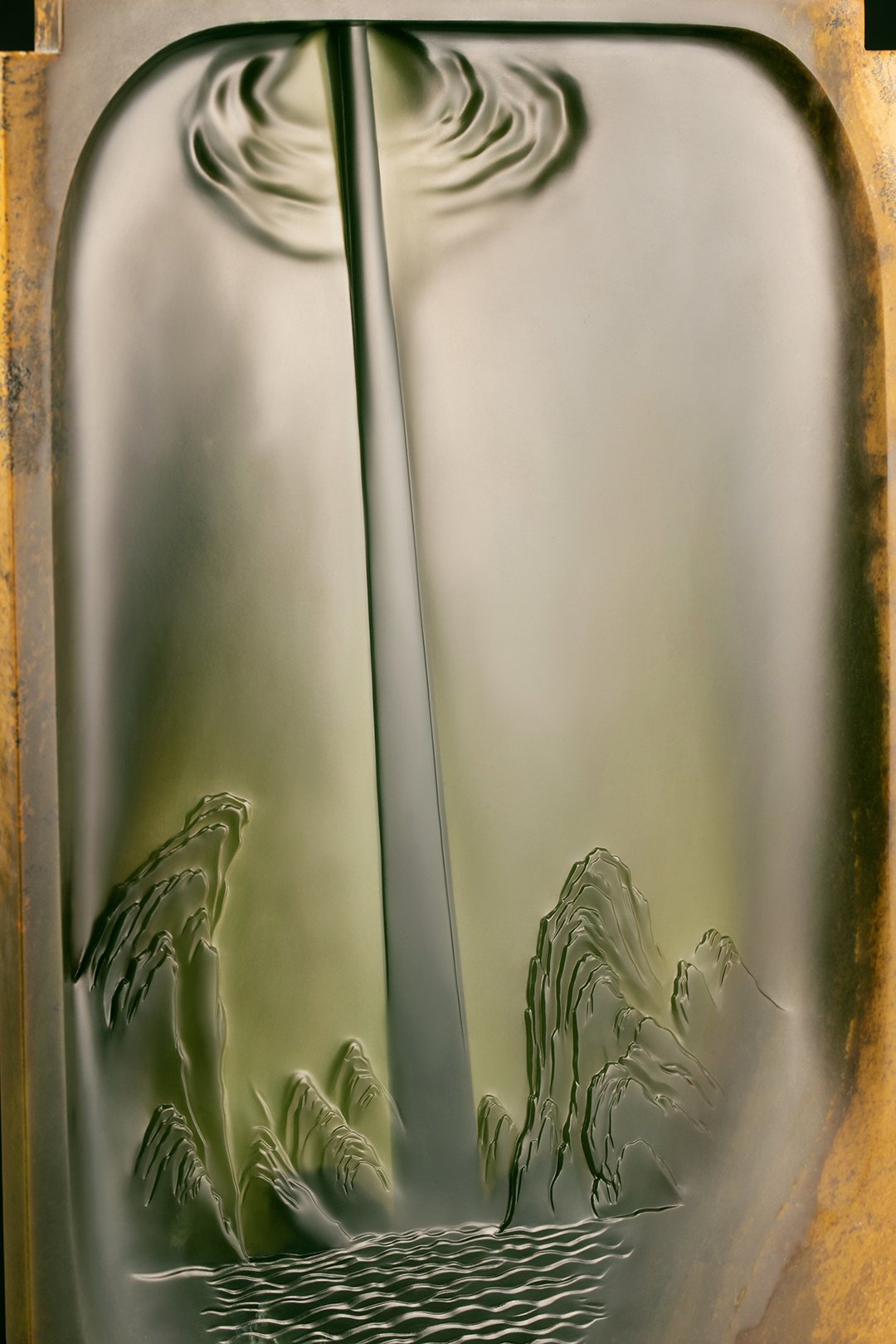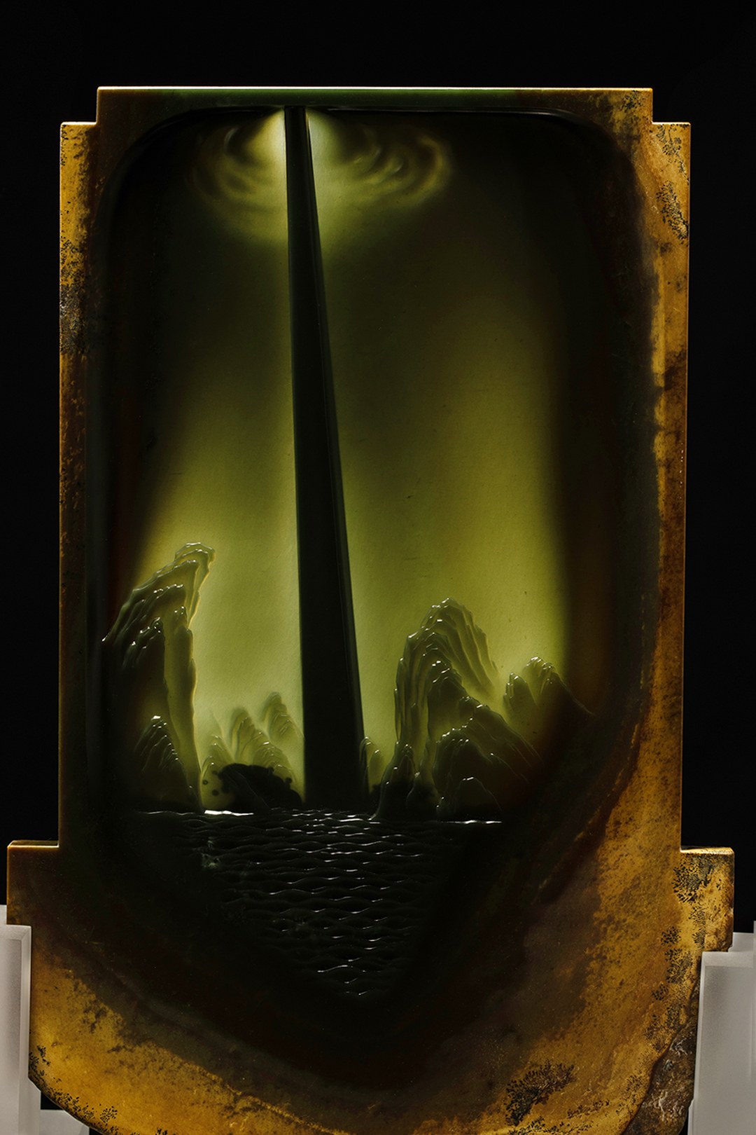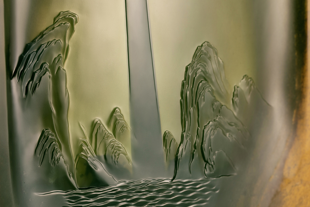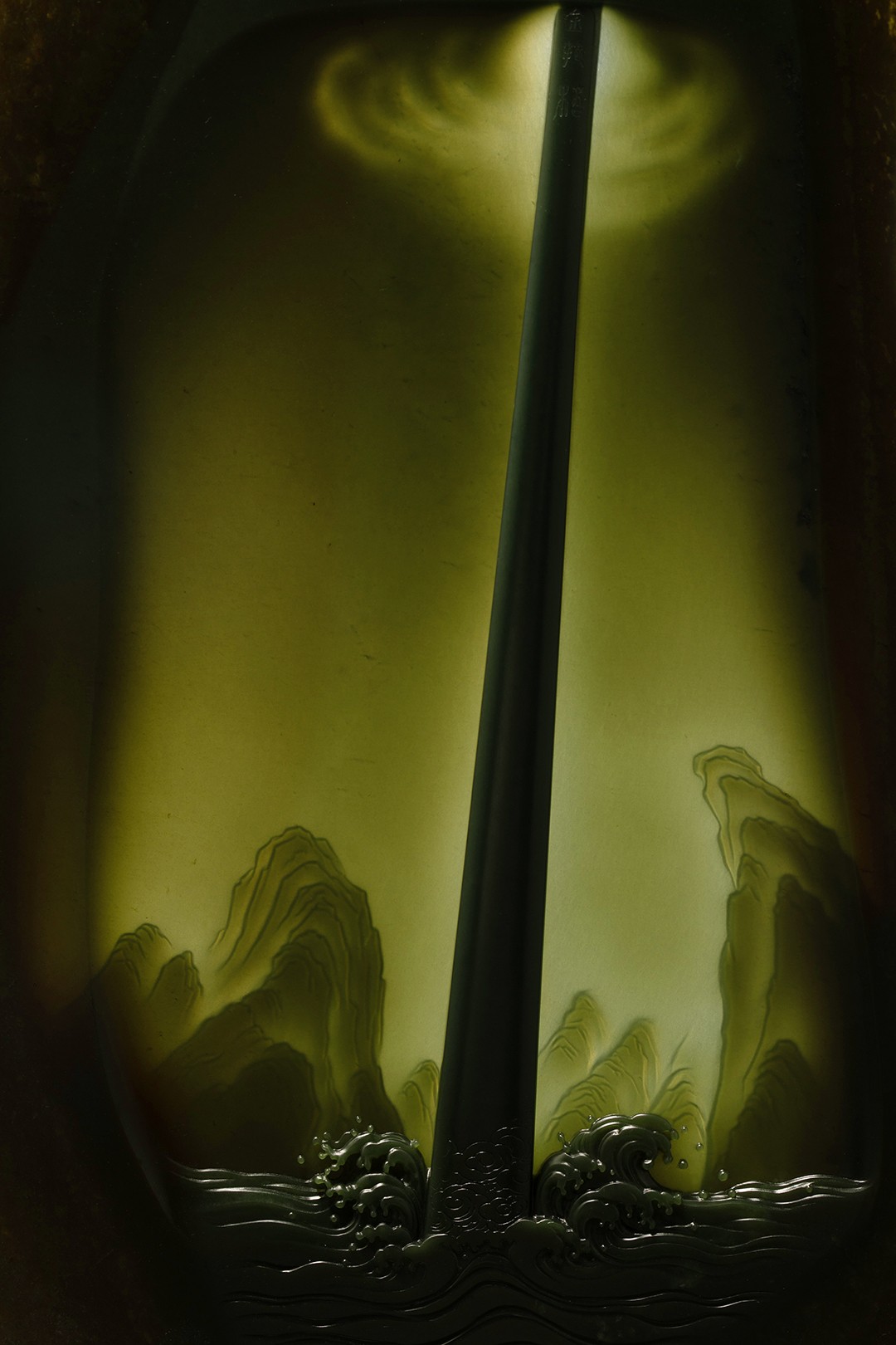作品背面,远近景深的奇竣山峦,在玉质肌理间若隐若现,海天辽阔的意境如呼吸般起伏,传达出“定山海”的愿望,以及无边的力量感和影响力。