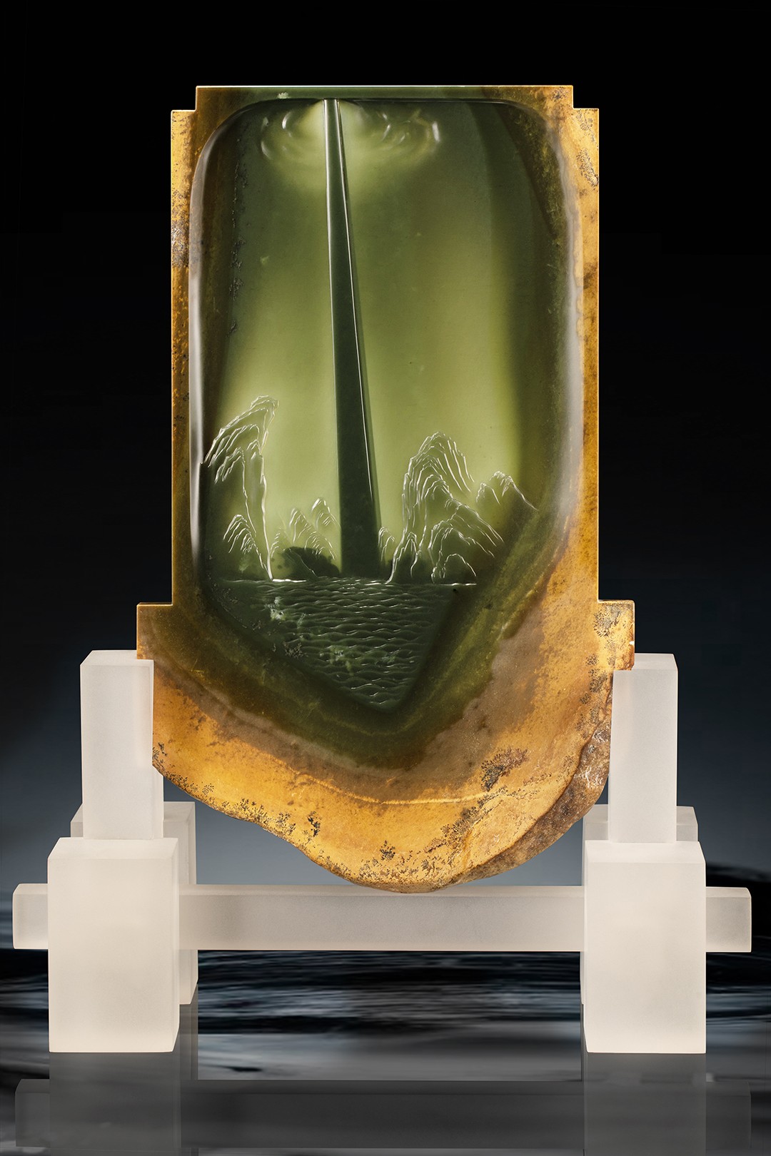 作者以刀作笔,运用留皮随形赋形技法,将析木玉的天然肌理转化为山海轮廓,体现“天人合一”的造物观。