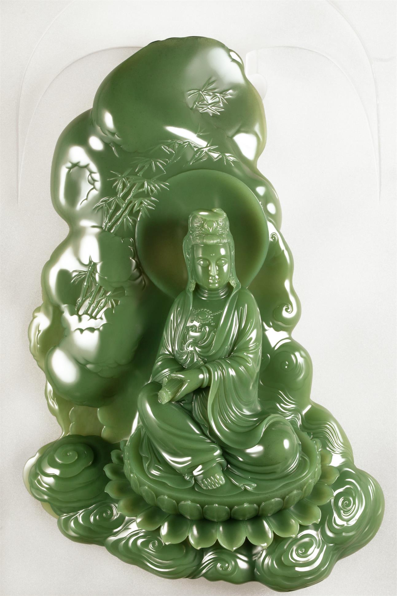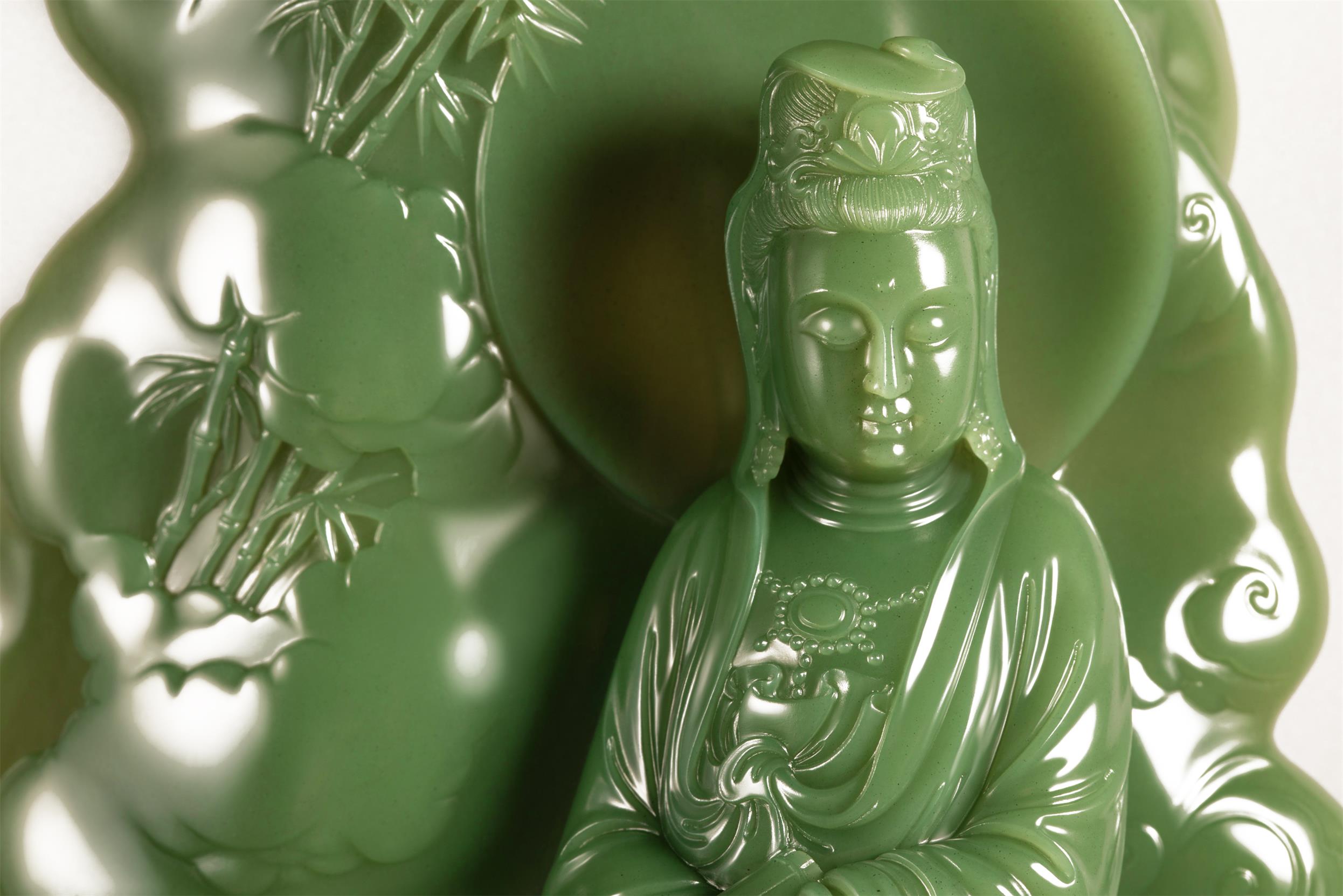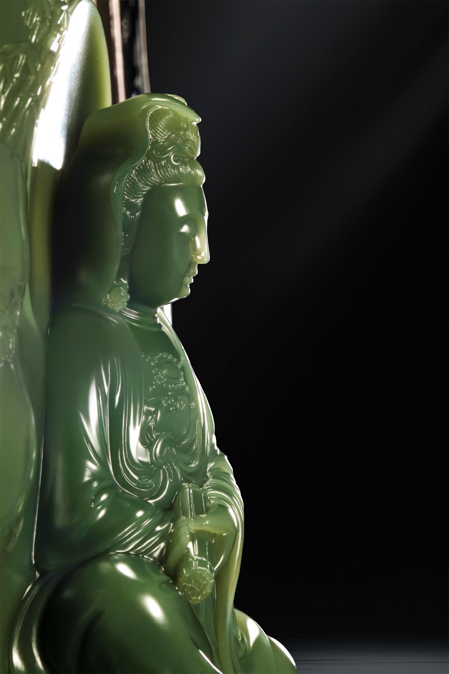 展厅深处,一尊观音玉雕静立。析木玉的绿色肌理在灯光下泛着沉静光泽,如深夜未熄的灯盏,无声传递着经卷的智慧,令人屏息凝神。这正是象征智慧与学识的观音三十三化身之一——持经观音。