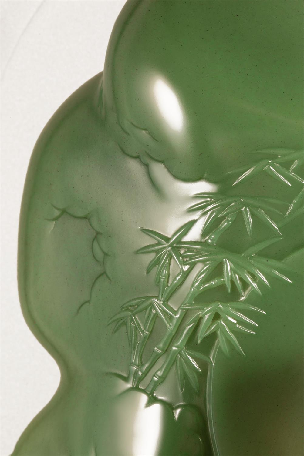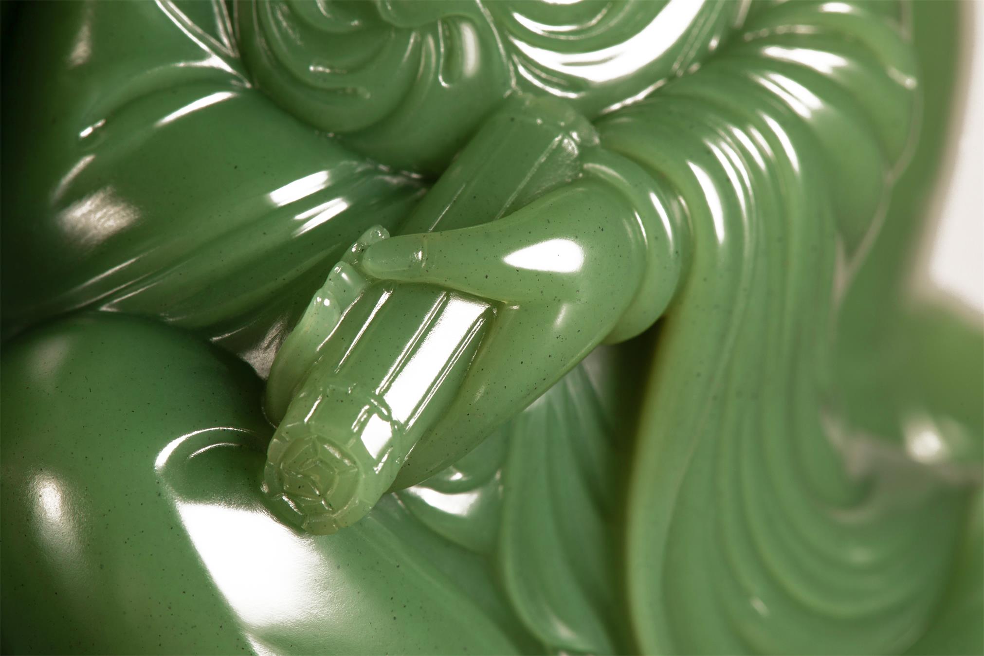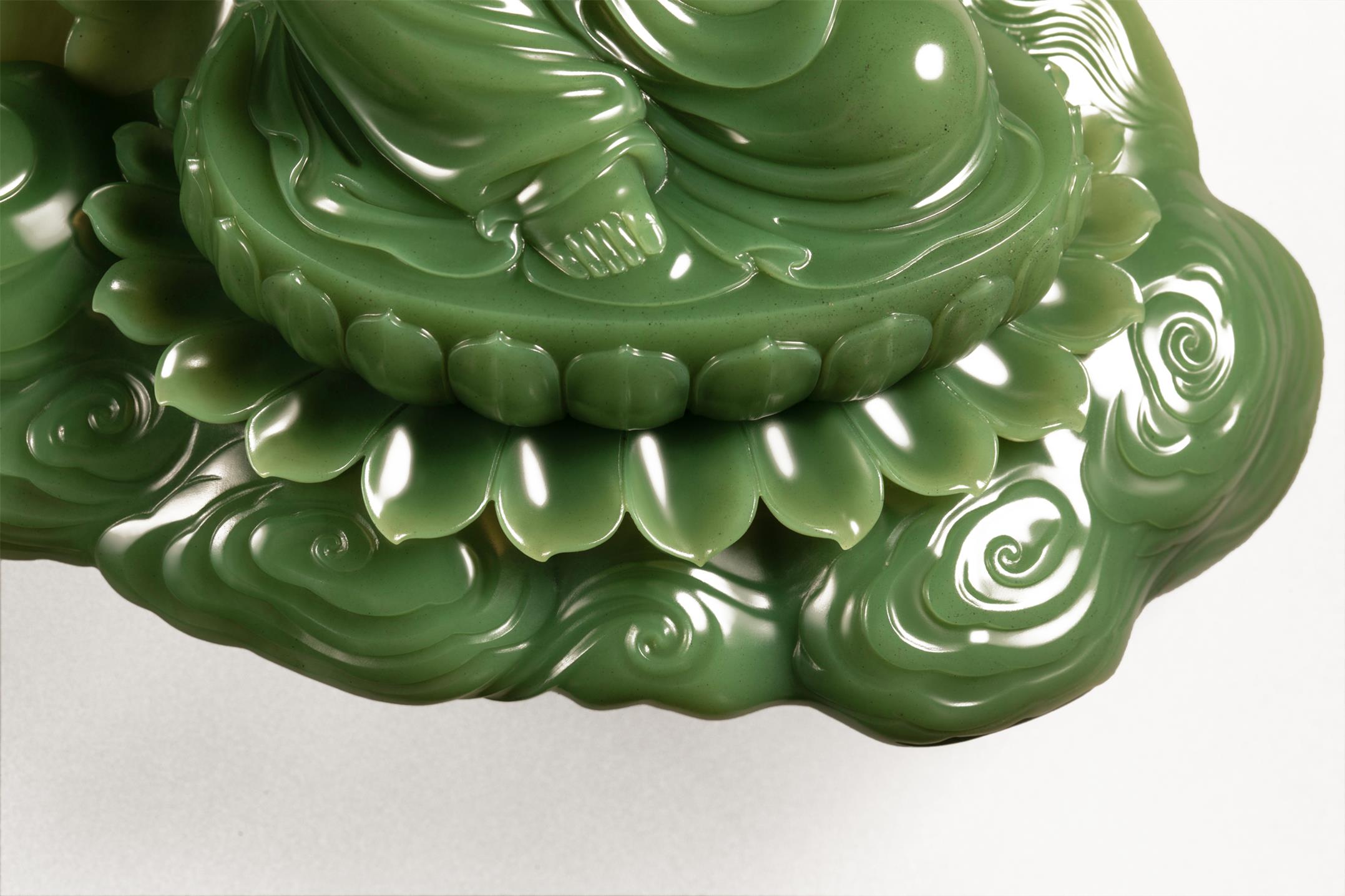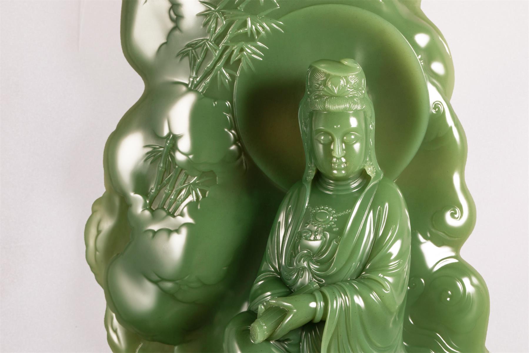 展厅深处,一尊观音玉雕静立。析木玉的绿色肌理在灯光下泛着沉静光泽,如深夜未熄的灯盏,无声传递着经卷的智慧,令人屏息凝神。这正是象征智慧与学识的观音三十三化身之一——持经观音。