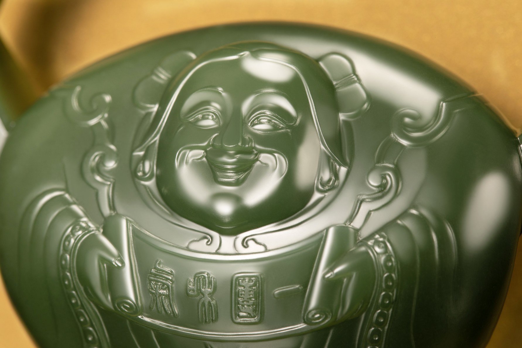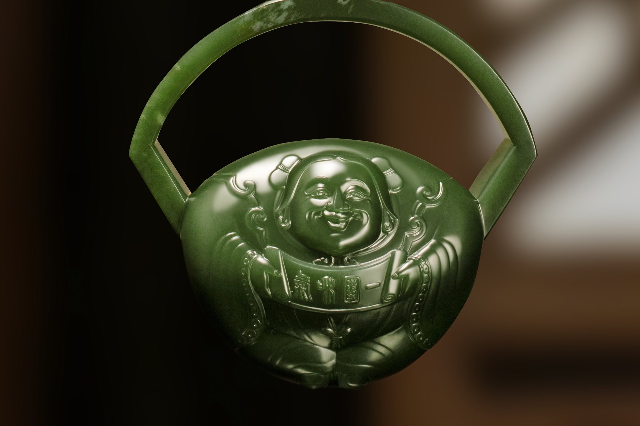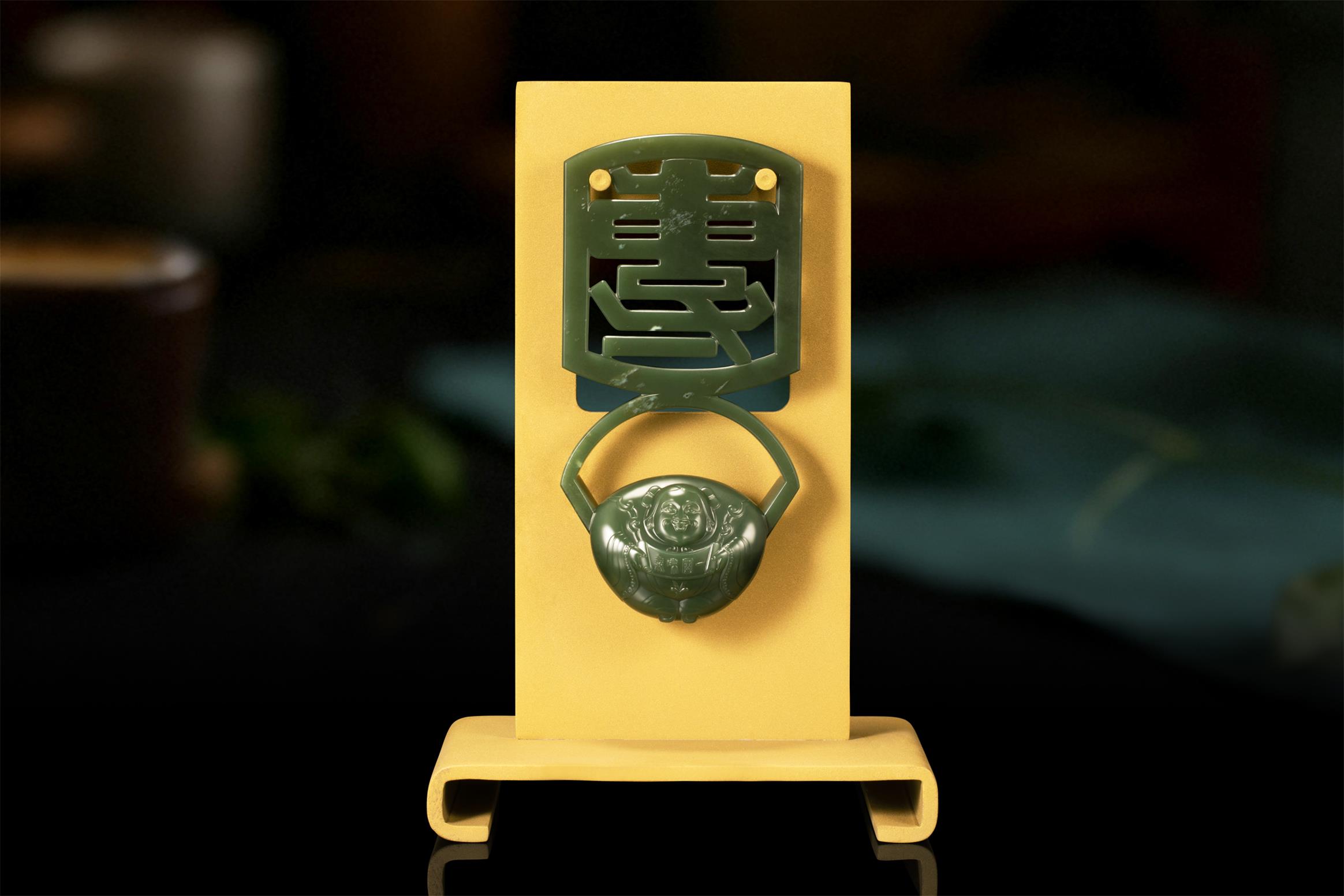 作品取材于析木玉,其质温润若脂。深沉的绿意中,丝絮状白沁悠然游弋,如碧波含烟,深潭凝露,意境幽远深邃,为“和气”奠定了宁静祥和的基调。