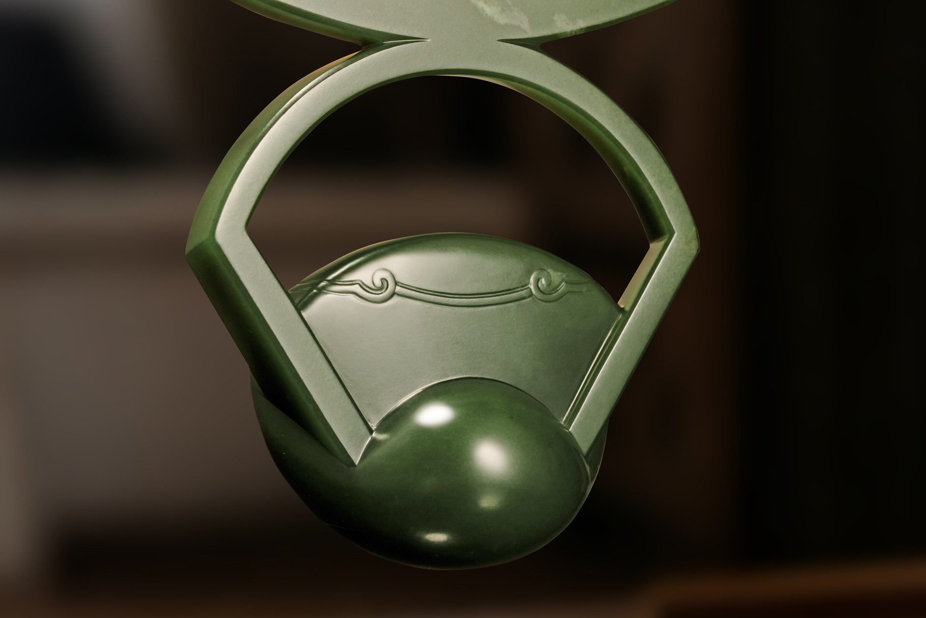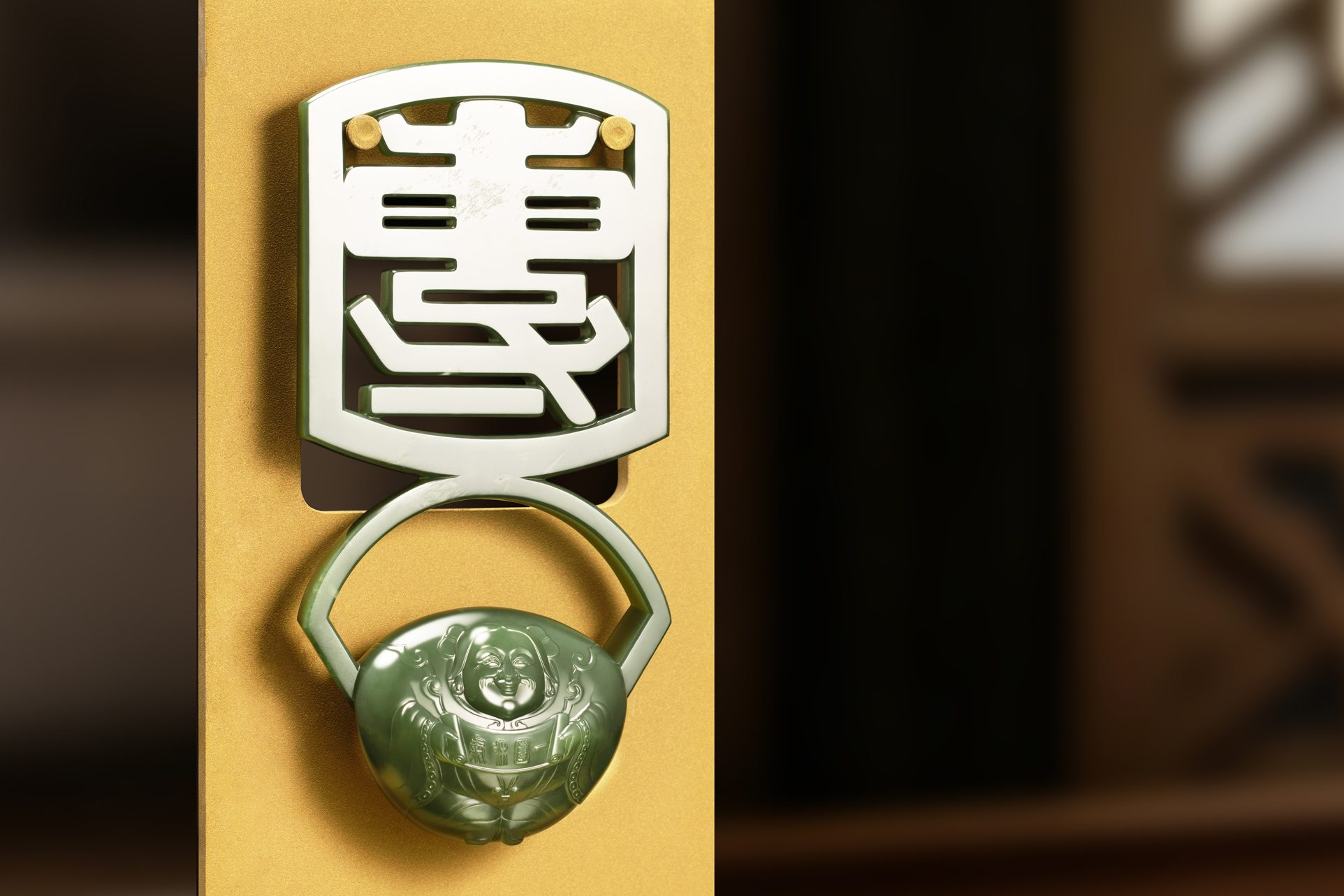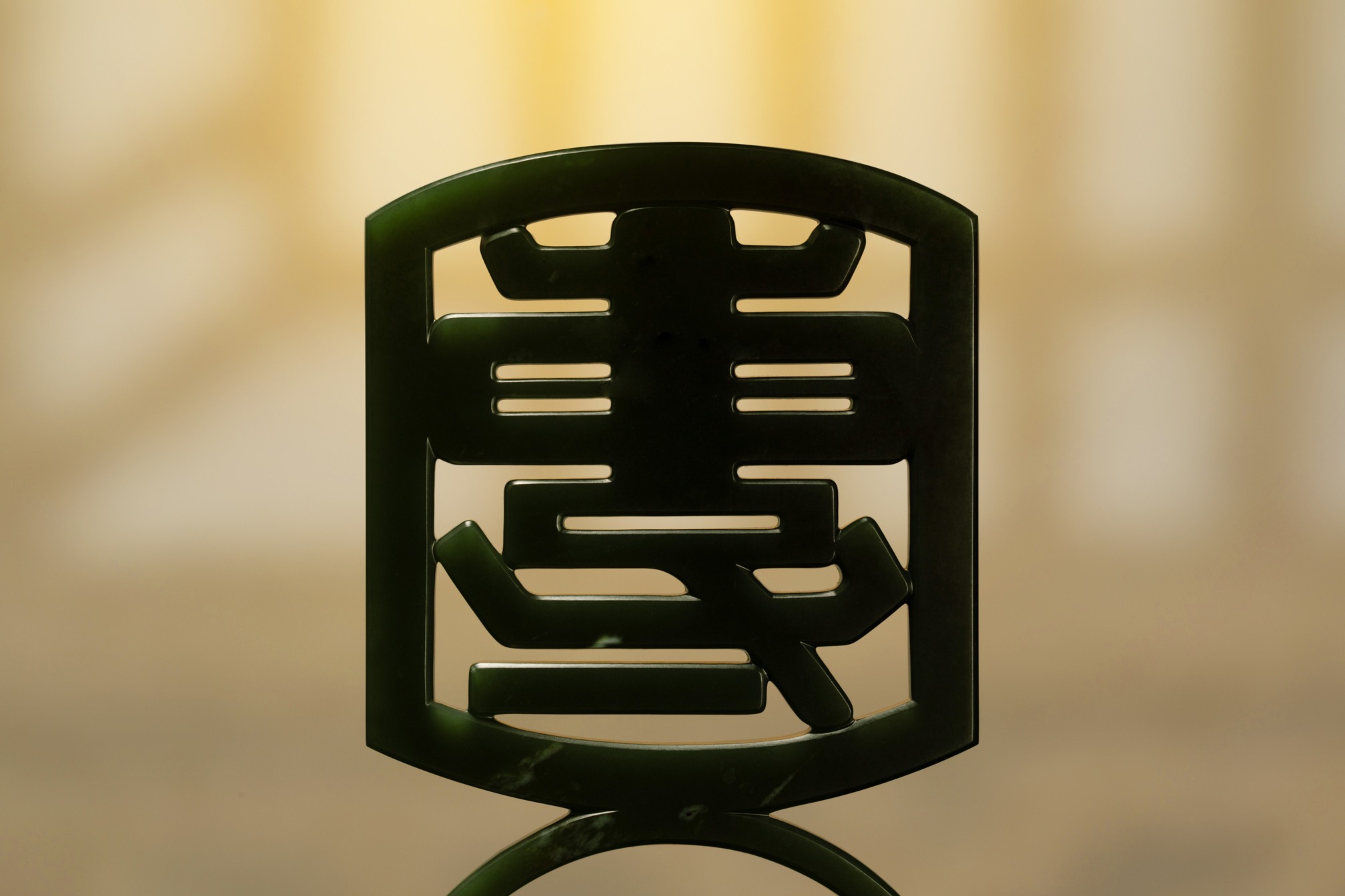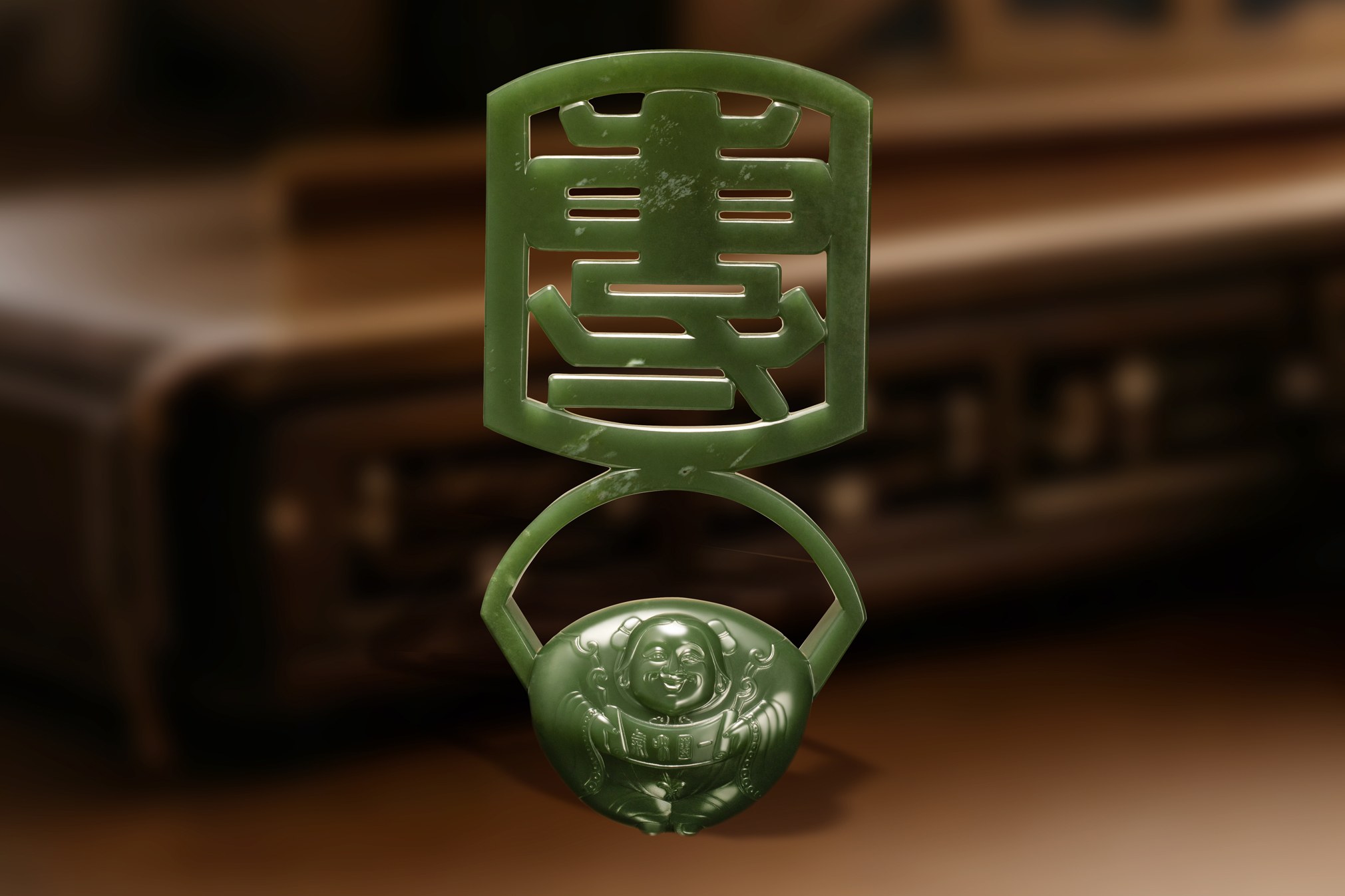 作品取材于析木玉,其质温润若脂。深沉的绿意中,丝絮状白沁悠然游弋,如碧波含烟,深潭凝露,意境幽远深邃,为“和气”奠定了宁静祥和的基调。