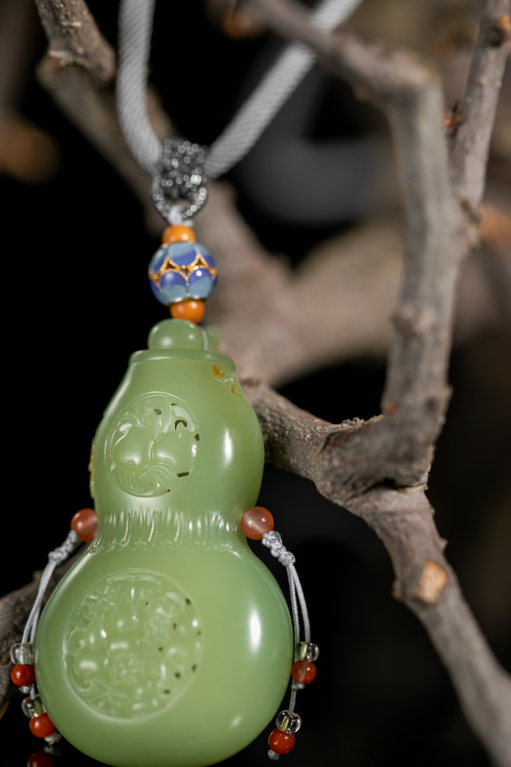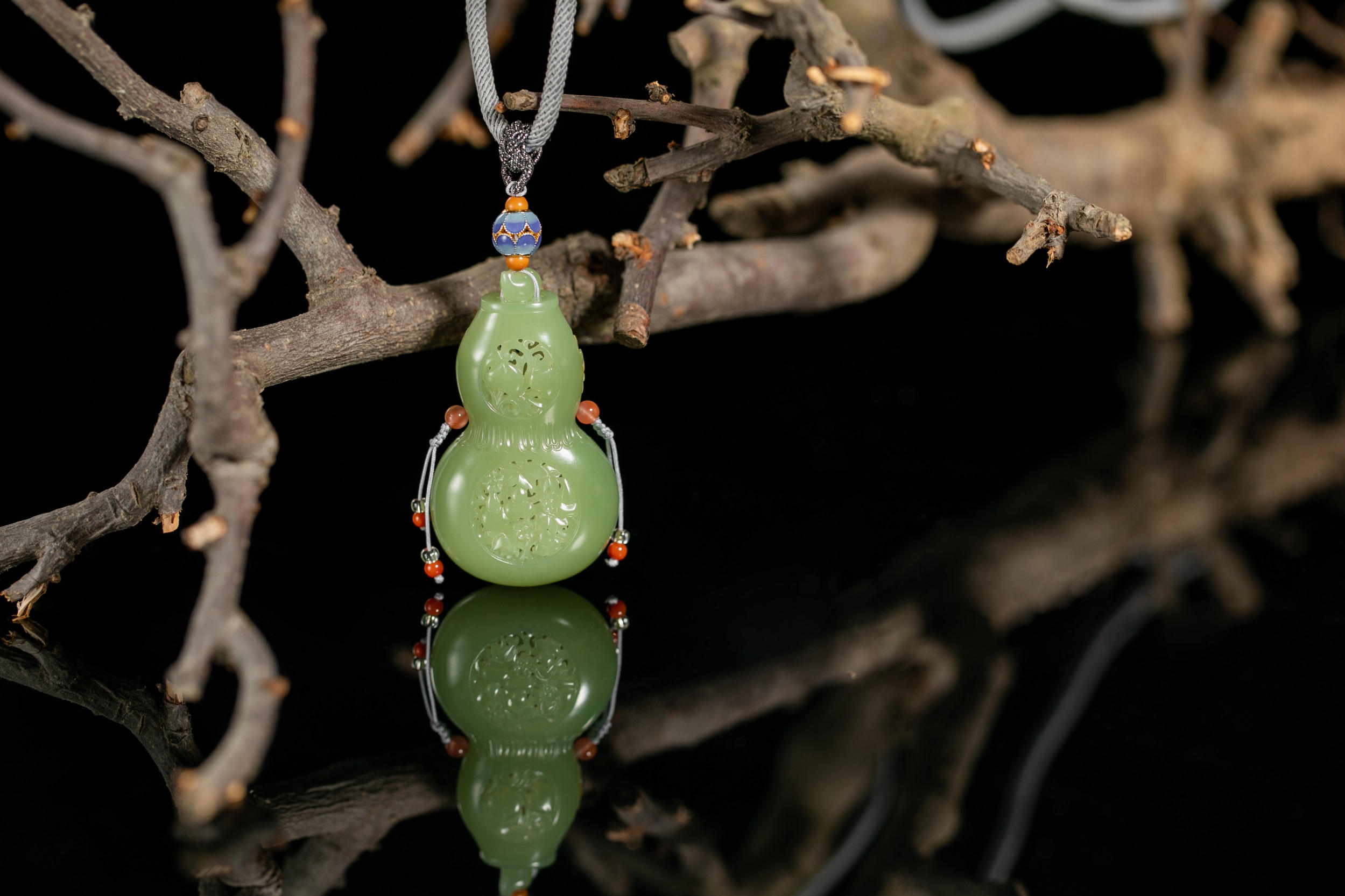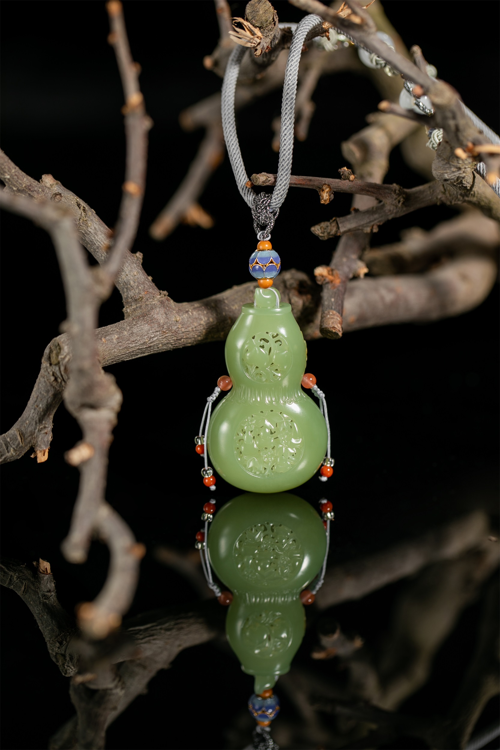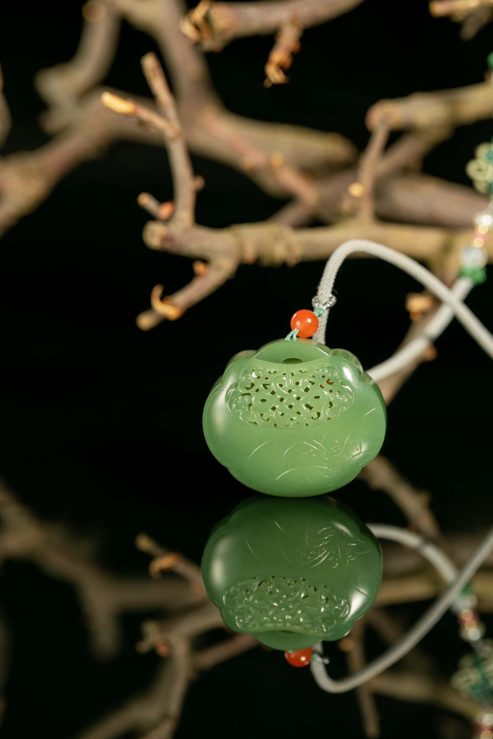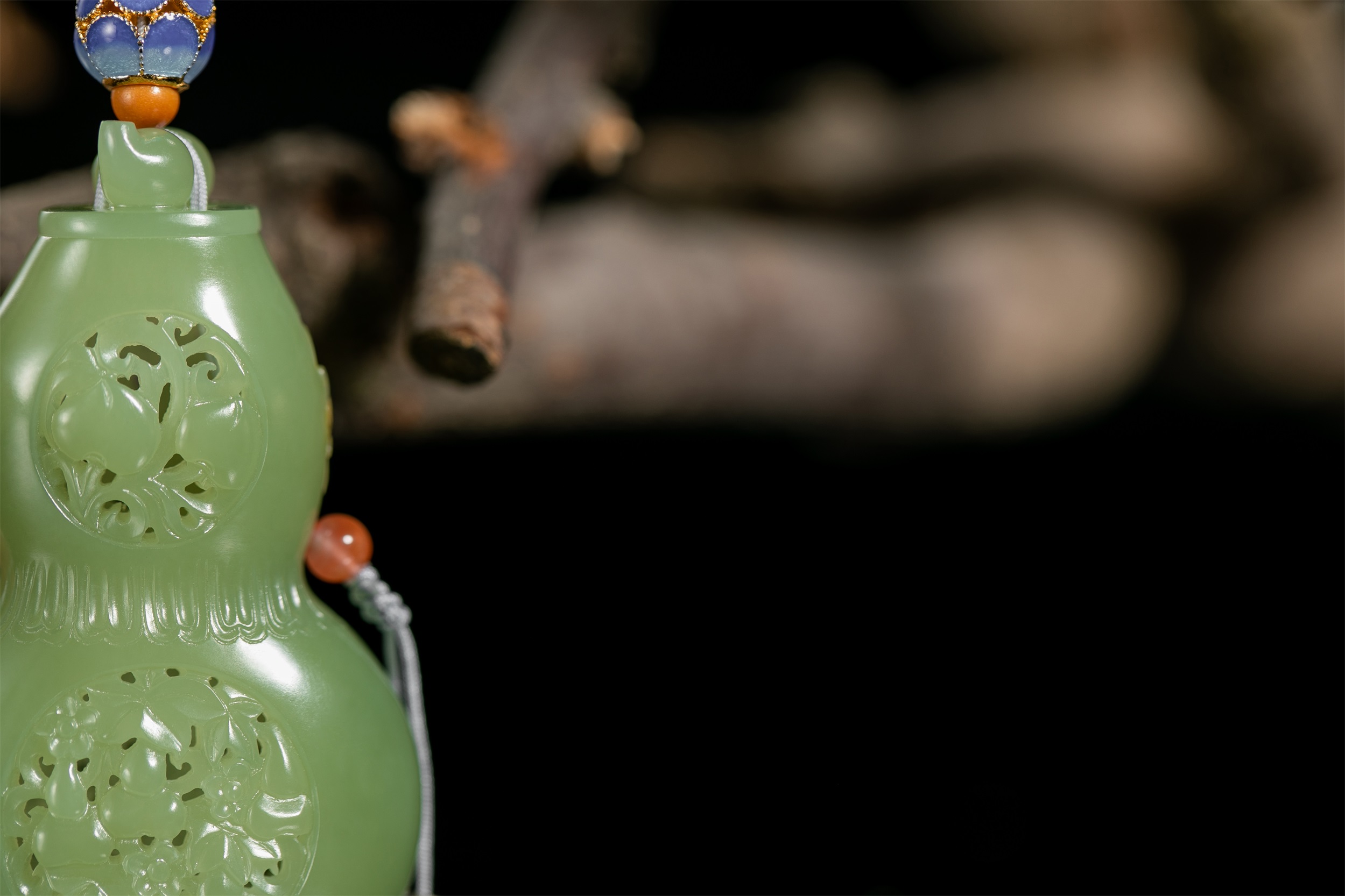 四件作品造型各异,桃形、心形、椭圆形和葫芦形的轮廓,与虚实相间的雕饰互生出一种精巧、空灵、唯美和逸秀,带给我们一种韵古趣雅的别样感官享受。