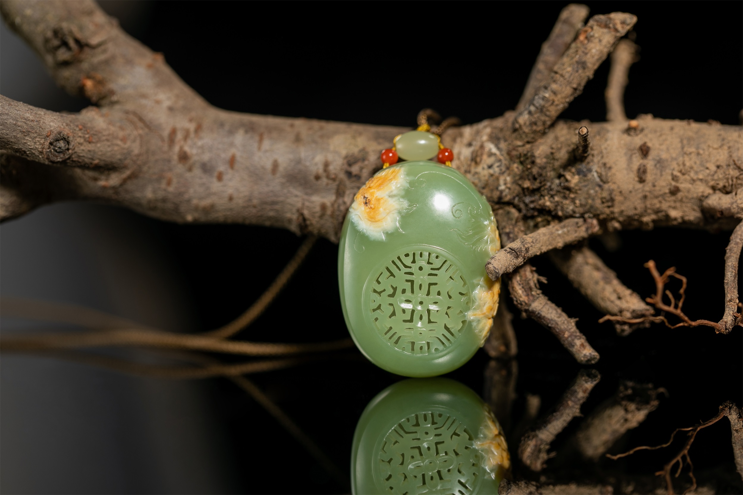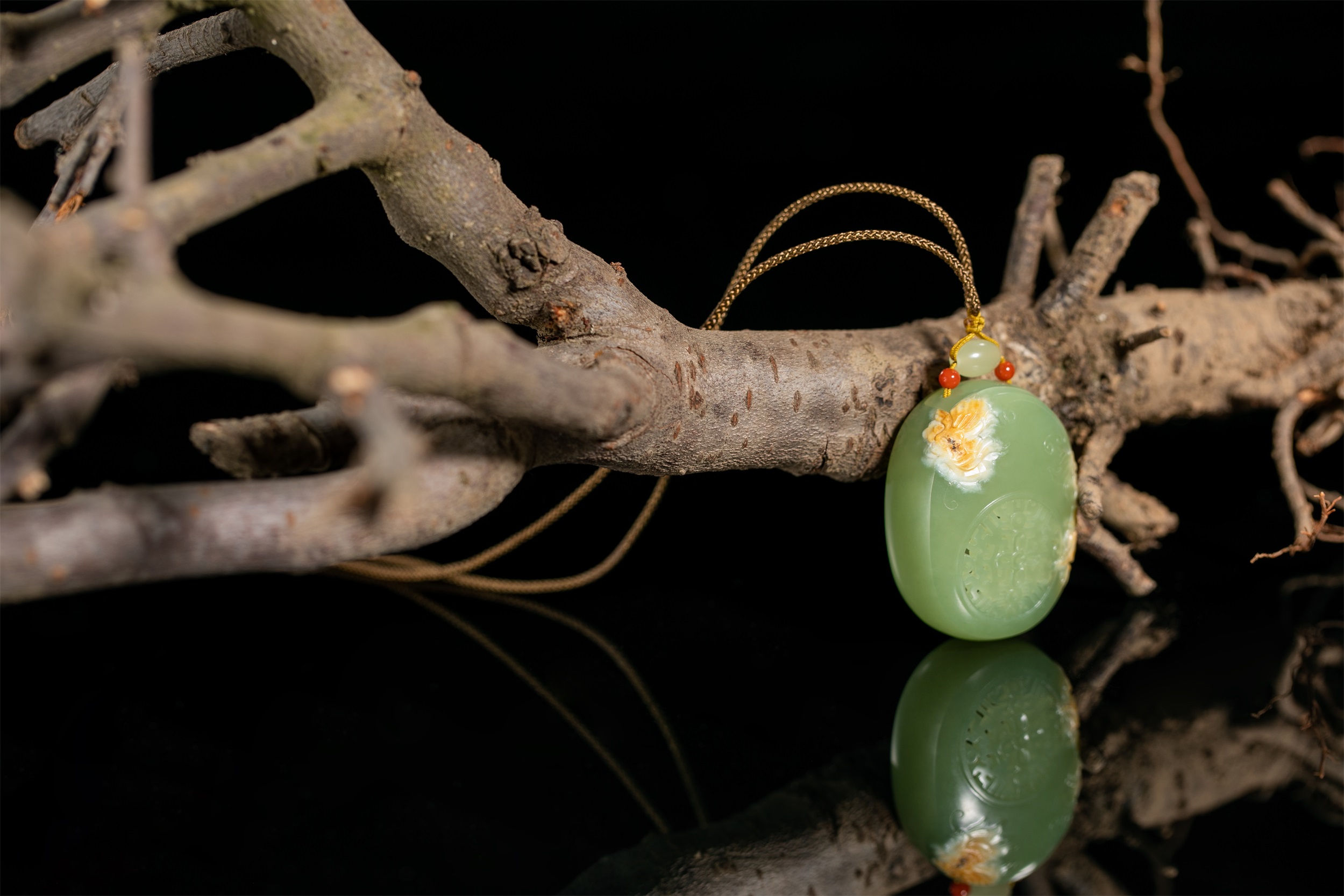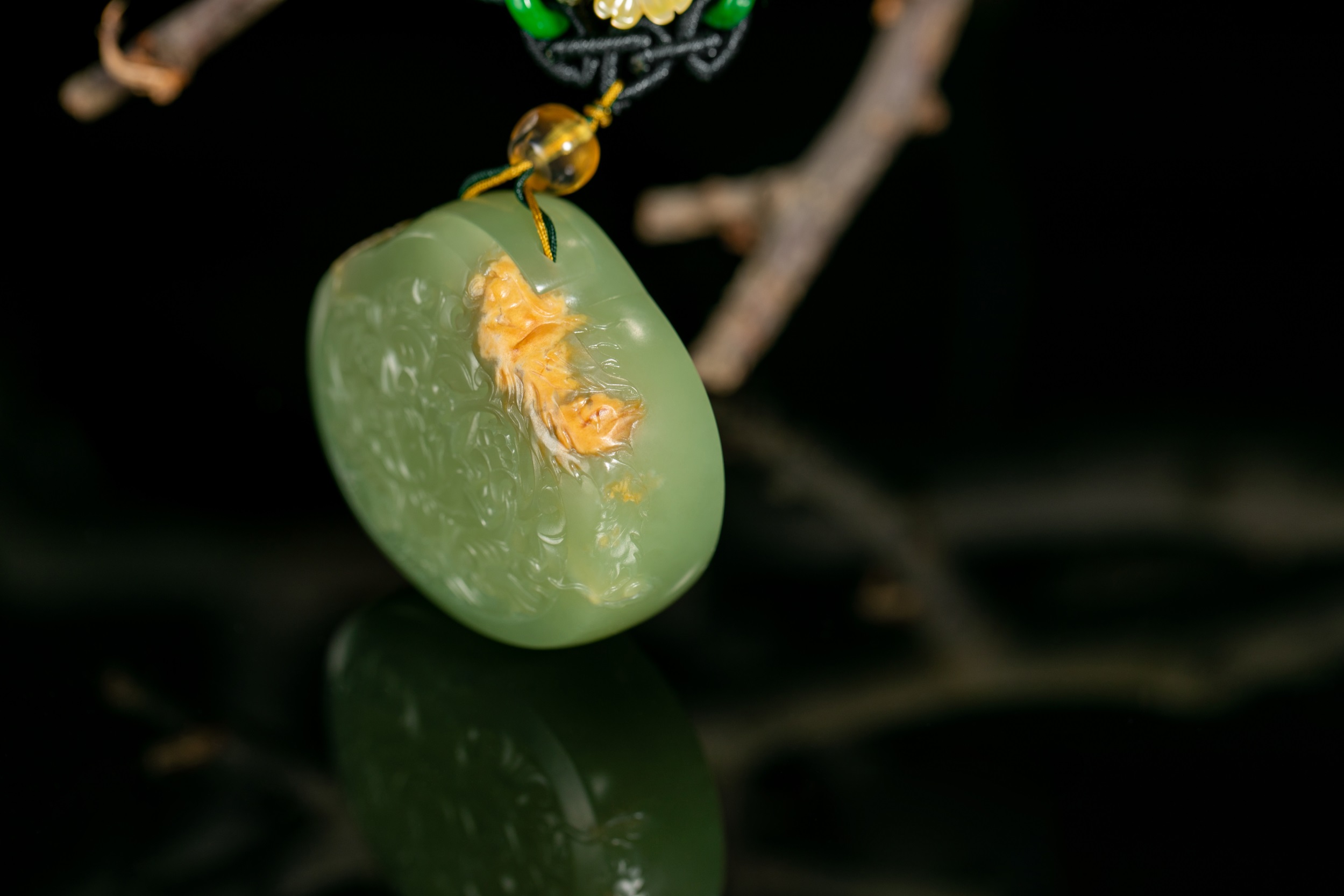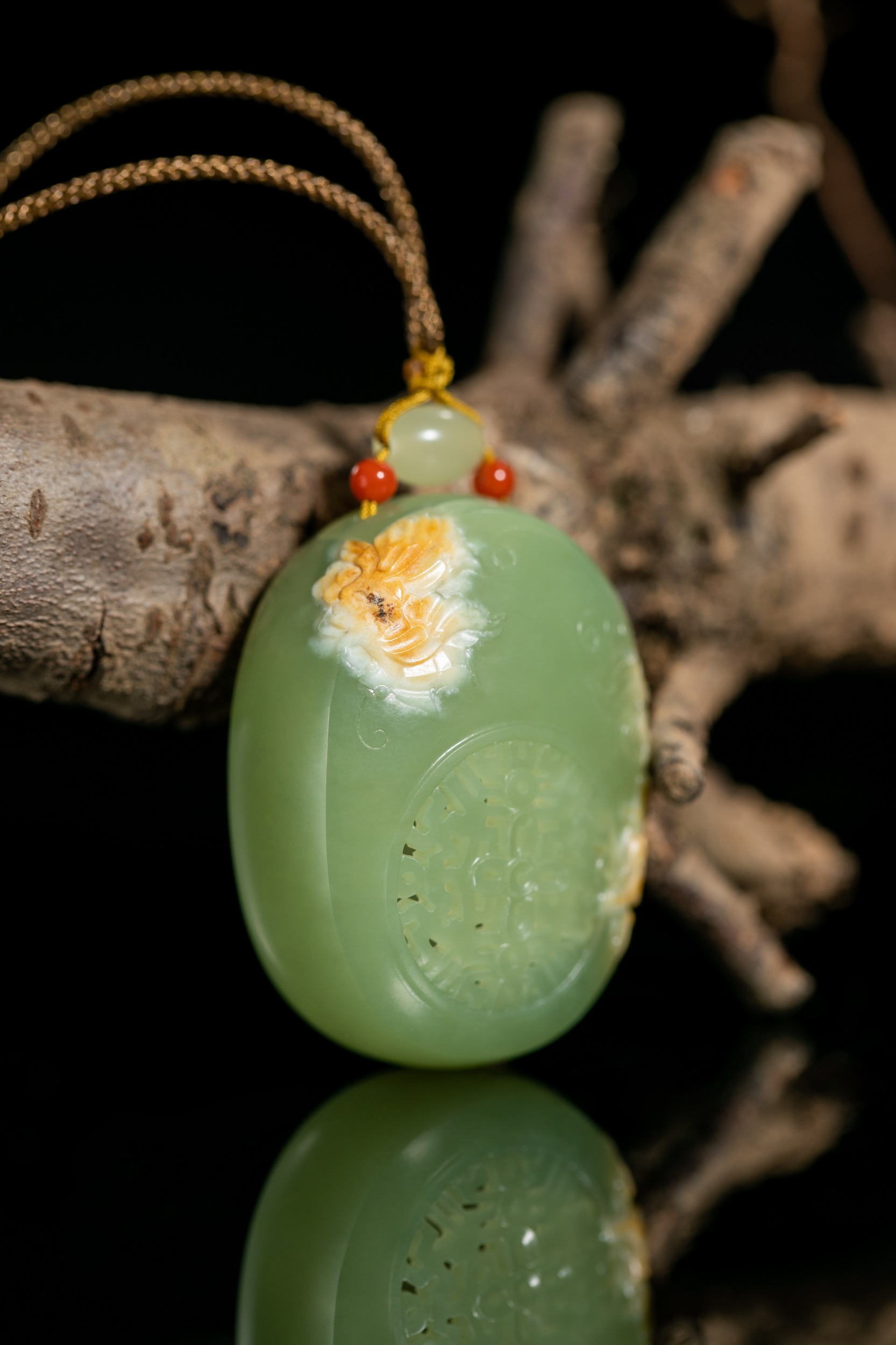 据说,这样的镂空玉雕小件,极为考验雕艺与审美,需要手、眼、技艺和力量的完美结合,方能呈现出经典的玉作。钱建良大师的《香囊》作品,内部掏膛确实细腻,内外薄厚也极为均匀,外面的雕刻更是充分结合了玉料特点,将金黄的皮色雕成美轮美奂的菊花,绽放成整件作品的点睛之笔。