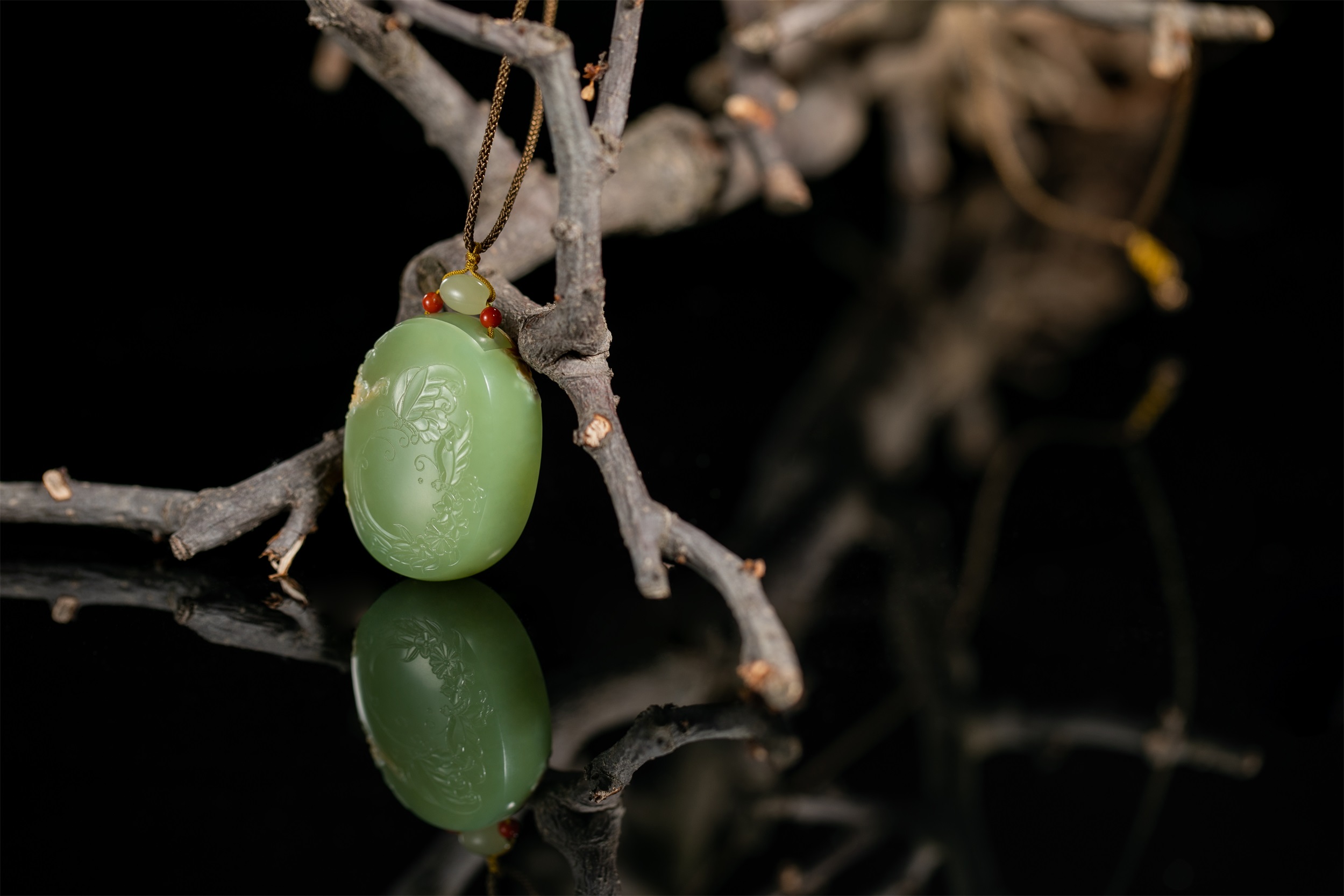 四件香囊作品,均将内部掏膛,通过反复穿插透雕的技法,将镂空部分形成菊花、同心结、桃子等有象征意义的精美纹饰,以非镂空部分雕琢花纹、蝴蝶等图案与之相映成趣。