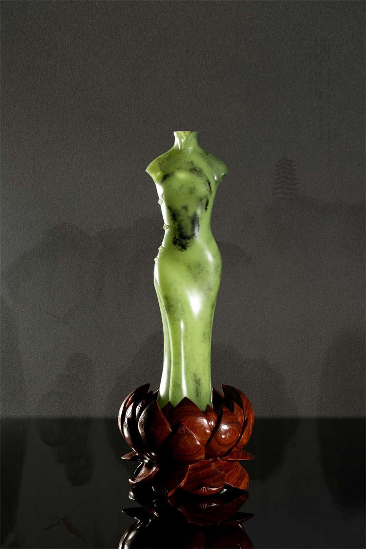 如何将如墨色晕染的黄绿色析木玉石,“裁”成玲珑有致、婉约高贵的旗袍呢?这可是需要“有里有面”的绝顶工夫才行。