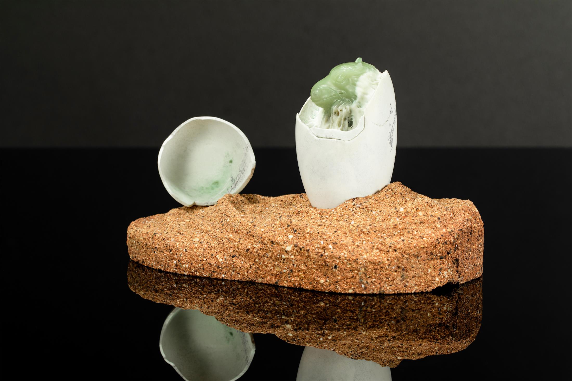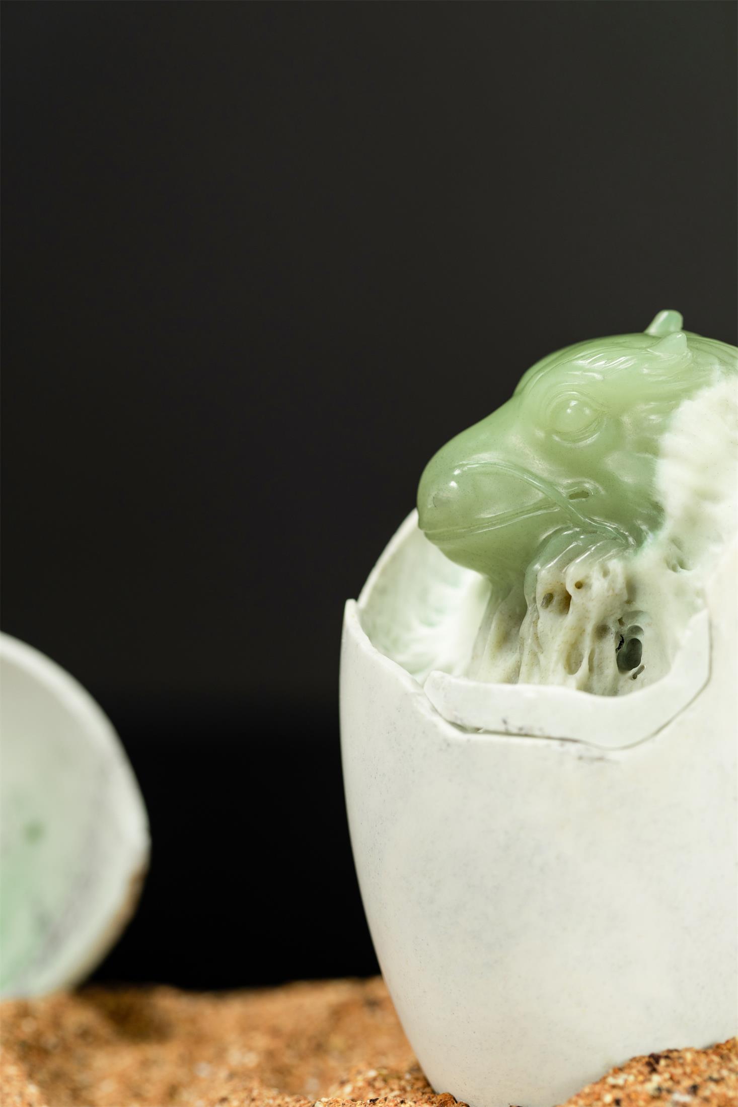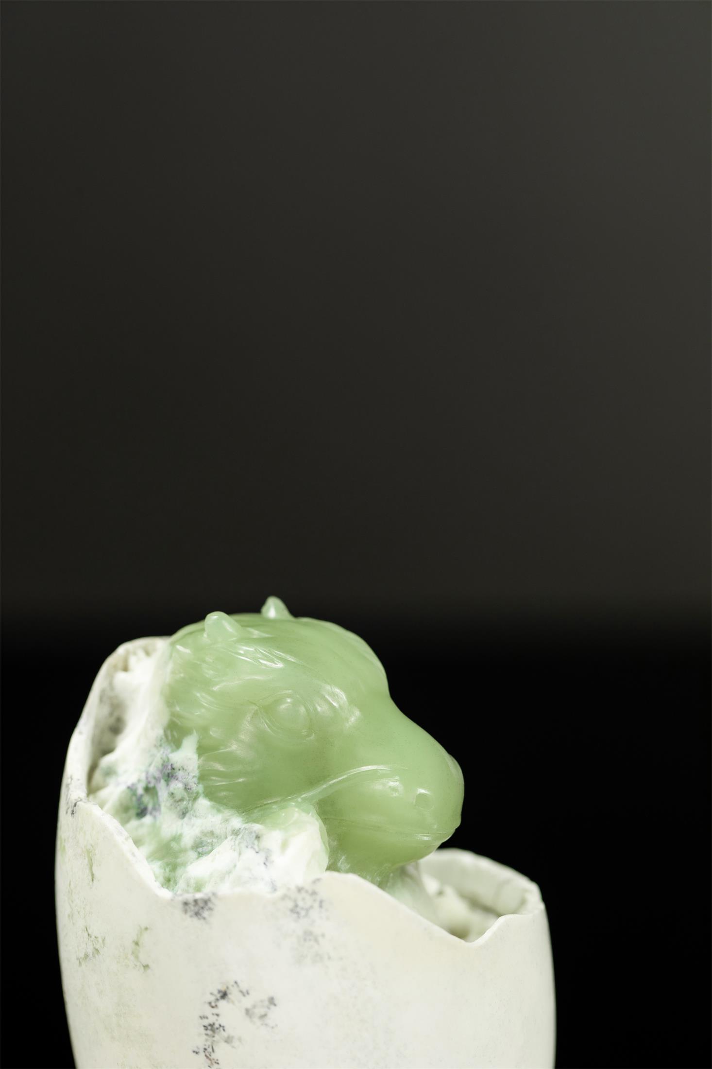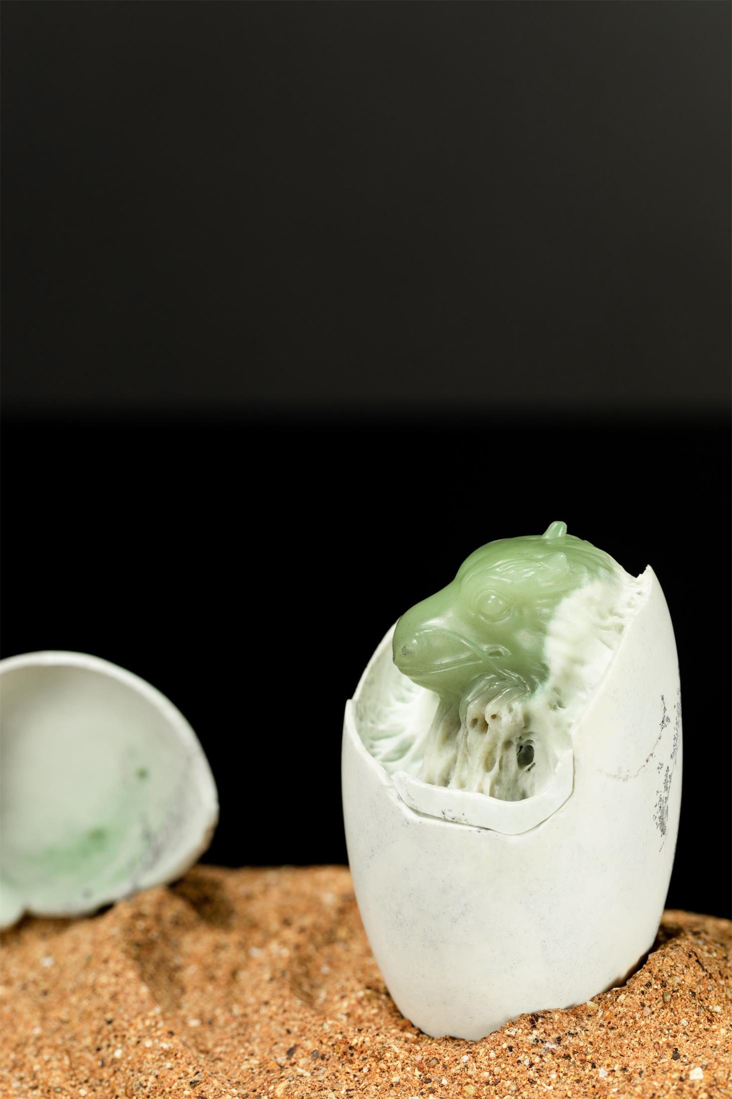 作品取材油润细腻的析木玉,保留原生天然白皮打磨成圆融的蛋型,蛋壳上的黑沁呈现岁月斑驳感,表面有不规则的深浅裂痕。