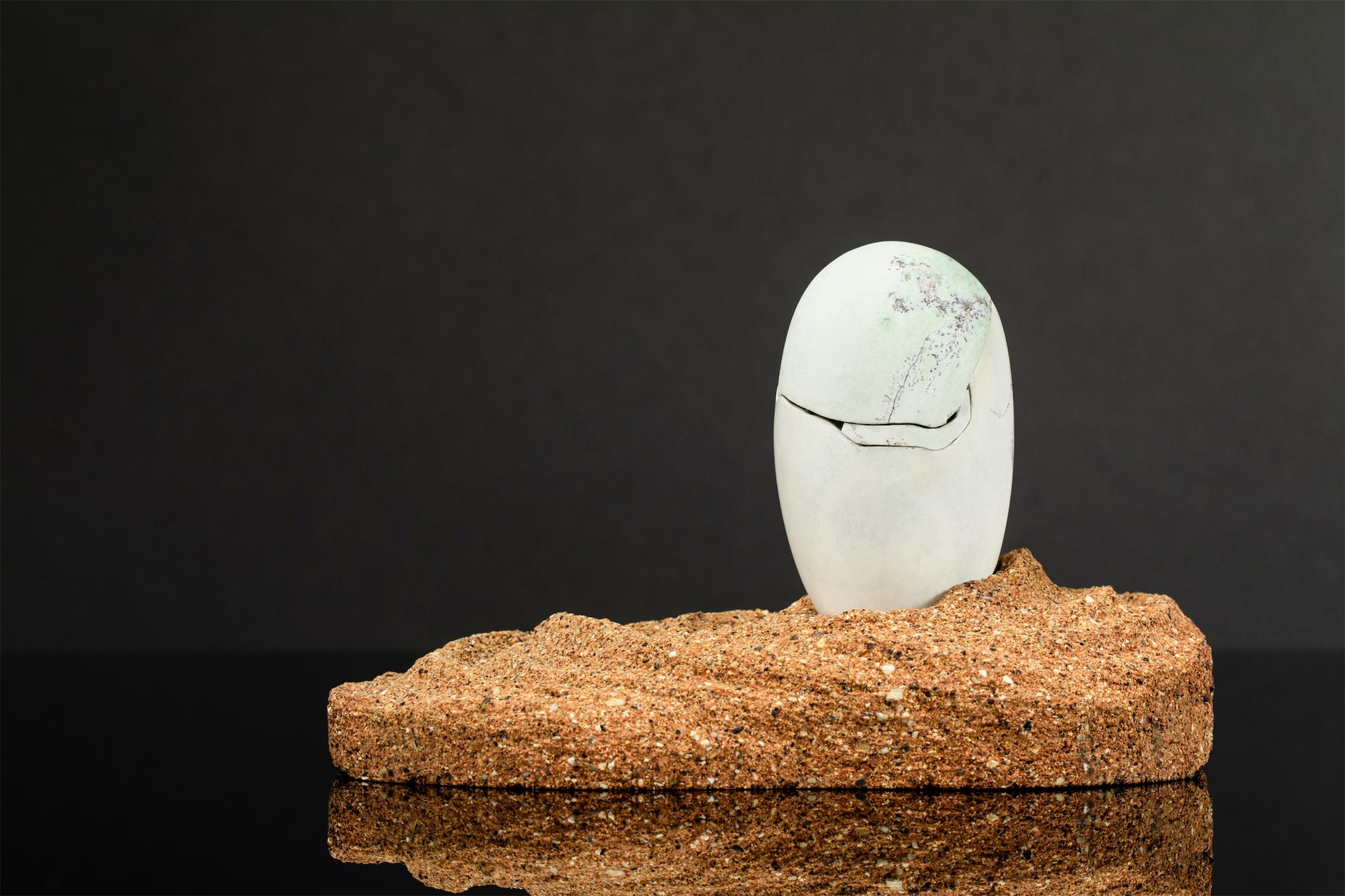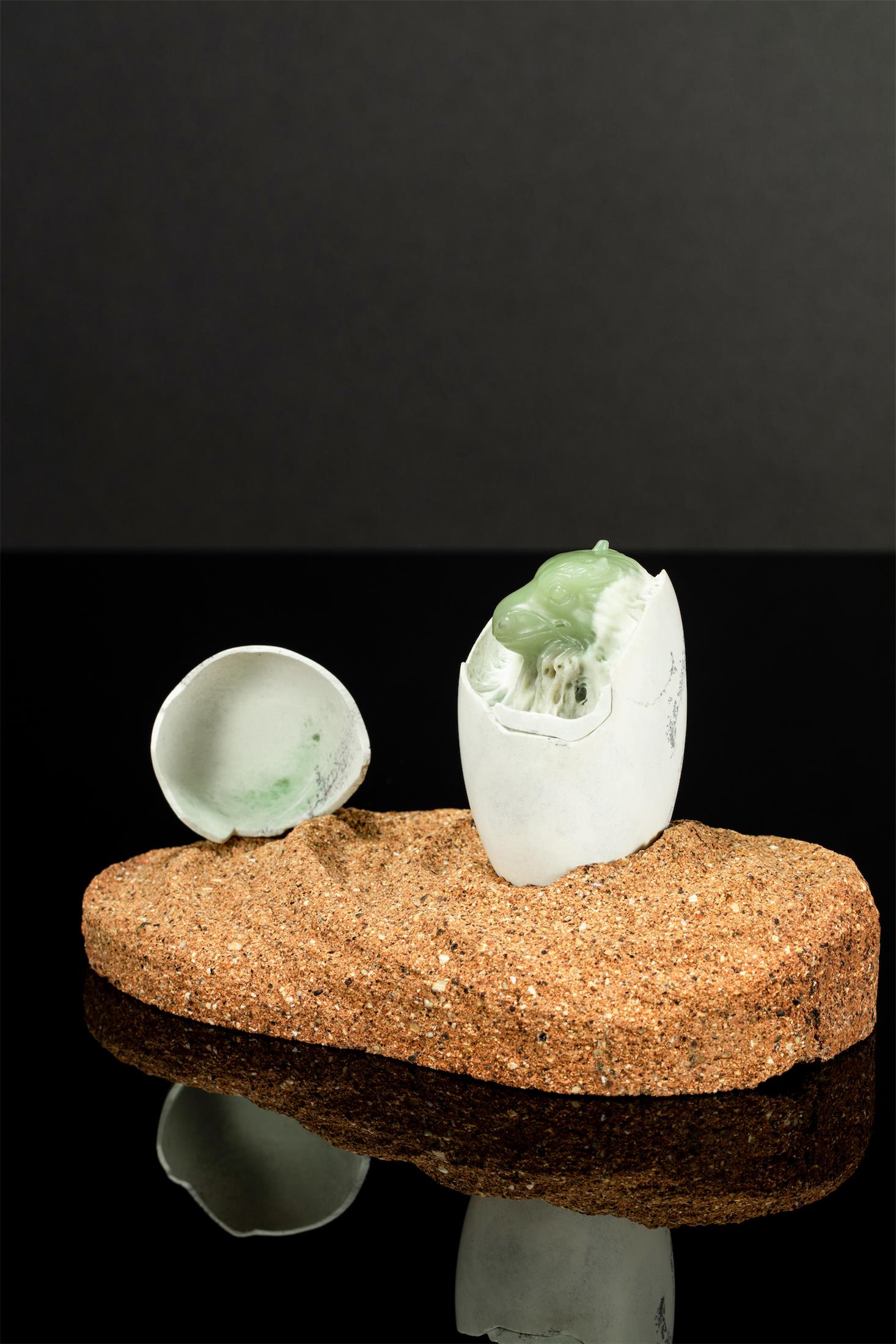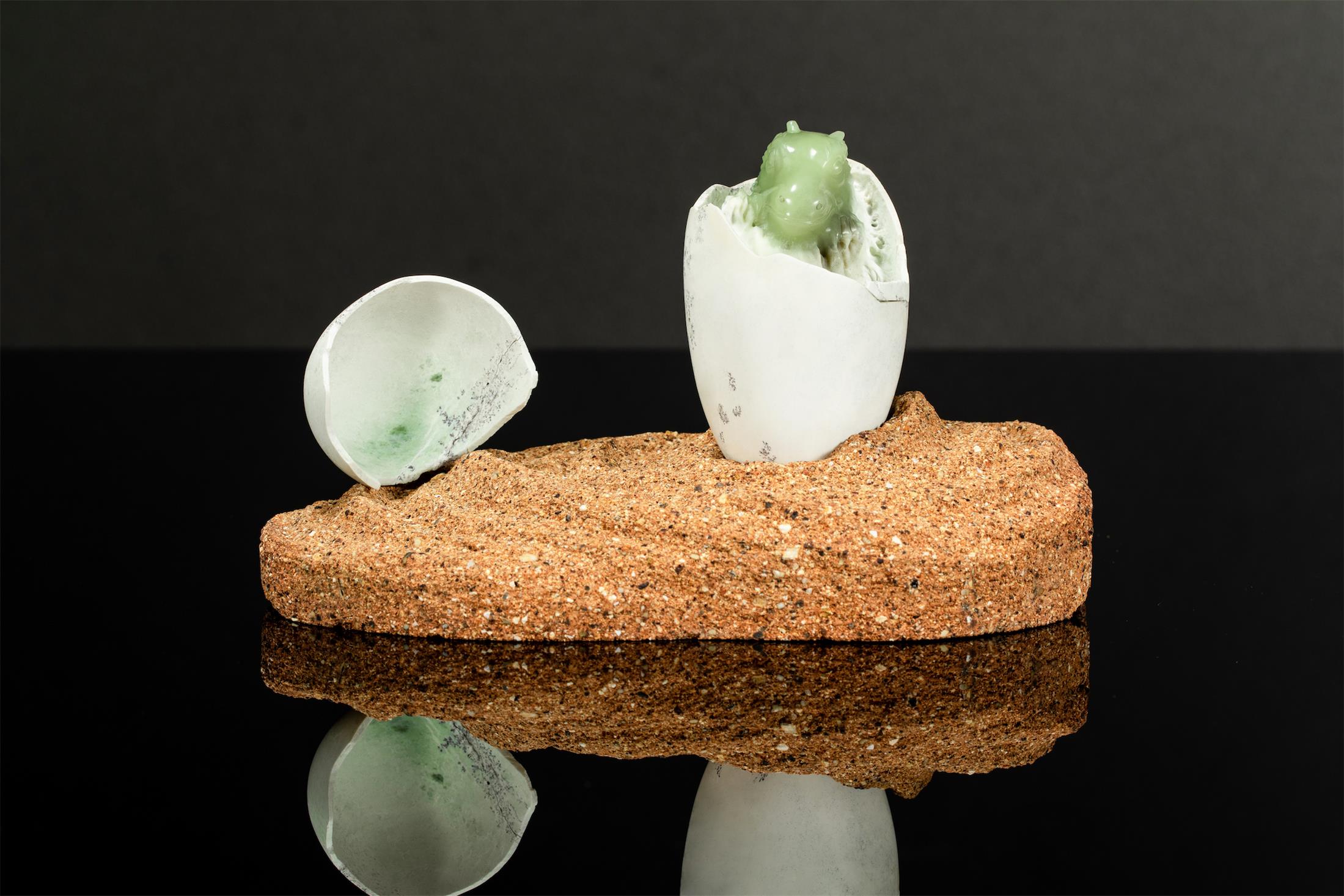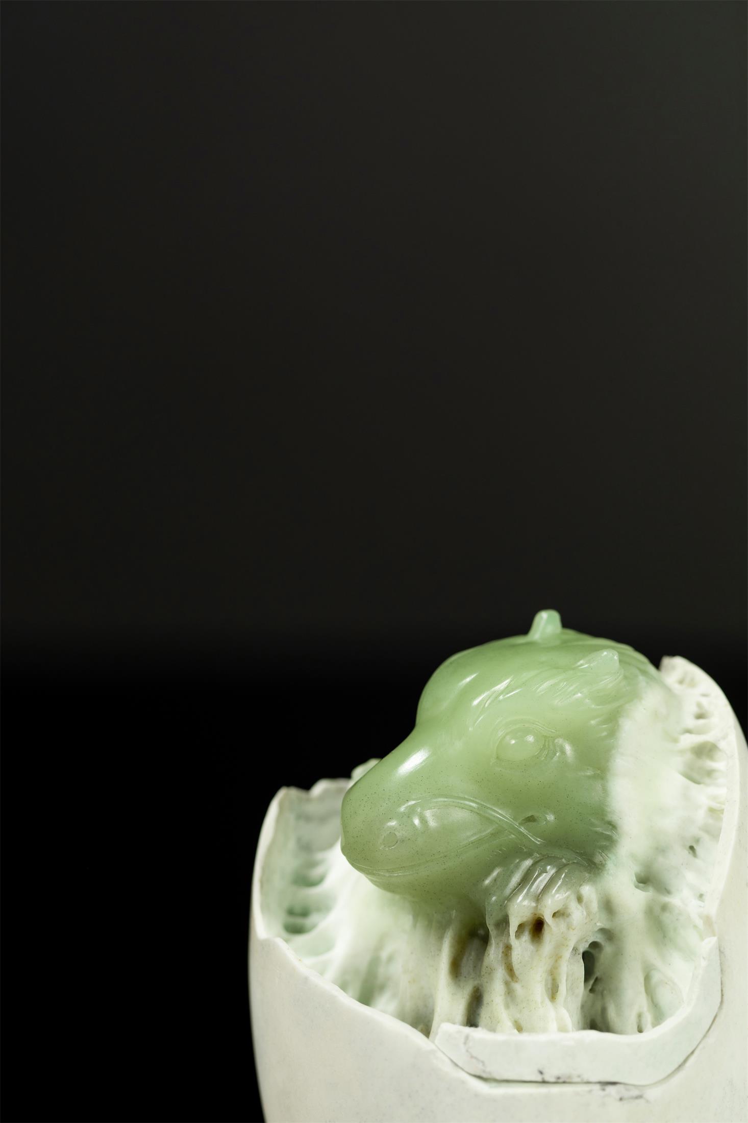 作品取材油润细腻的析木玉,保留原生天然白皮打磨成圆融的蛋型,蛋壳上的黑沁呈现岁月斑驳感,表面有不规则的深浅裂痕。