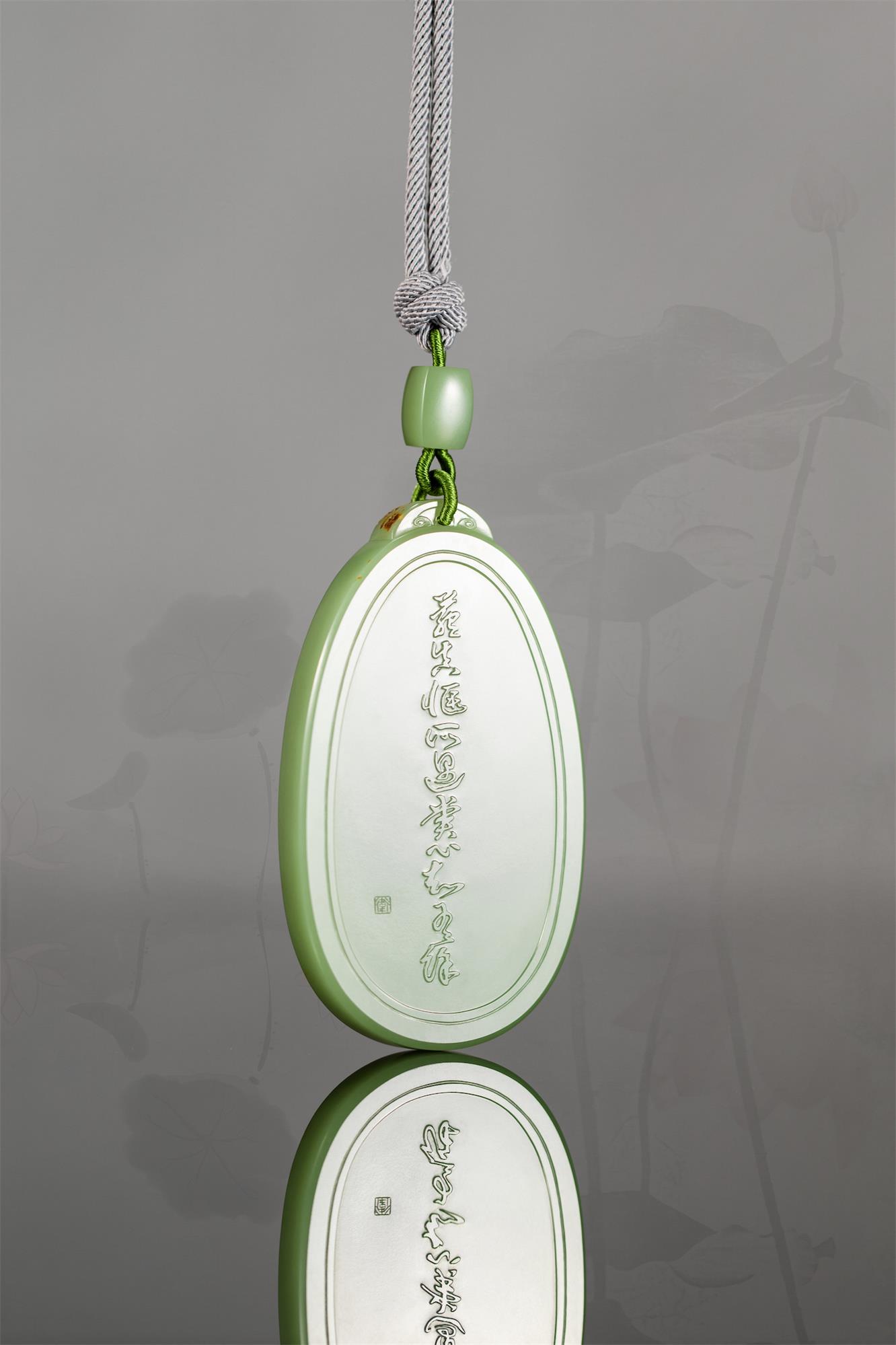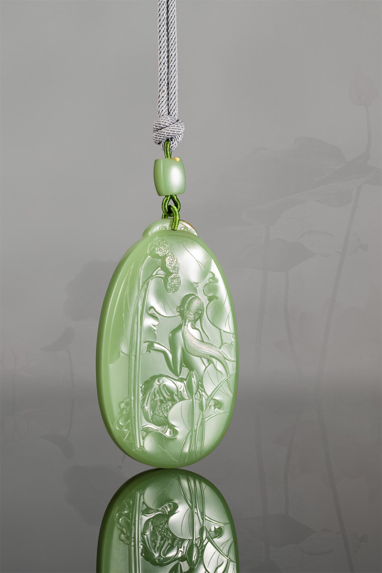 你看,三两片大荷叶,环绕整个析木玉玉牌,碧色间,如见荷花满塘,繁茂却又可见,布局恰到好处的舒朗。