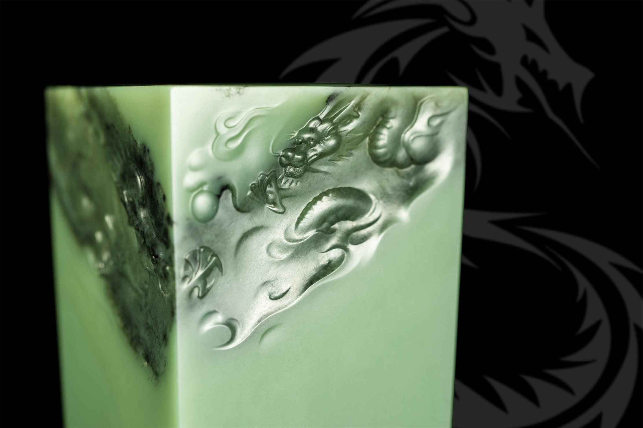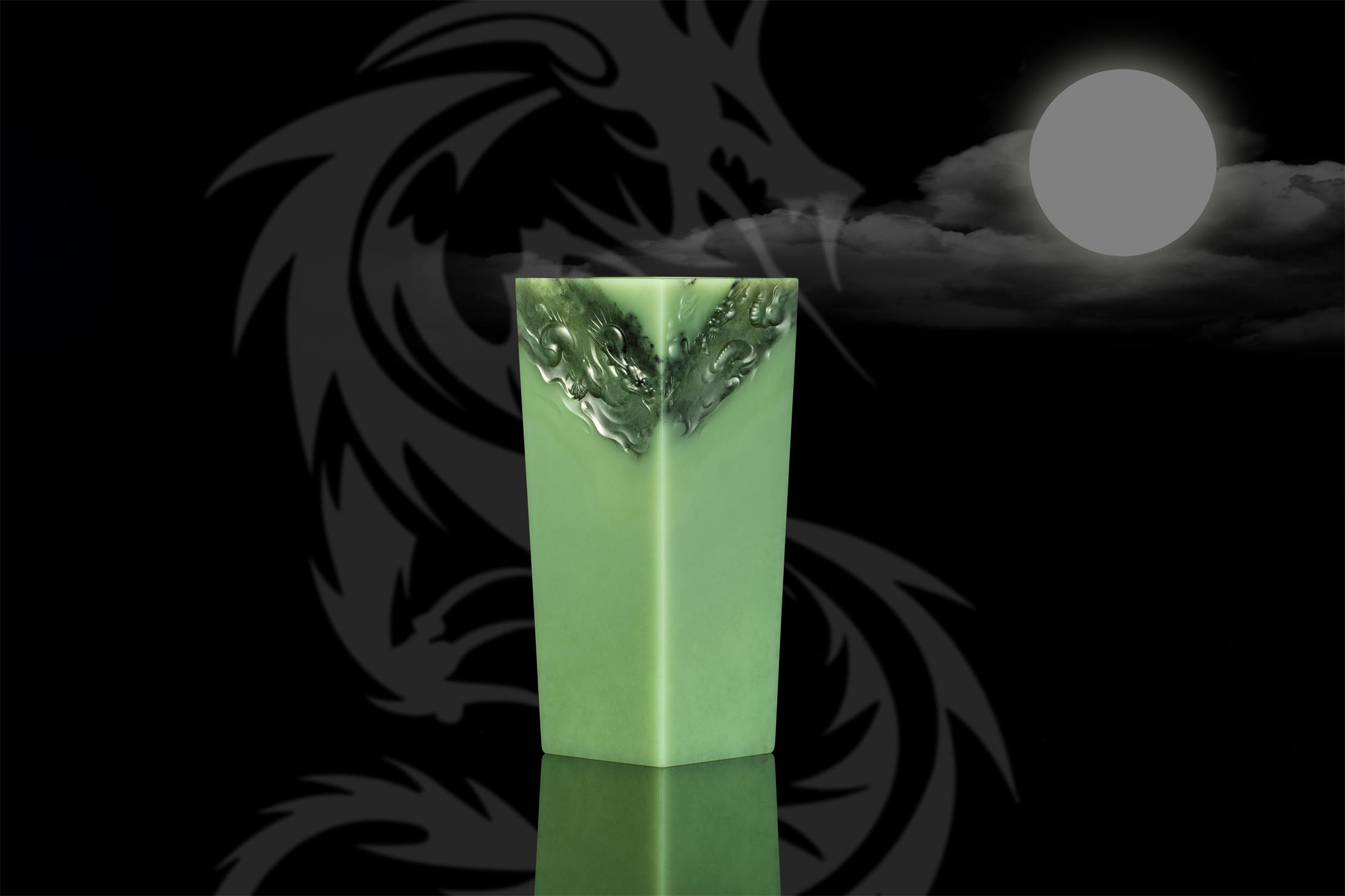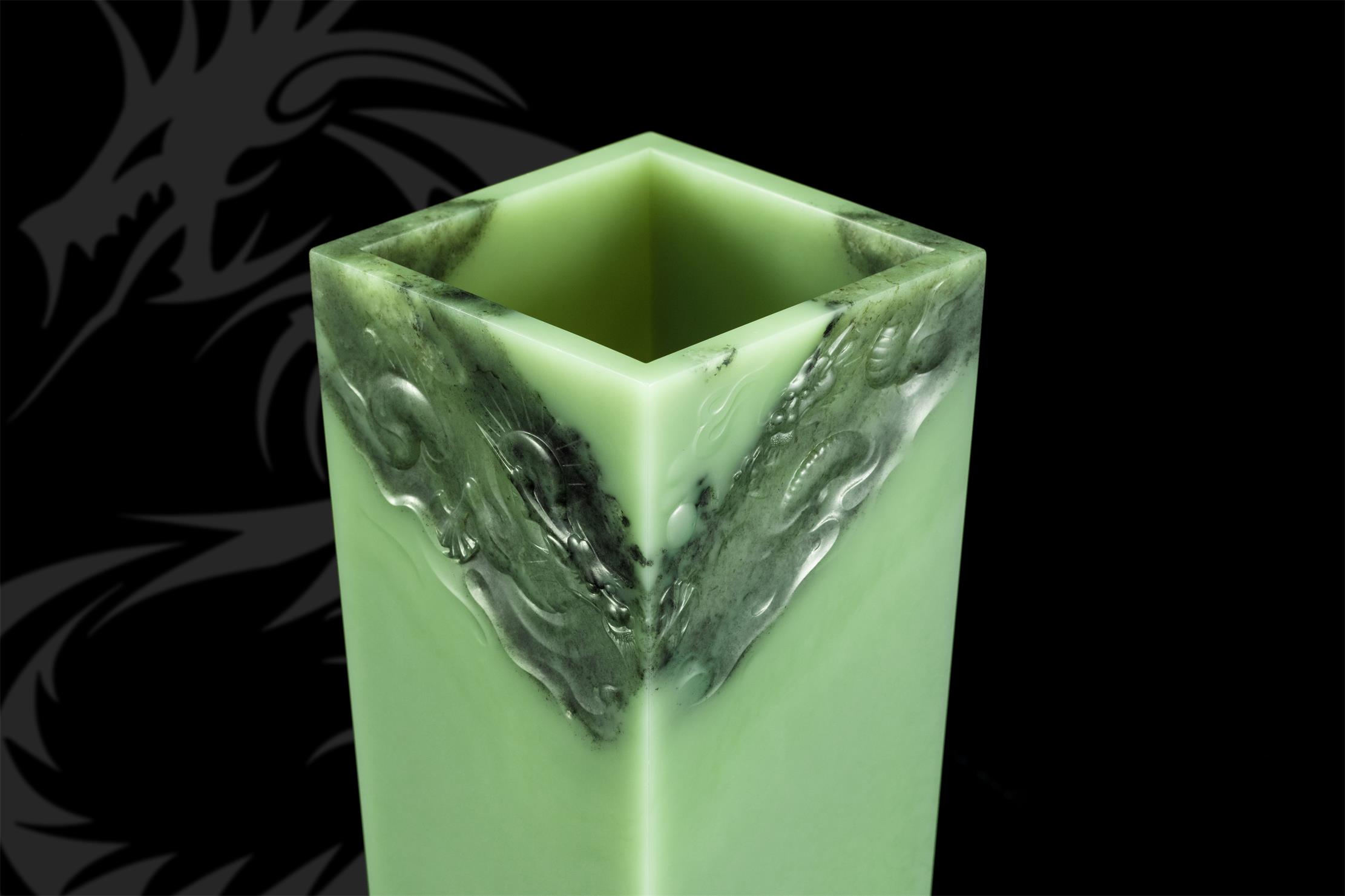 此长方形尊,乍看线条简单,四方笔直,干净的玉肉不做任何雕饰,只在尊口的两个斜角对称沁面上,雕刻两条在云端相对腾舞的巨龙,实则创作难度极大!